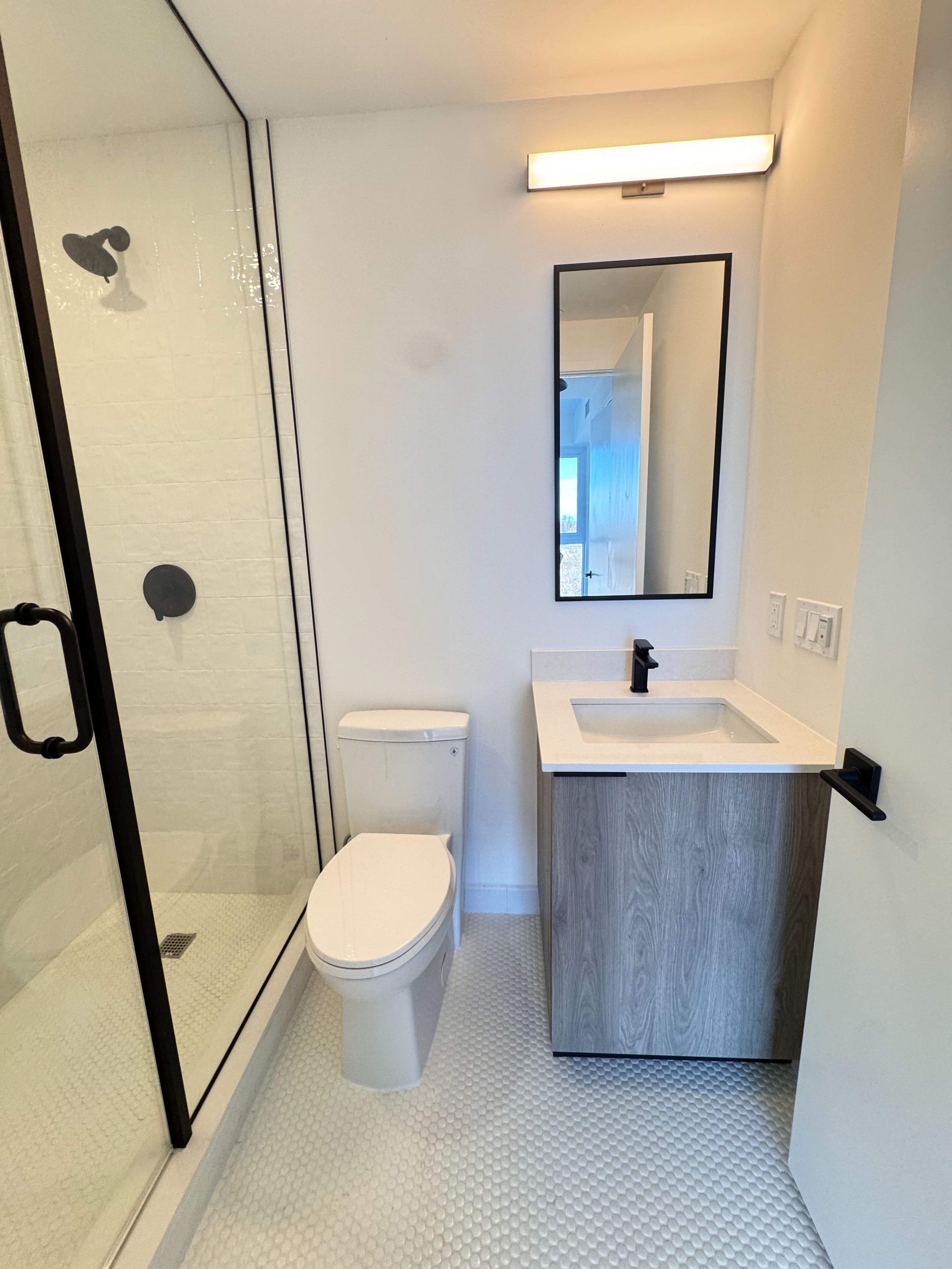 • Building amenities include a pool, fitness center, and co-working spaces.
