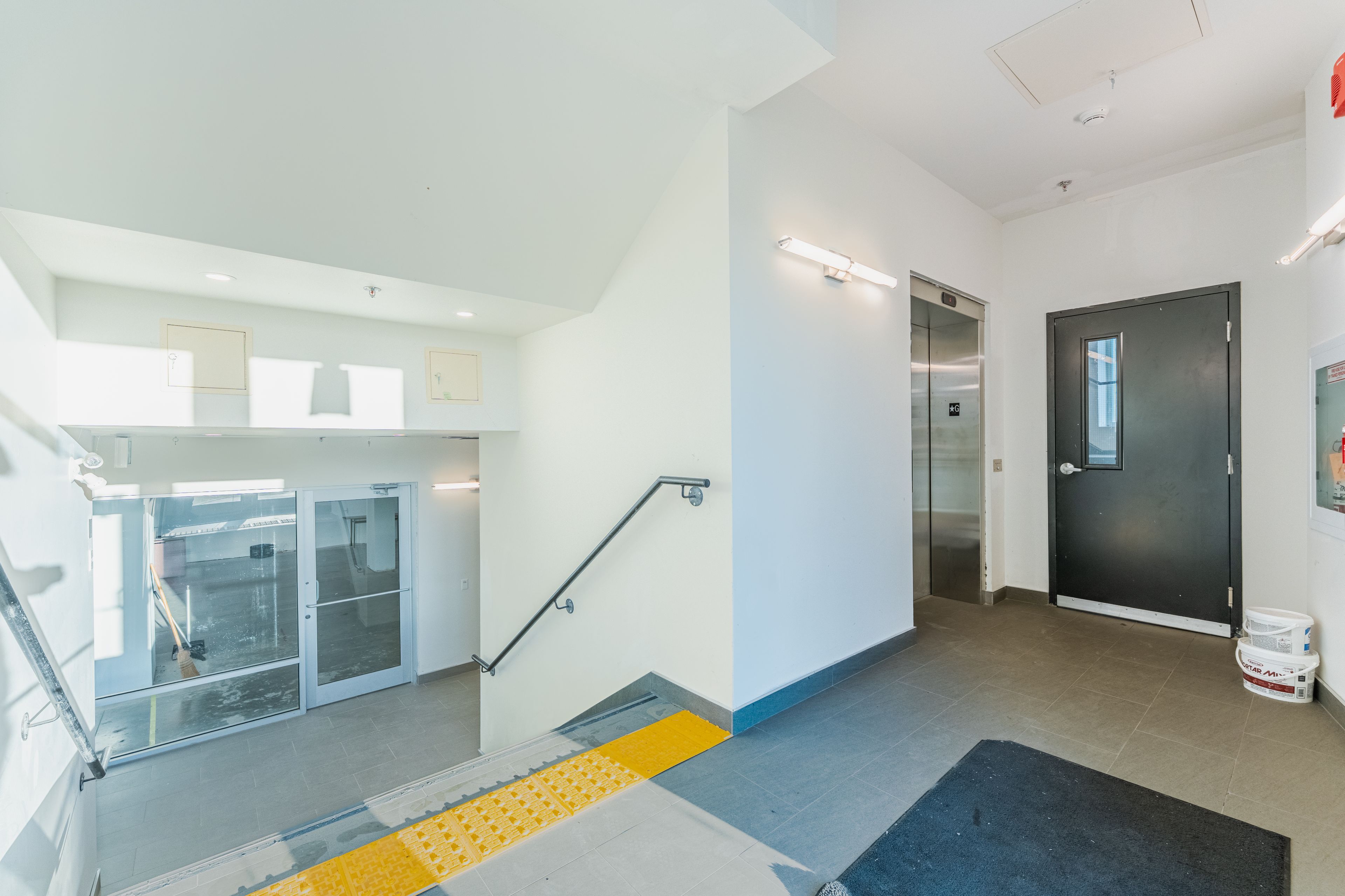 • Large windows providing natural light and an accessible elevator.
