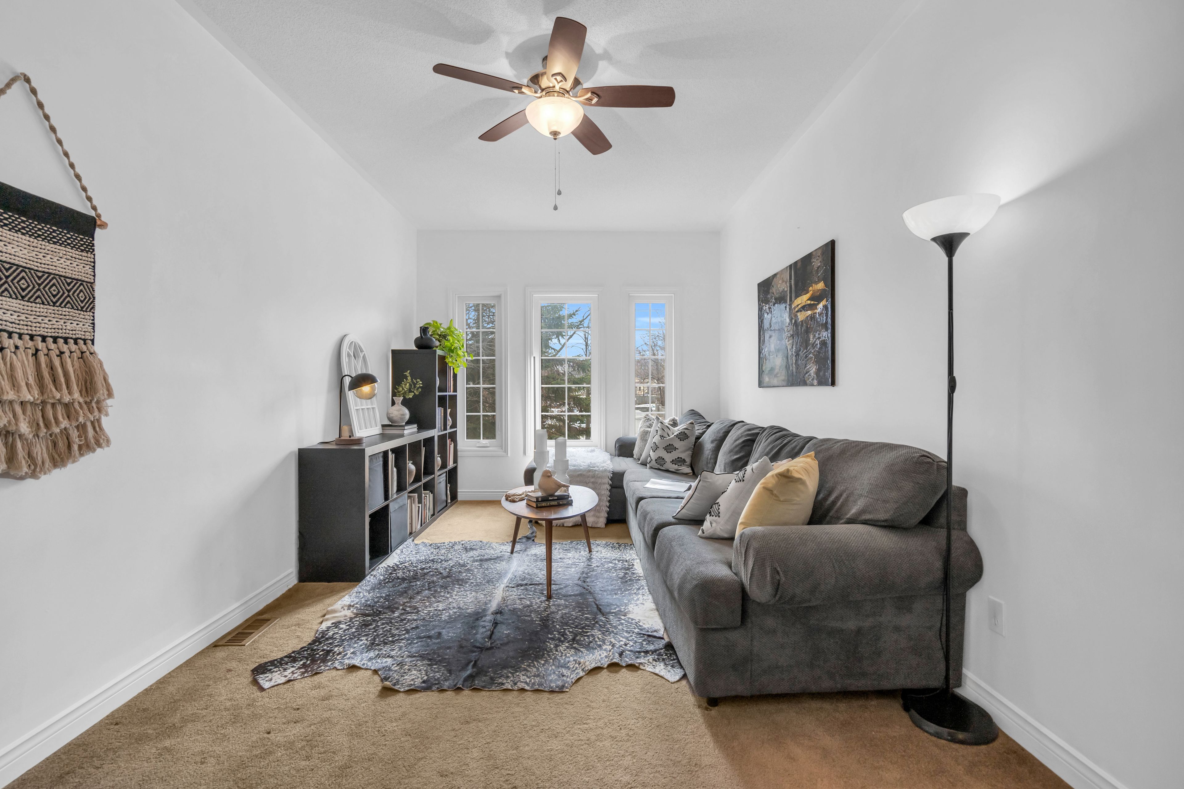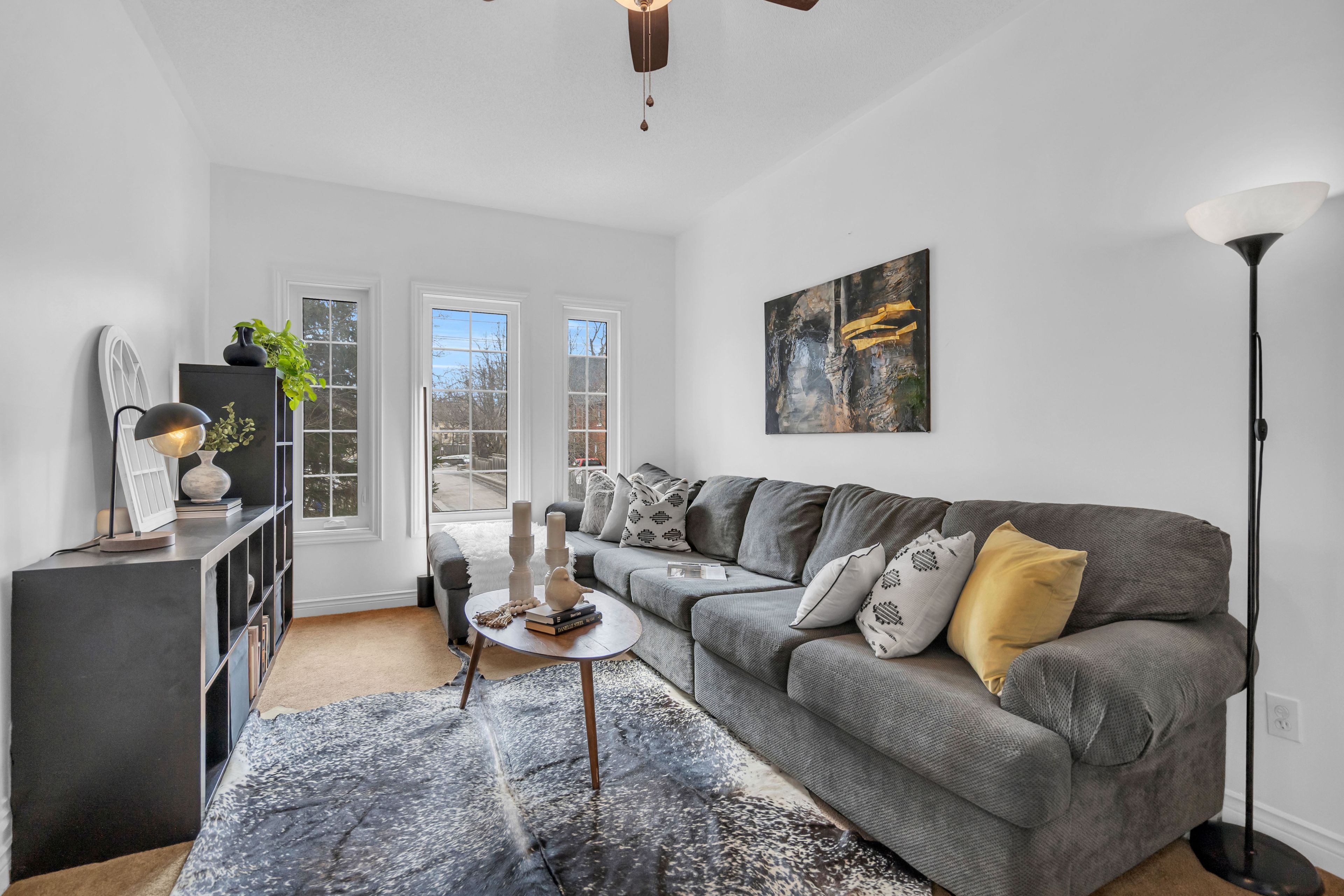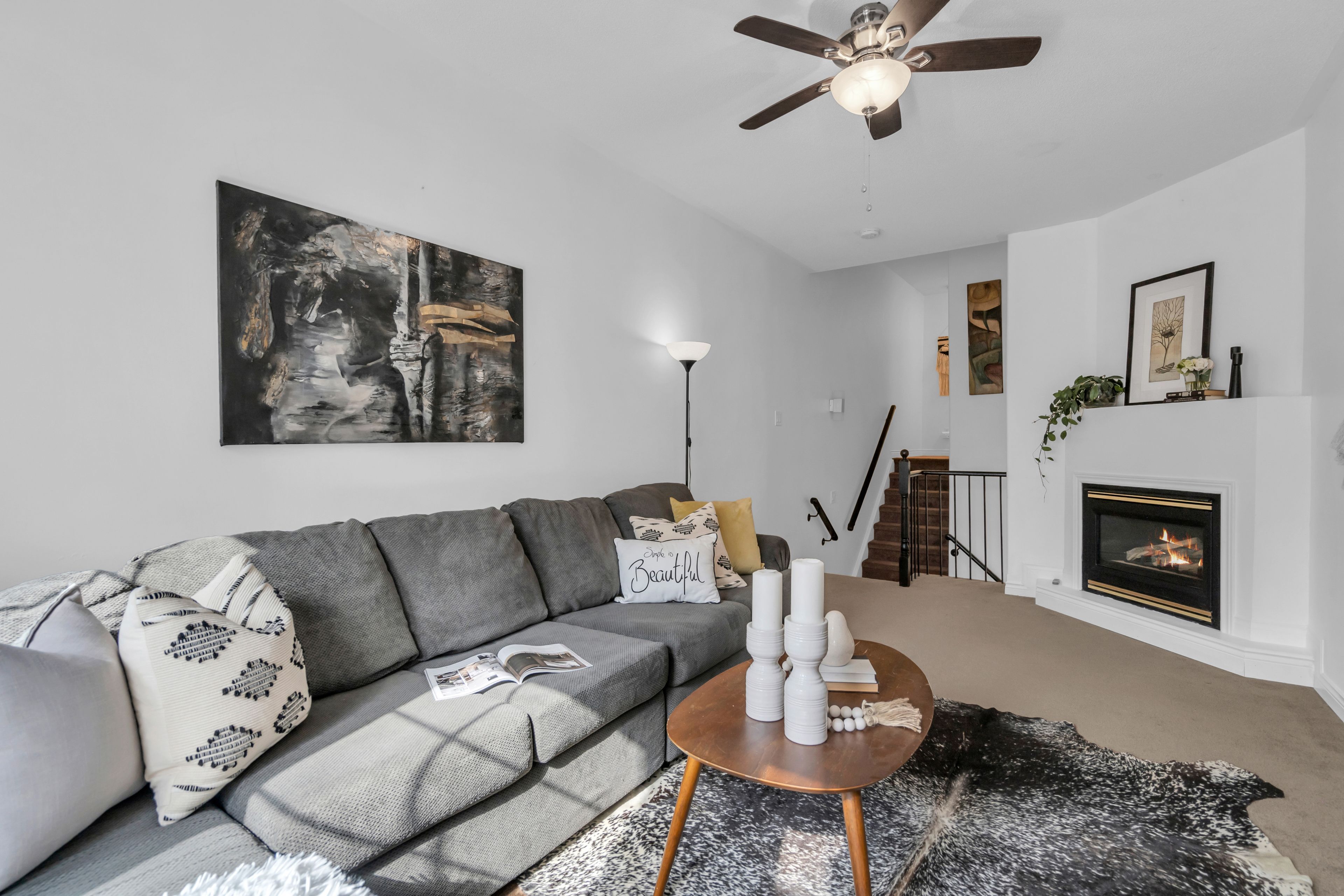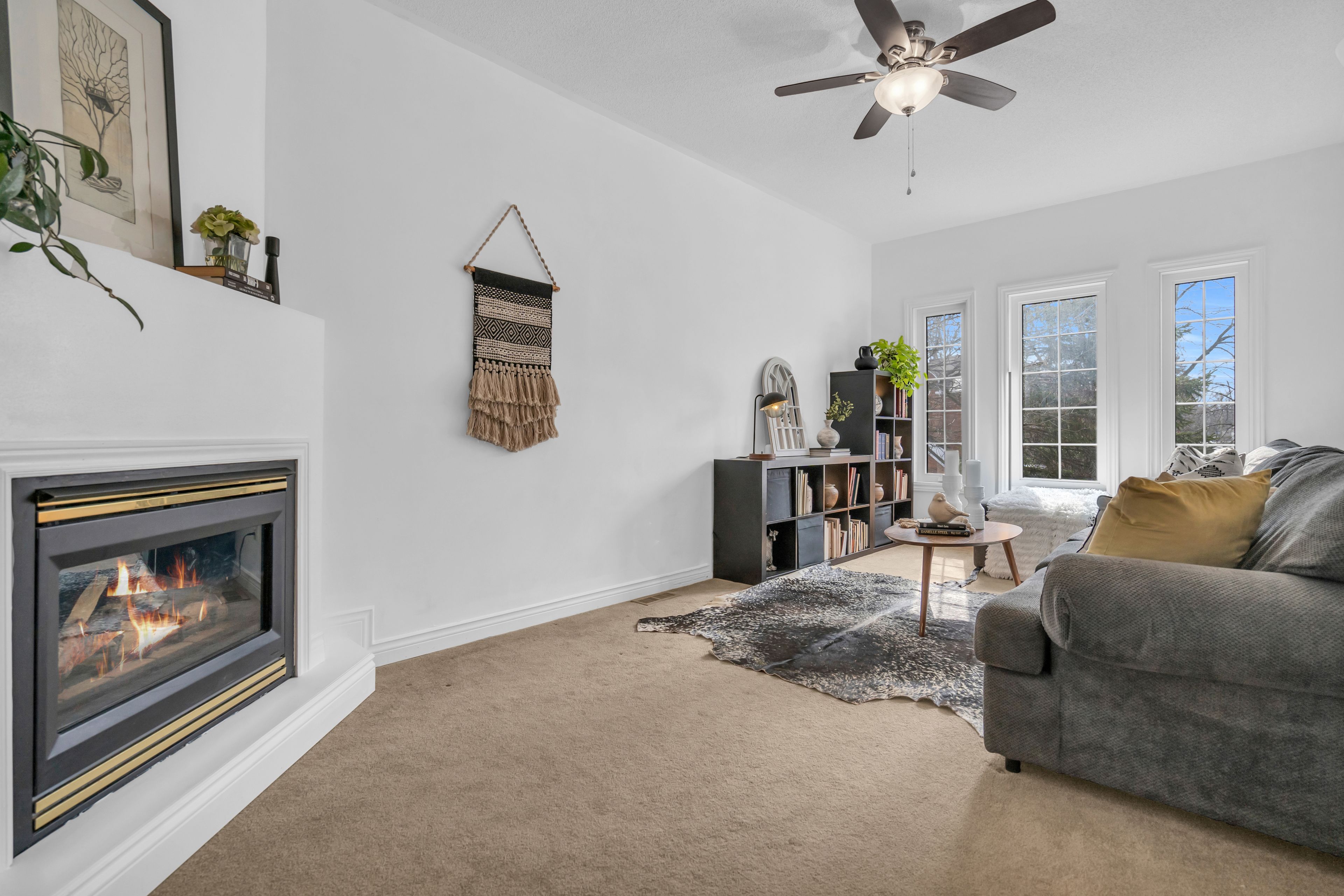 • Cozy living room with large windows and a gas fireplace.