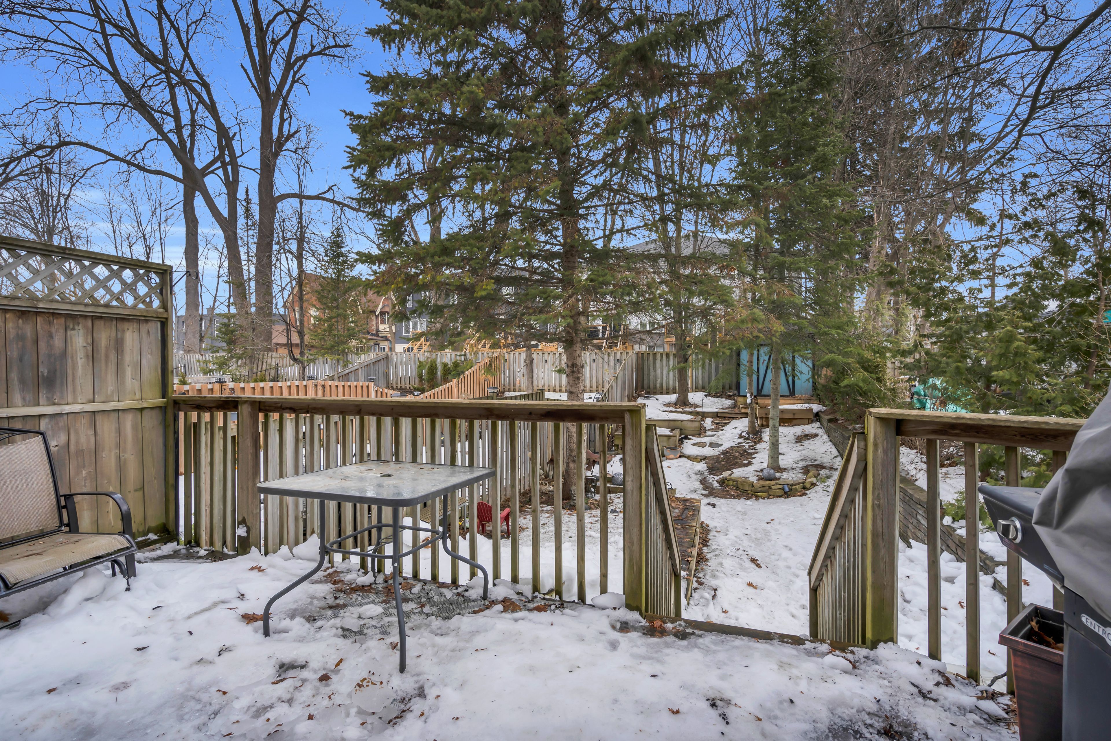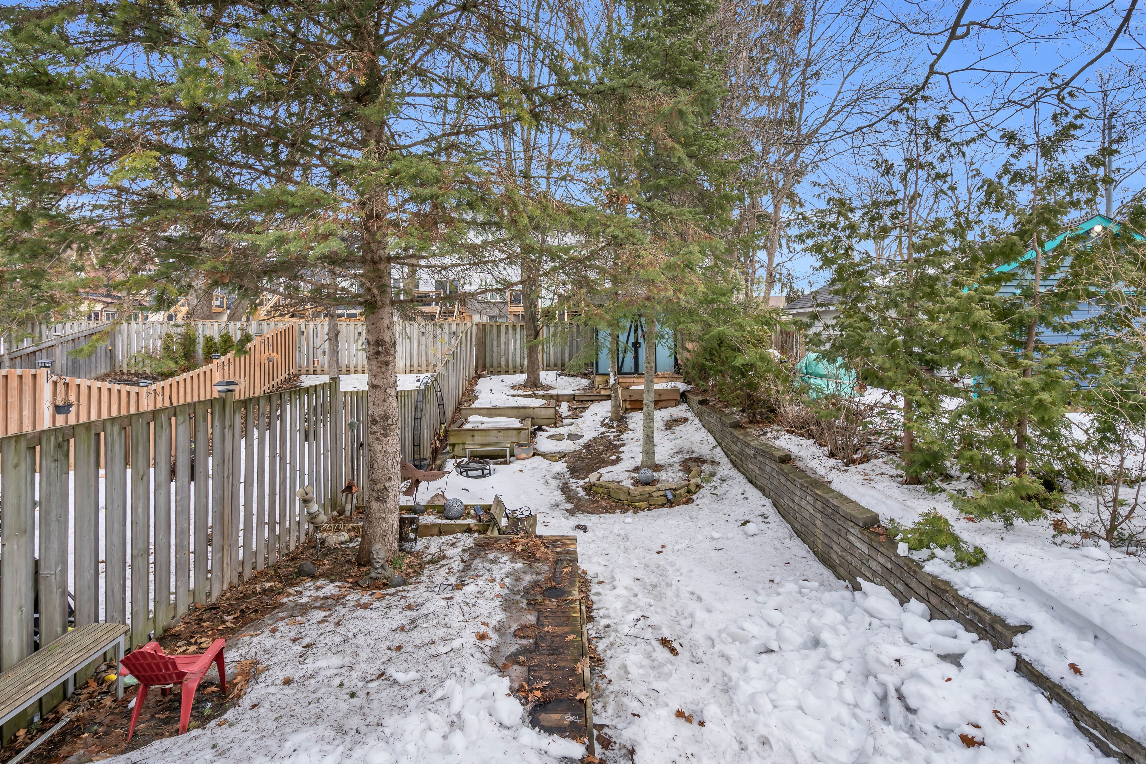 • Large backyard with deck, garden area, and mature trees for privacy.