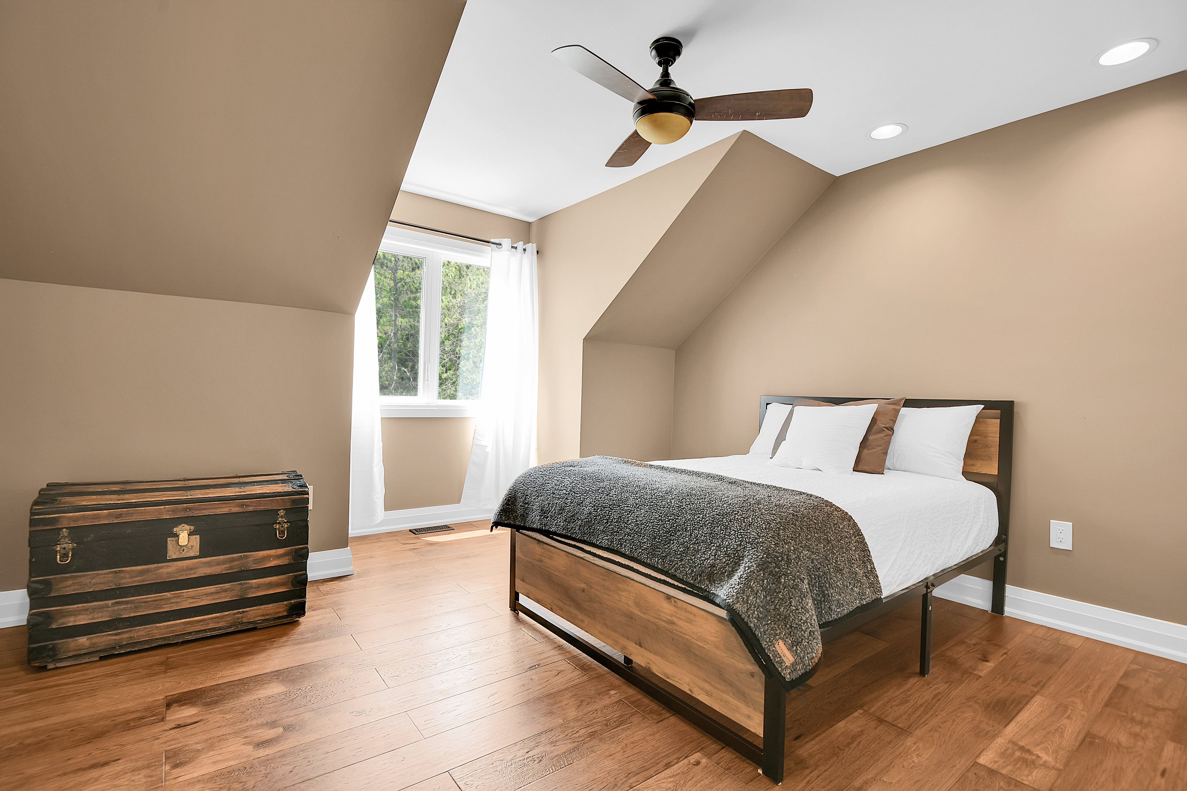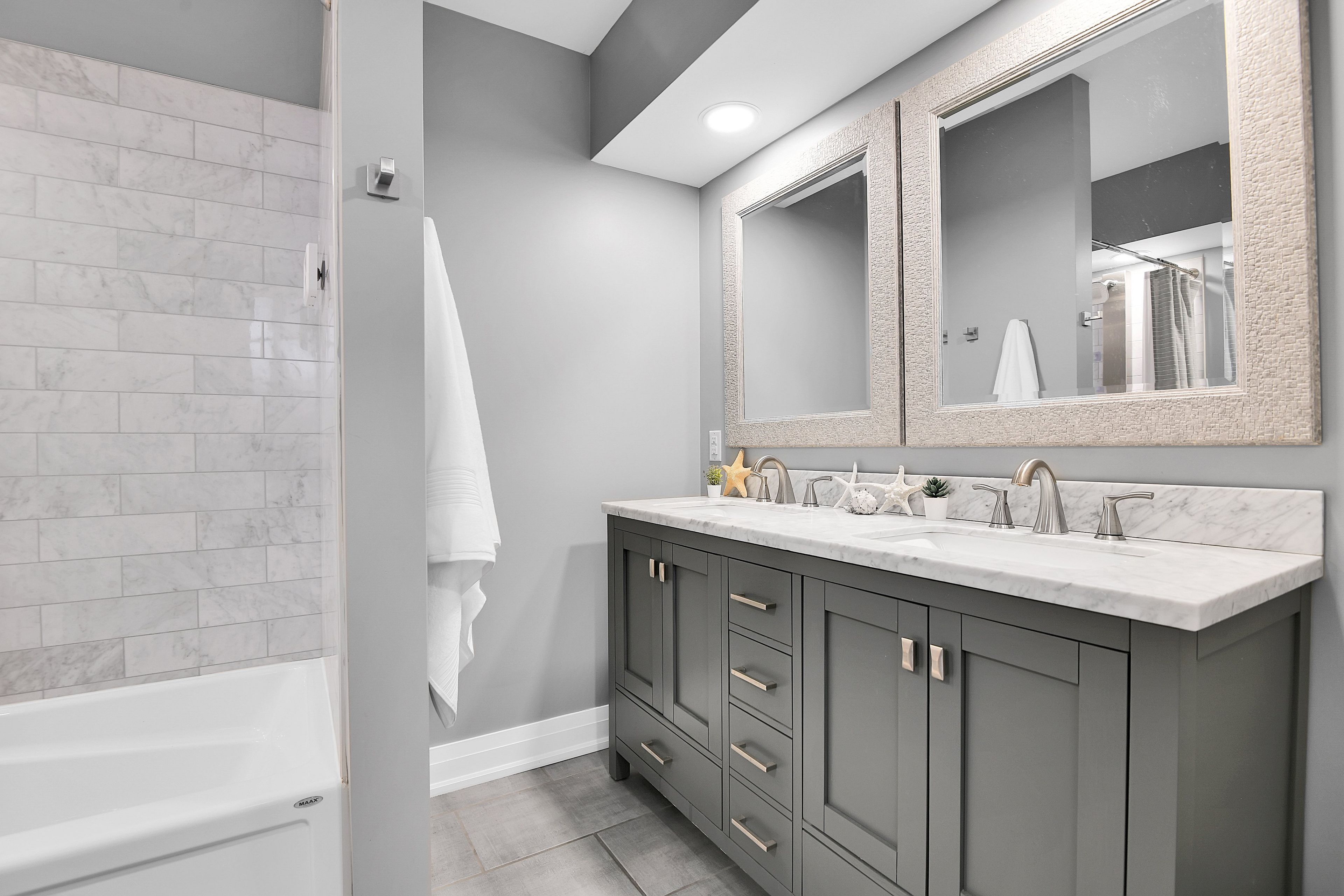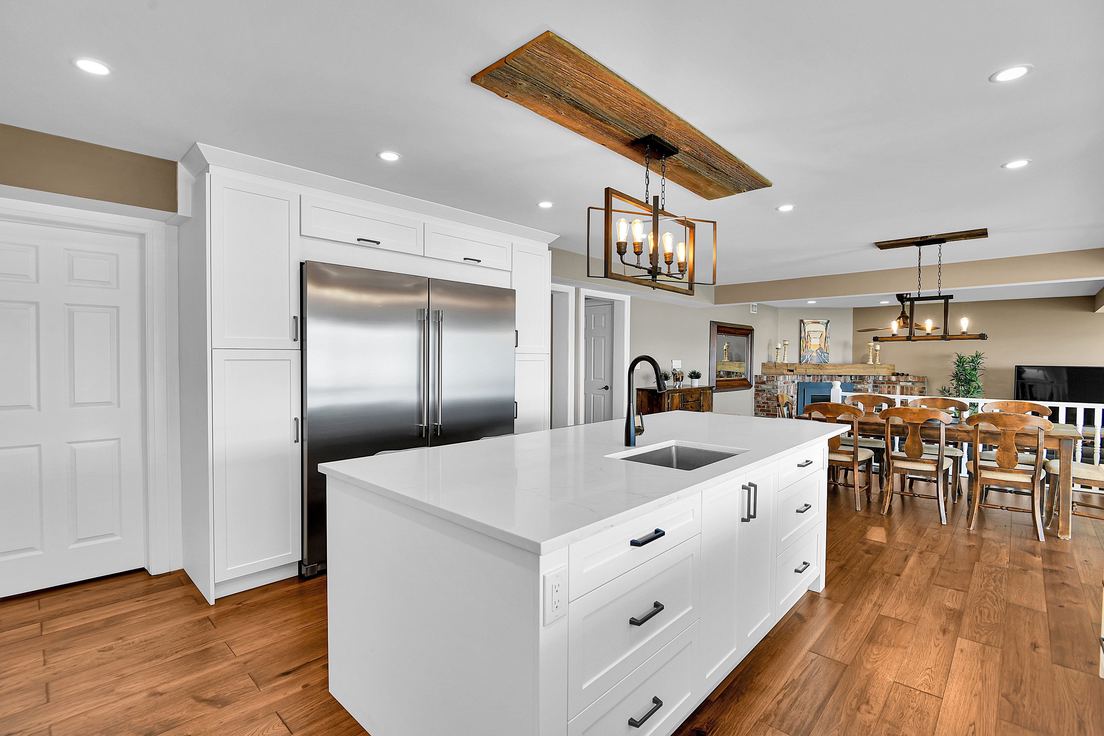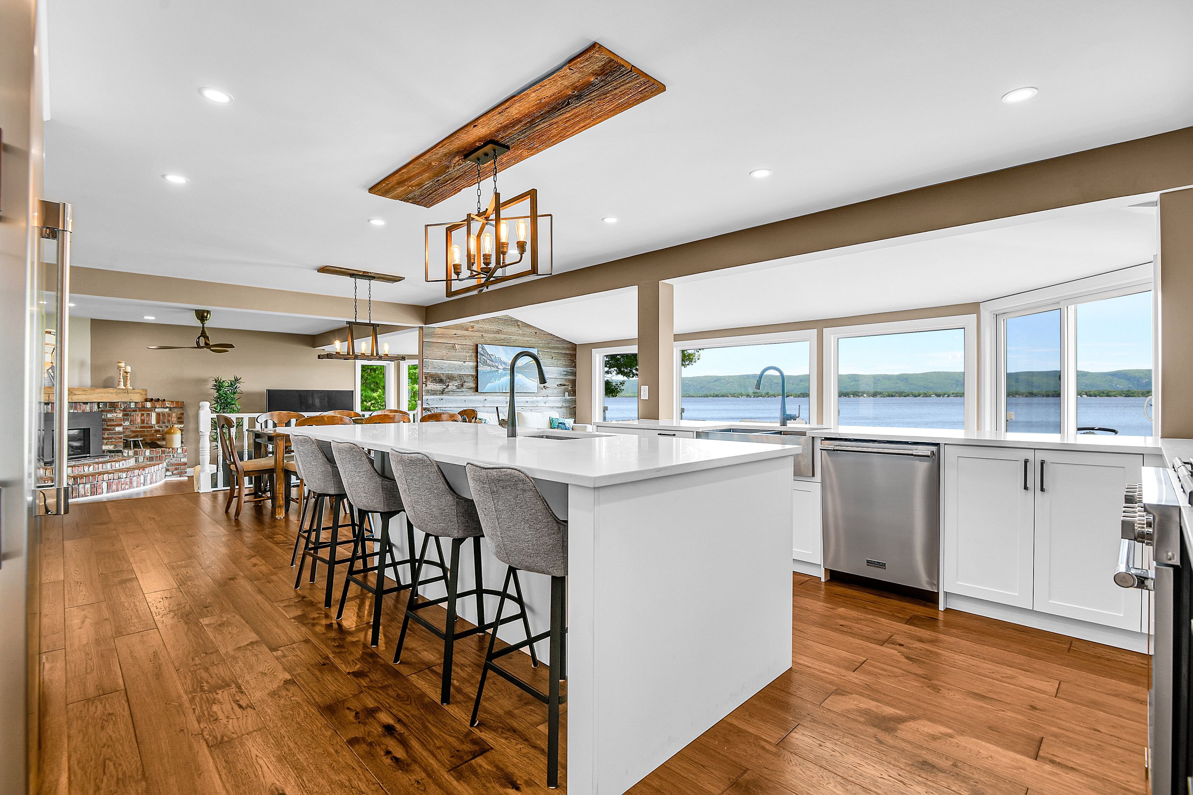 • Rustic features like hickory floors and barnboard accents enhance the beach vibe.