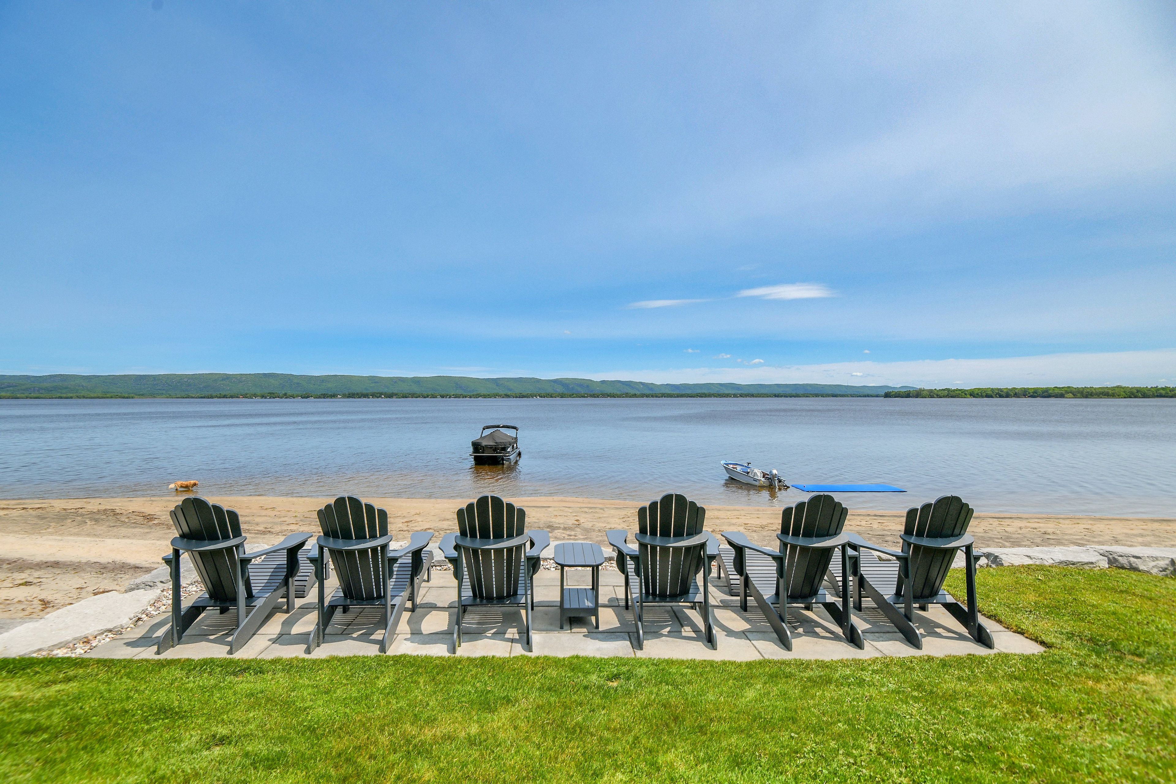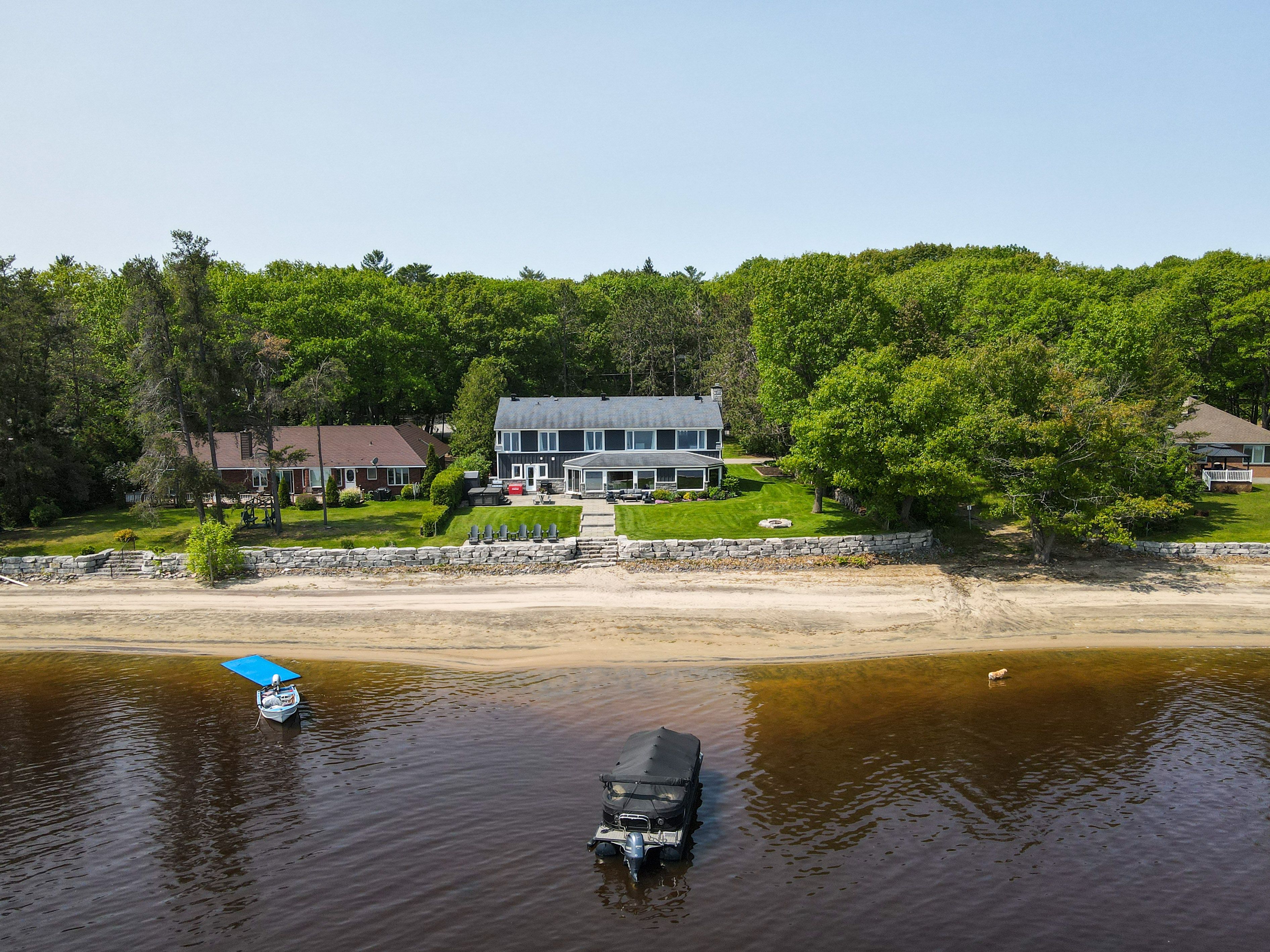 Stunning cape cod style luxury beach house! Now this is a lifestyle beyond compare. You don't need to wait for summer. Year round activities include skating, ice fishing, snowmobiling in the winter months. Every detail of this property has been updated to suit the most discerning buyer. The scale of this home has each living area spacious with no compromises. The open concept designer kitchen, dining area, family room and living room are entertaining size yet feel so comfortable and welcoming. Huge windows in all primary rooms capture the ever changing views of the bay, the river and the gatineau hills. Naturally sourced hickory floors, aged barnboard accent wall, ancient timber mantelpiece are all a nod to the rustic beauty of this beach front property. Sit by the bonfire and enjoy the manicured lawn and gardens with friends and family. The four bedroom main house is perfect for family and for overnight guests. Primary suite has a sumptuous ensuite bath with huge shower and a walk in closet set up for any city girl. Three additional bedrooms share a spacious renovated bath. A separate suite with its own private washroom, living/dining and kitchen plus bedroom area has many possibilities: nanny suite, in-law suite, guest rental, private guests. Elevated lawn leads to a natural retaining wall and stone steps to the beach. This is a truly unique opportunity on 100 feet of privately owned beach, not in a flood plain. Year round activities include boating, kayaking, fishing, skating, cross country skiing, snowmobiling and more. Walk to the local pub for live music. This is the art of living.
