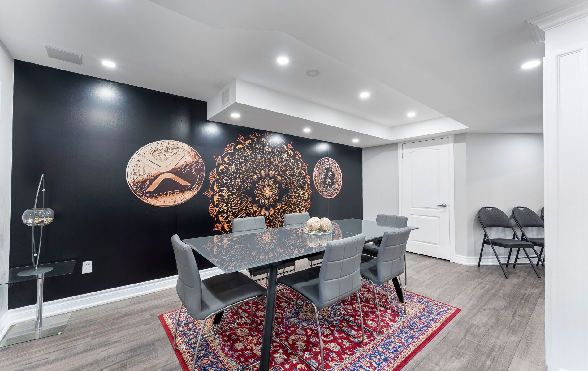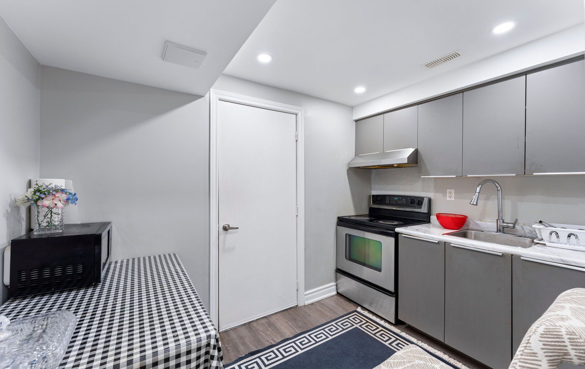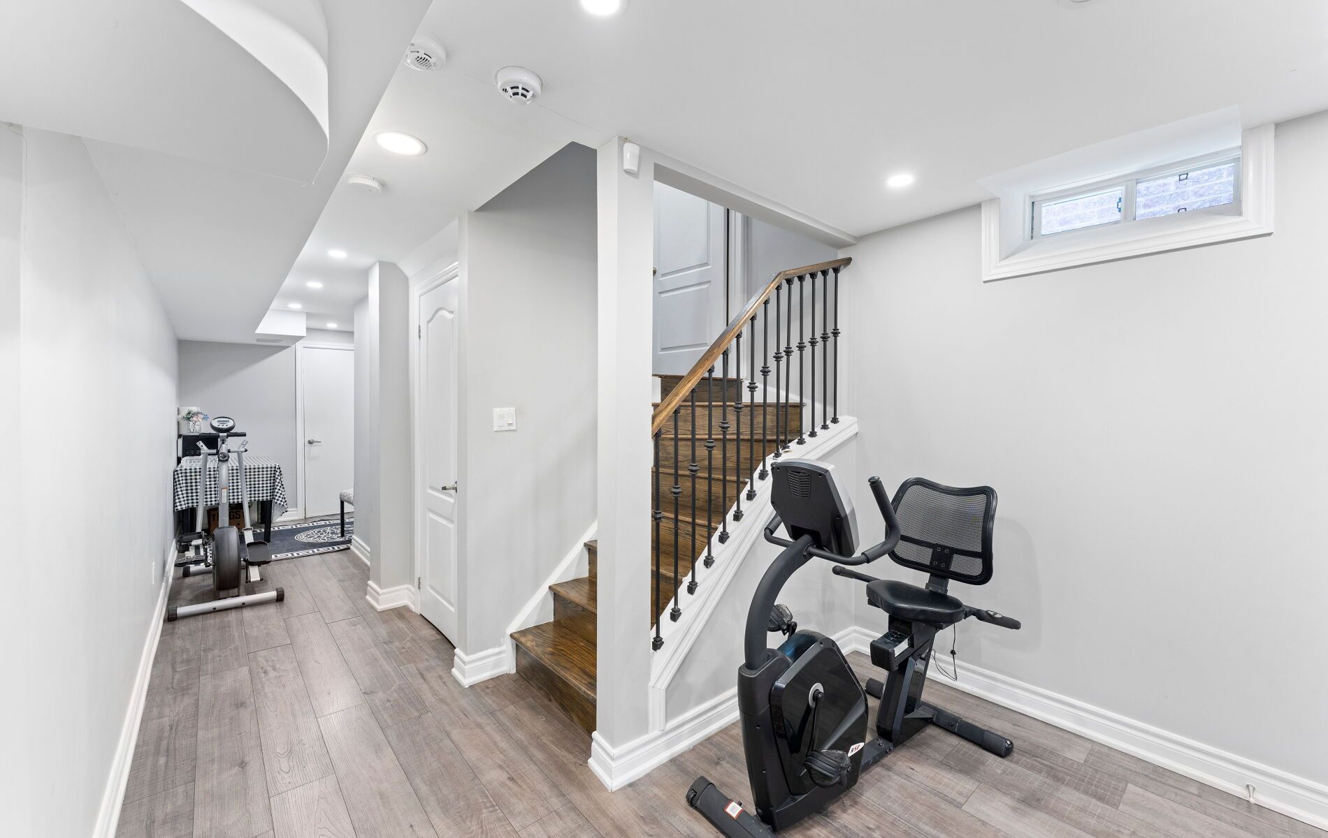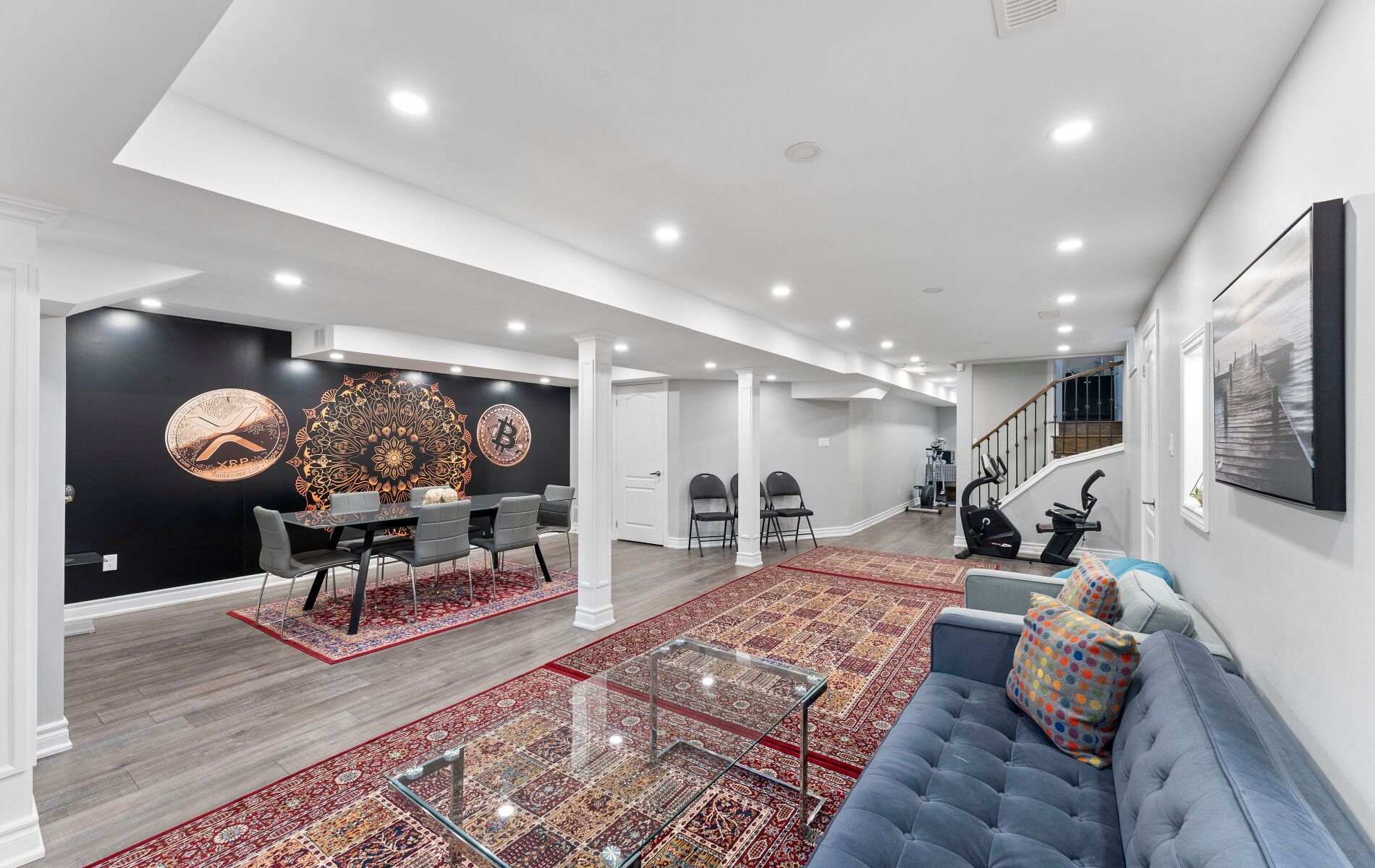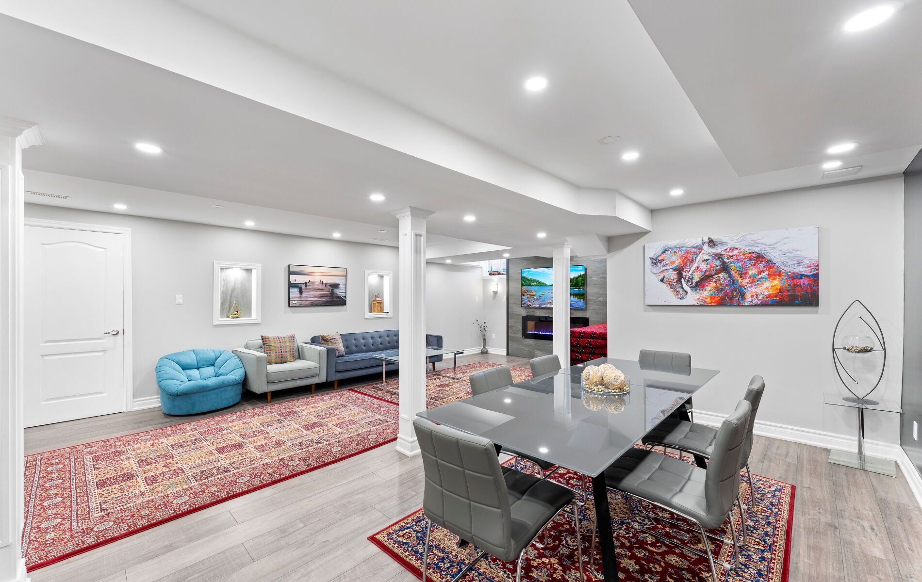 • Fully finished basement with a separate kitchen and custom fireplace.