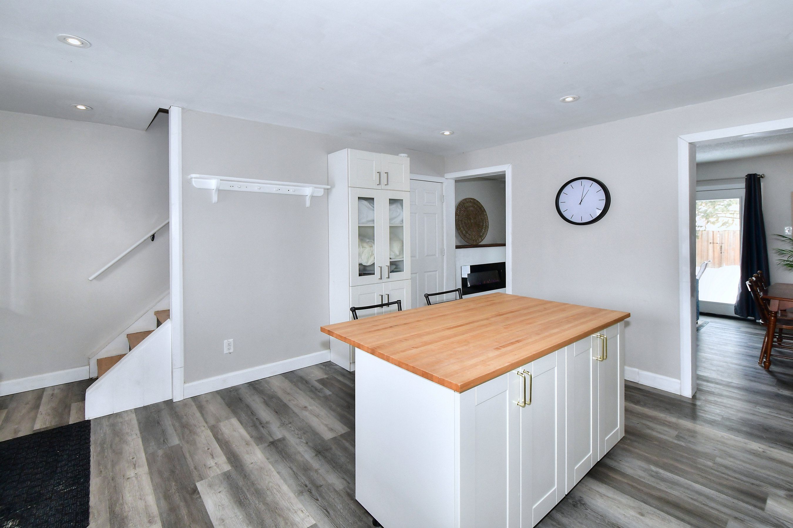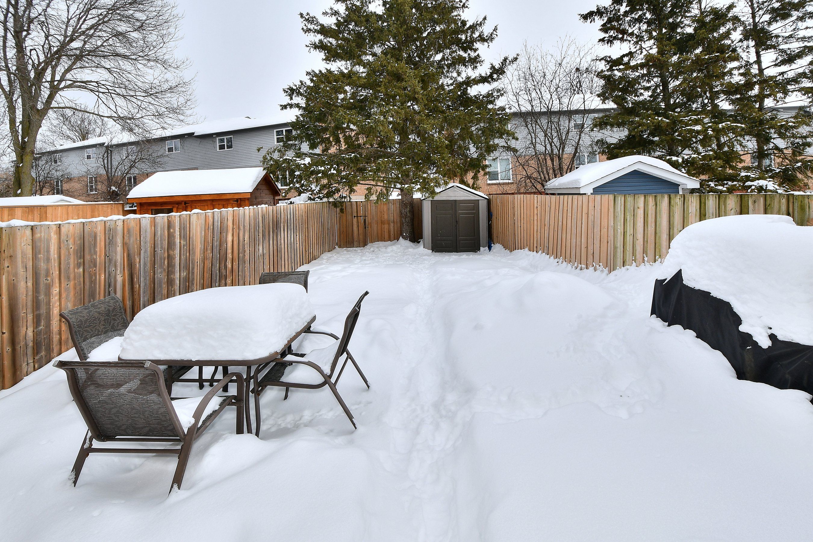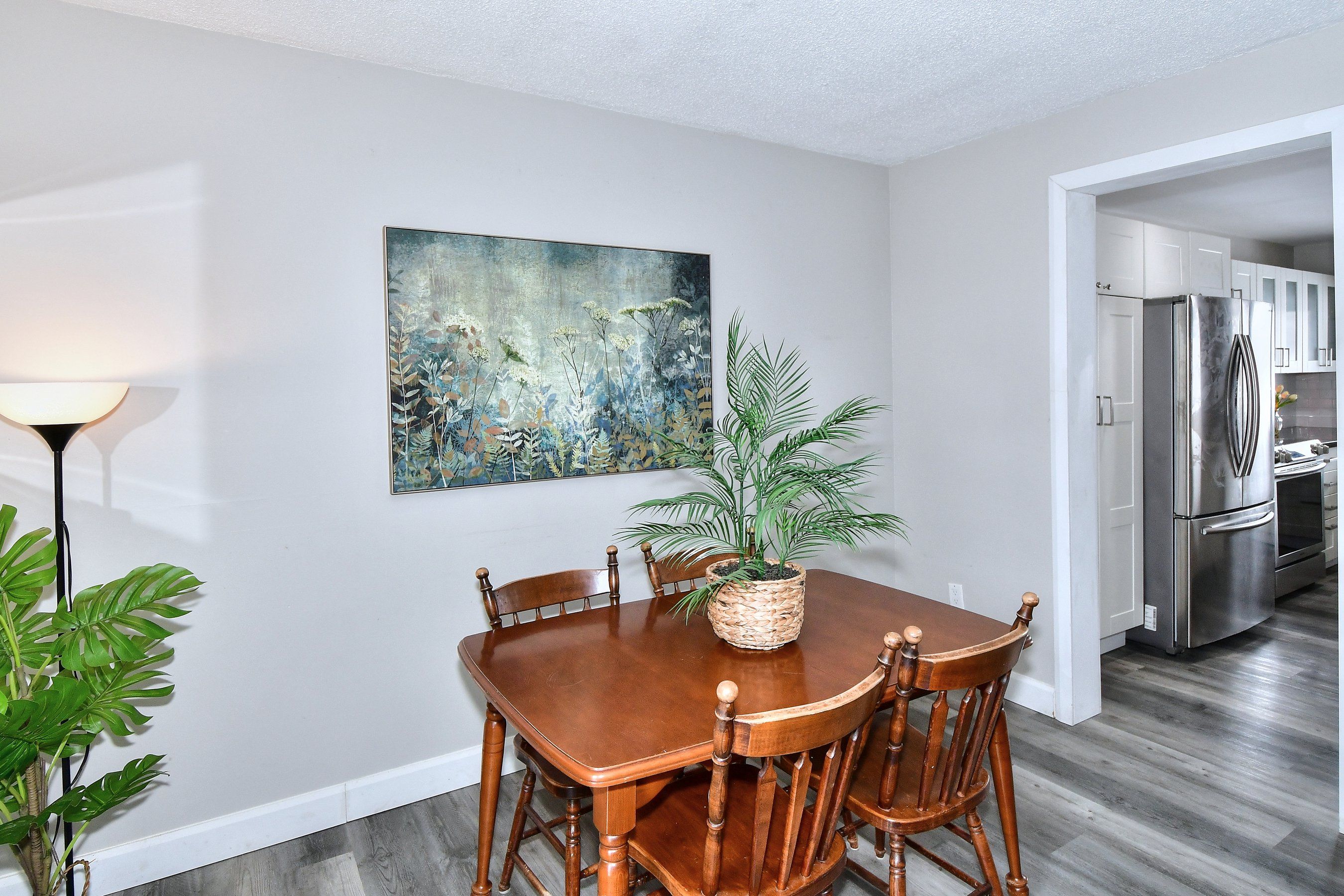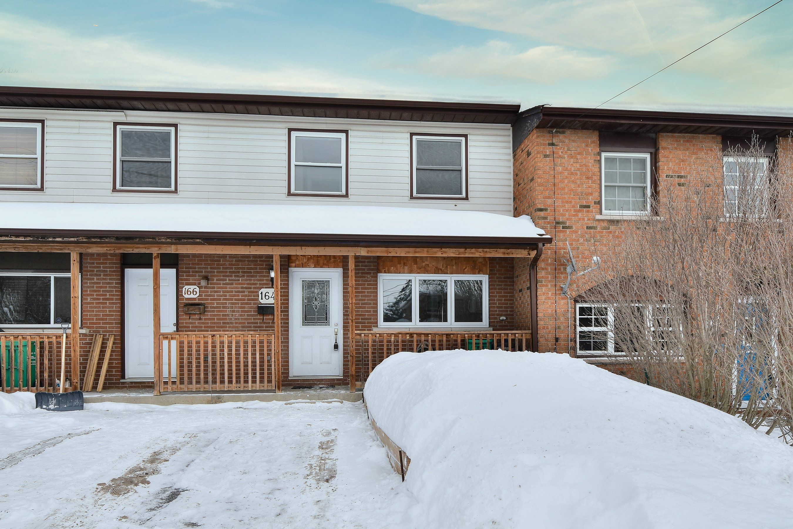 Exceptionally well maintained 3-bedroom freehold townhouse, no condo fees, perfect for first-time buyers looking to enter the market. This bright and spacious home features a large eat-in kitchen with ample cupboards and counter space, updated in 2022 along with new lvp flooring on the main-floor, refurbished hardwood on the second level, and new fridge and dishwasher. Hardwood floors run throughout the main and upper levels, and the living room offers a walk-out to a deck and privacy-fenced yard. The lower level includes a mostly finished rec room and utility room. Recent 2025 updates include new rear yard window and door trim and new eaves troughs. Many additional extras-don't miss this opportunity.