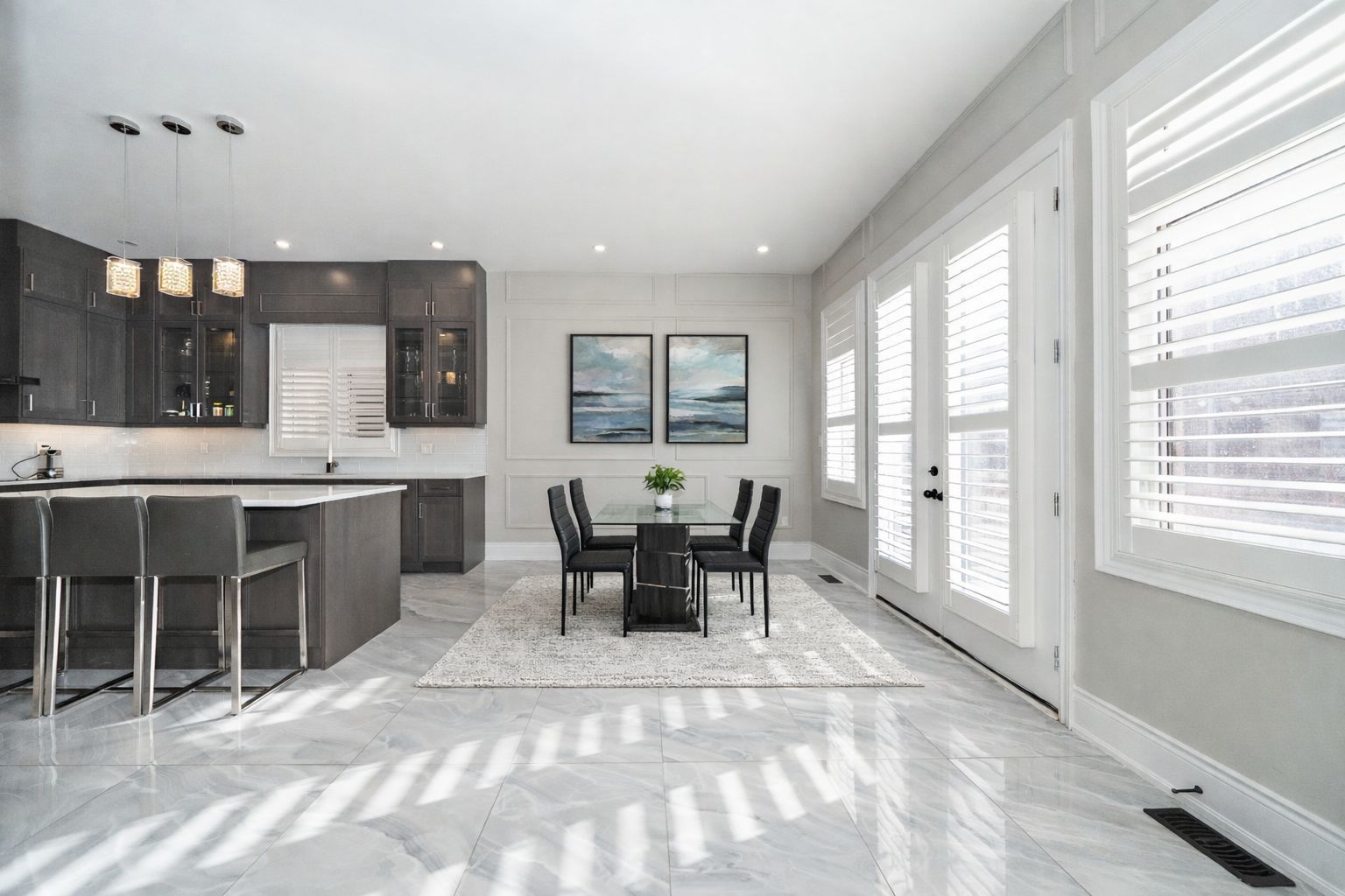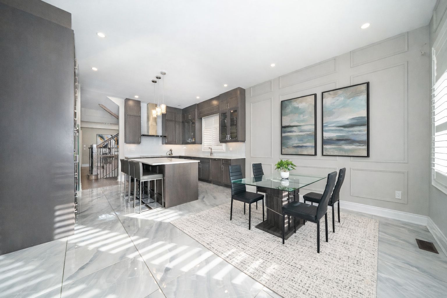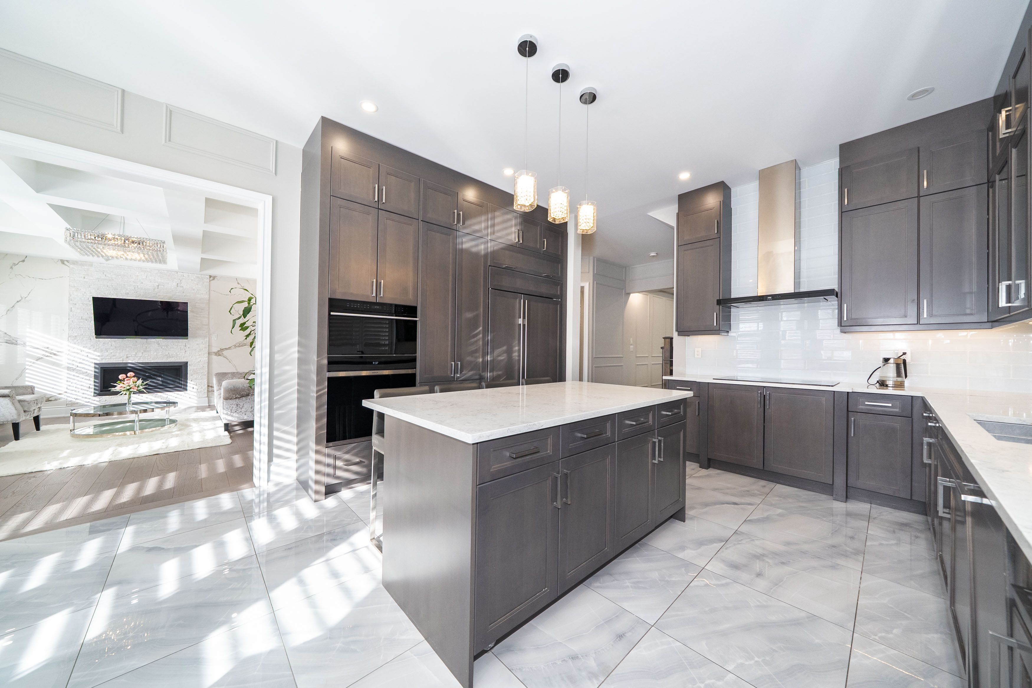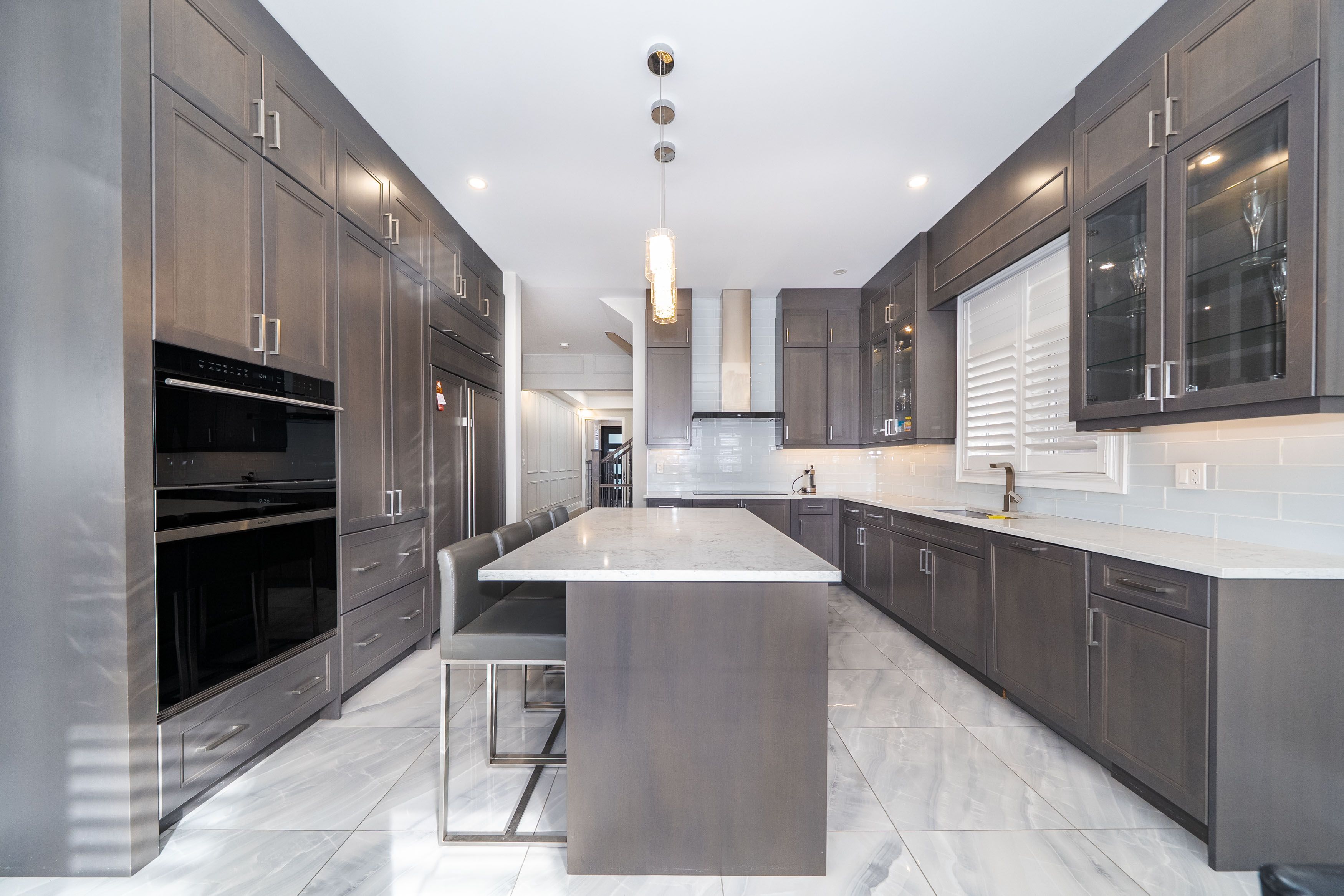 • Stunning kitchen features custom cabinetry and a large center island.