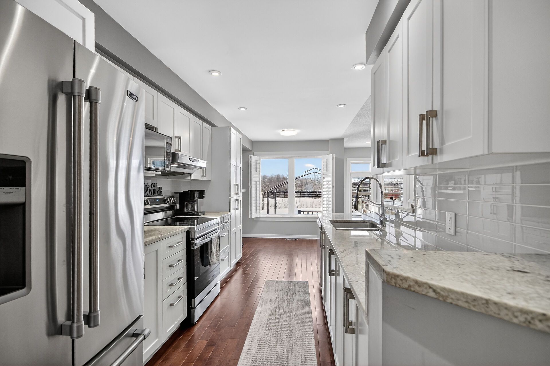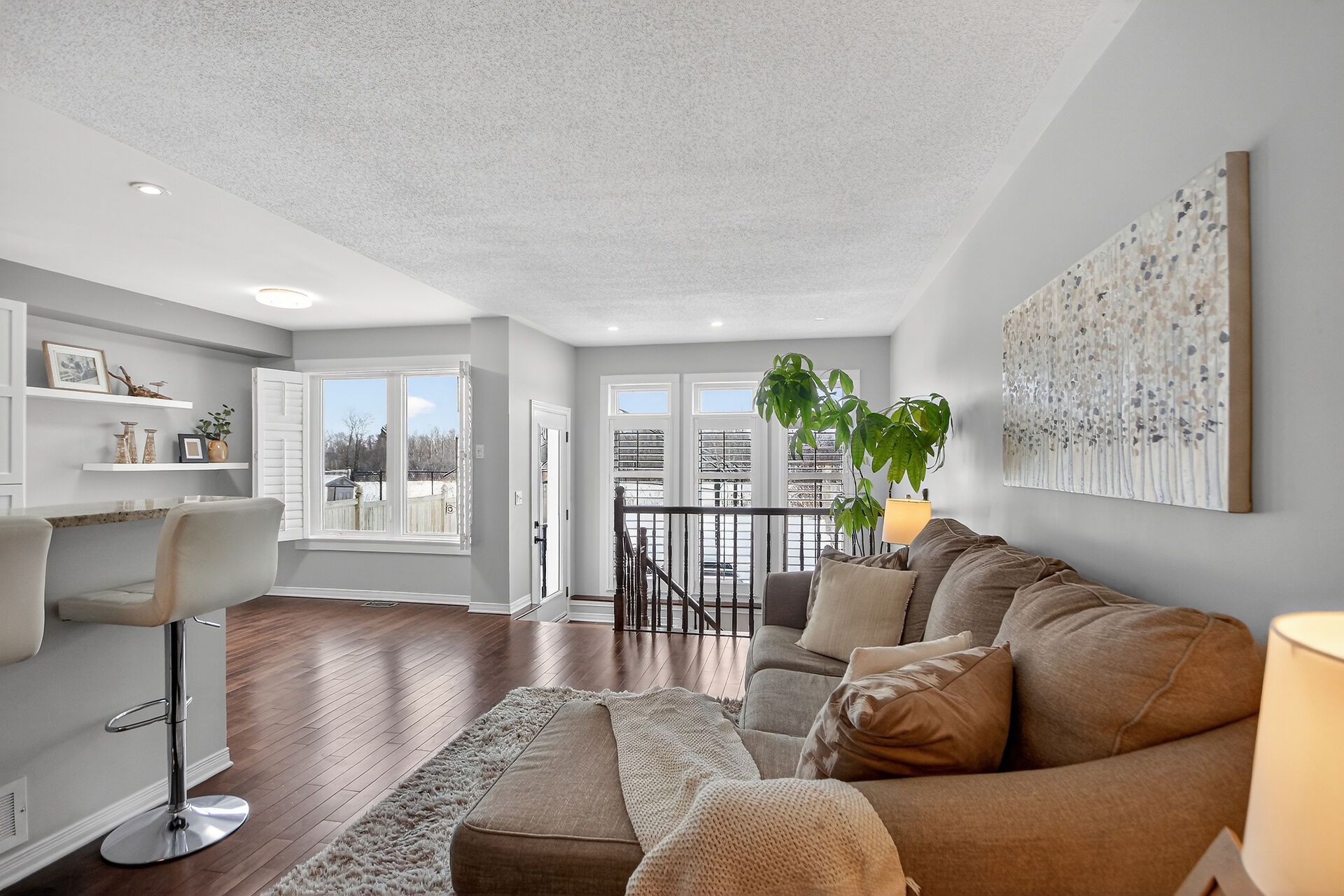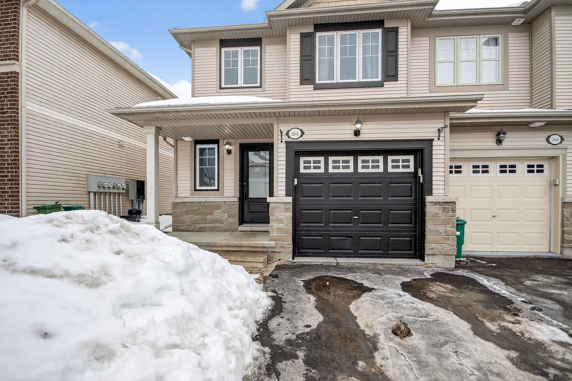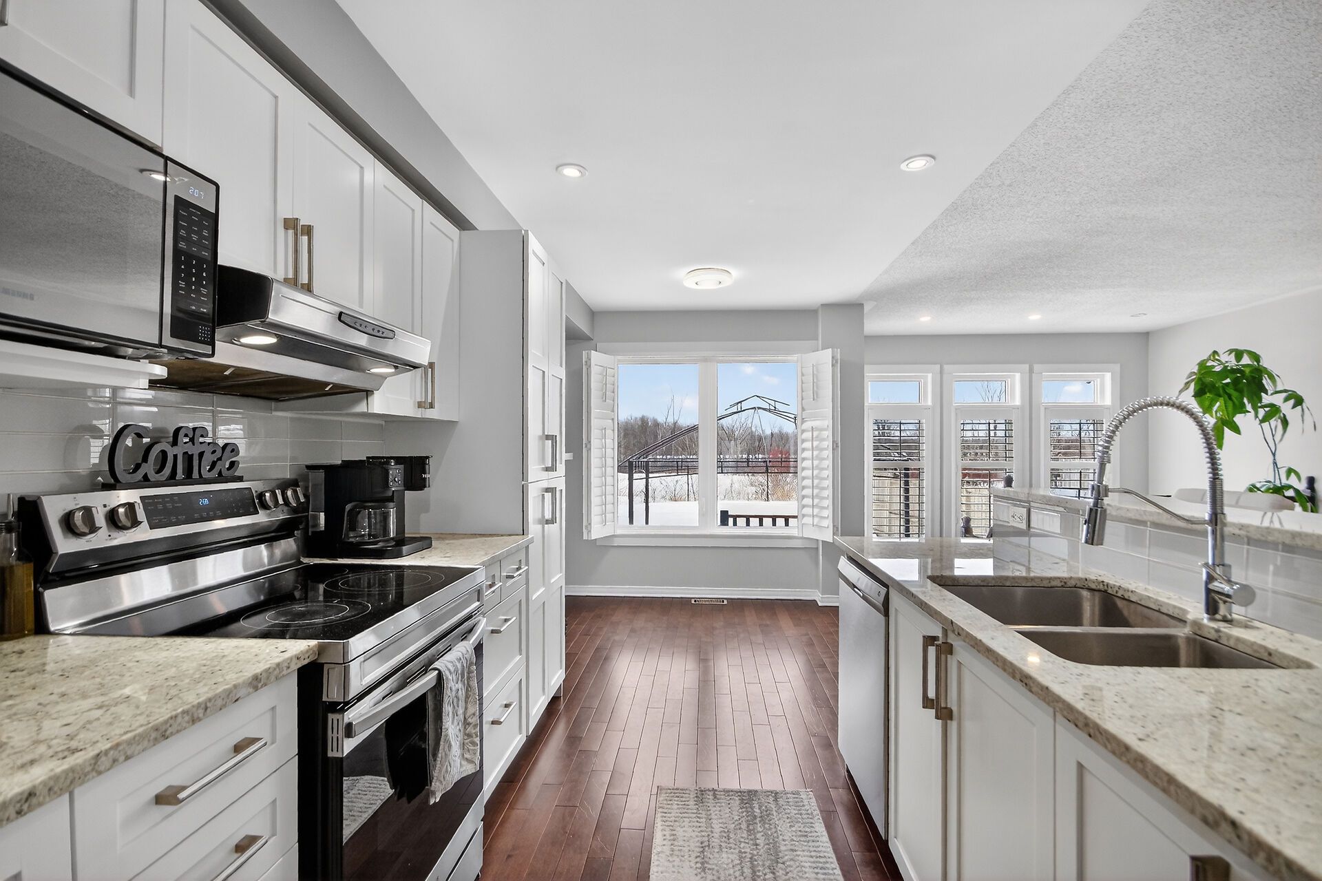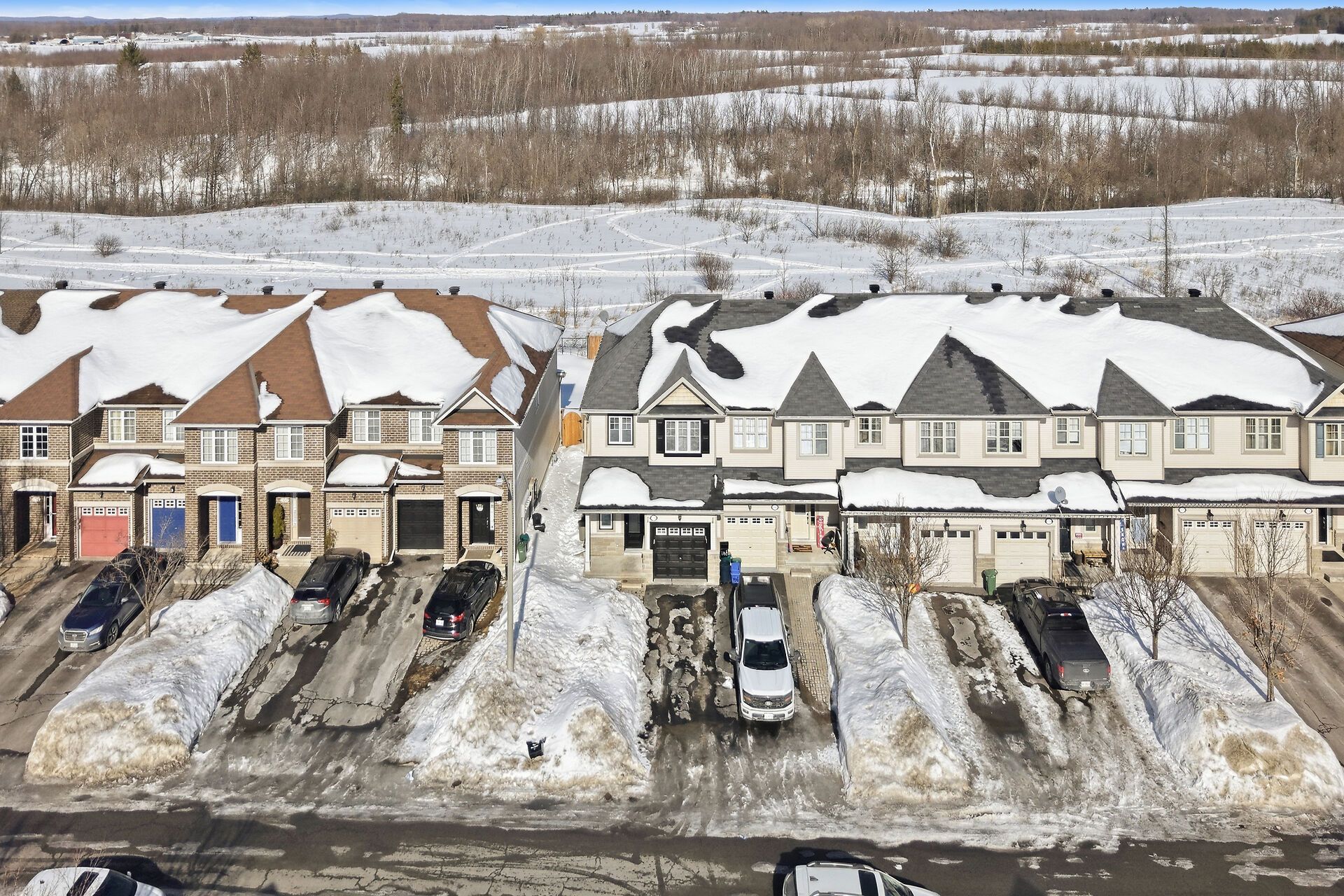 Enjoy inspirational lifestyle living in this luxurious end unit townhome with no rear neighbors nestled in the sought-after community of east village in orleans. Located minutes from high-rated schools, parks, shopping, and the renowned millennium sports park. This luxurious townhome combines comfort, space, and convenience is perfect for families or first-time buyers. No rear neighbors means added privacy and serene views, making this home stand out from the rest. Inside, you'll find luxurious finishes and spacious living spaces that features 3 good size bedrooms, 2 1/2 bathrooms, and a partially finished basement - ideal for modern family living. The main floor showcases hardwood flooring and a bright, inviting living space layout. The luxurious kitchen features a pantry and includes "rich" granite countertops, beautiful glass tile backsplash and a generous breakfast eat-in area to quietly enjoy breakfast while overlooking gorgeous views of the green space behind your backyard - the elegant dining room features beautiful decor and a luxurious modern light fixture - the living room features a large wall of bright windows overlooking the breathtaking green space at the back of the townhome. The second floor features sparkling new laminate/vinyl flooring - a primary bedroom retreat that features a bonus room great as a private office or private study, walk-in closet, and a private ensuite bathroom "oasis" that features a soaker tub & separate stand up shower plus 2 good size bedrooms. The partially finished basement boasts quality laminate flooring and offers ample room for a home theatre, playroom, or another home office. The good size backyard features no rear neighbors and a good size deck. Special highlights include new carpet in both stairways, new laminate/vinyl flooring on the 2nd floor, all windows including the front & back door have been replaced. Don't miss your chance to own this beautifully maintained, move-in ready luxurious townhome/flexible possession