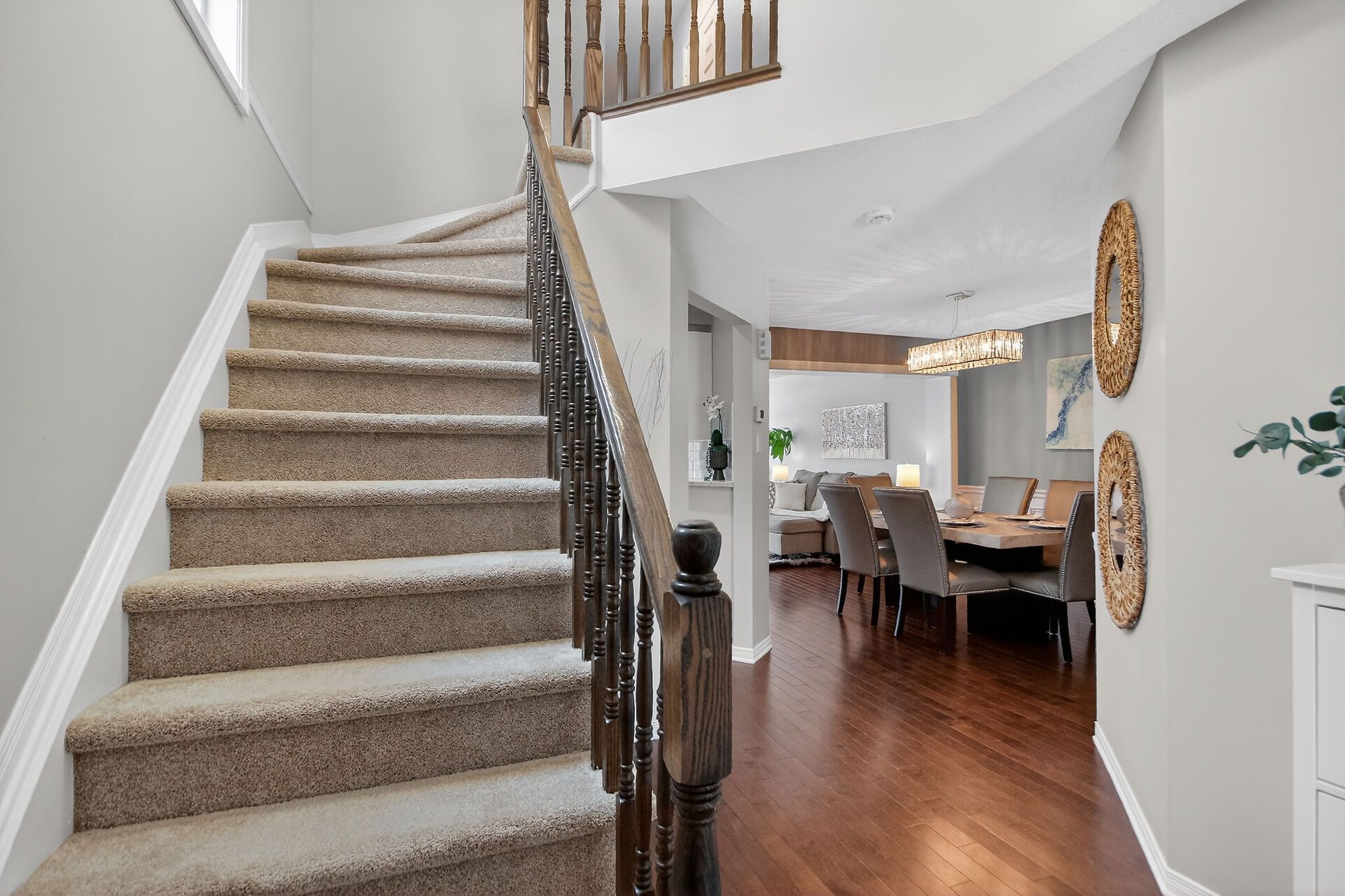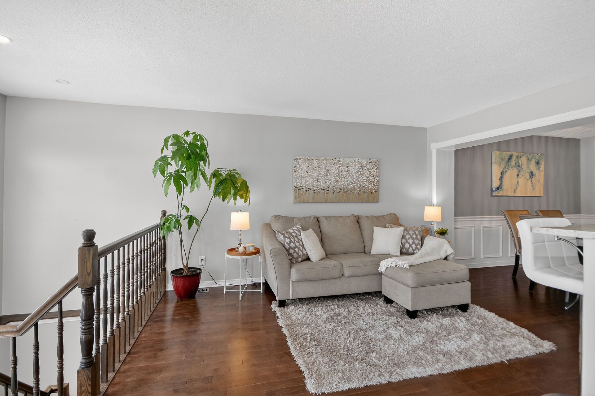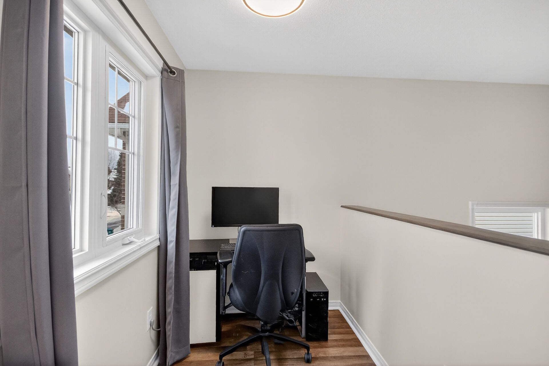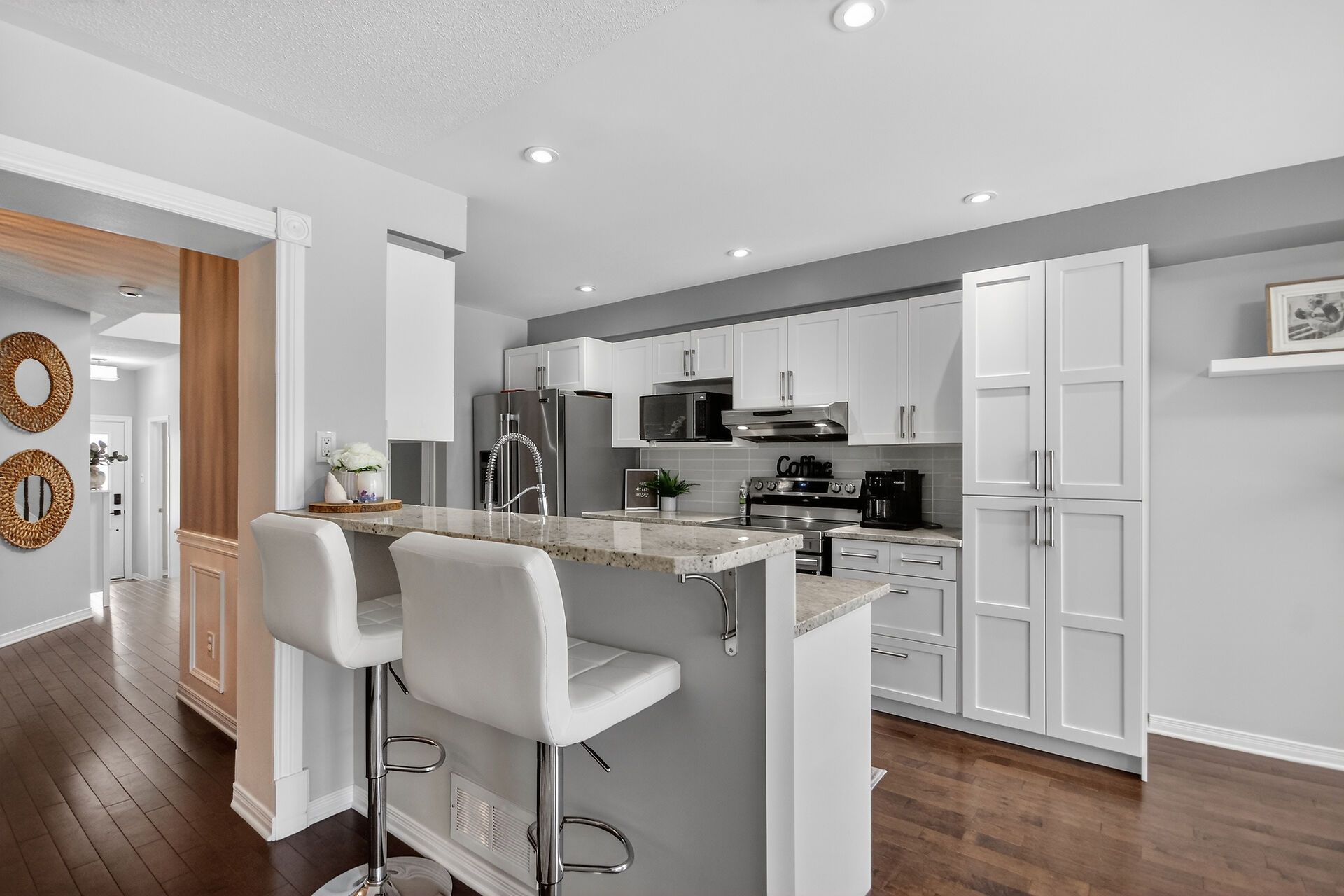Enjoy inspirational lifestyle living in this luxurious end unit townhome with no rear neighbors nestled in the sought-after community of east village in orleans. Located minutes from high-rated schools, parks, shopping, and the renowned millennium sports park. This luxurious townhome combines comfort, space, and convenience is perfect for families or first-time buyers. No rear neighbors means added privacy and serene views, making this home stand out from the rest. Inside, you'll find luxurious finishes and spacious living spaces that features 3 good size bedrooms, 2 1/2 bathrooms, and a partially finished basement - ideal for modern family living. The main floor showcases hardwood flooring and a bright, inviting living space layout. The luxurious kitchen features a pantry and includes "rich" granite countertops, beautiful glass tile backsplash and a generous breakfast eat-in area to quietly enjoy breakfast while overlooking gorgeous views of the green space behind your backyard - the elegant dining room features beautiful decor and a luxurious modern light fixture - the living room features a large wall of bright windows overlooking the breathtaking green space at the back of the townhome. The second floor features sparkling new laminate/vinyl flooring - a primary bedroom retreat that features a bonus room great as a private office or private study, walk-in closet, and a private ensuite bathroom "oasis" that features a soaker tub & separate stand up shower plus 2 good size bedrooms. The partially finished basement boasts quality laminate flooring and offers ample room for a home theatre, playroom, or another home office. The good size backyard features no rear neighbors and a good size deck. Special highlights include new carpet in both stairways, new laminate/vinyl flooring on the 2nd floor, all windows including the front & back door have been replaced. Don't miss your chance to own this beautifully maintained, move-in ready luxurious townhome/flexible possession