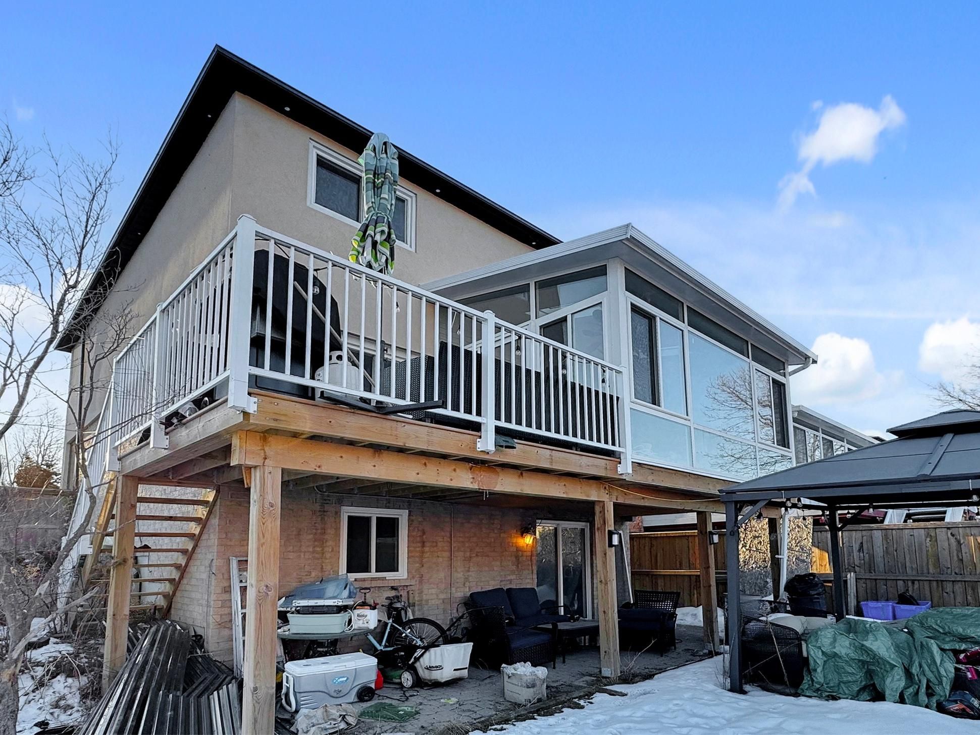 Get ready to fall in love with this beautifully upgraded, move-in-ready detached home in the heart of pickering, offering three spacious bedrooms, three washrooms, and a walkout basement complete with a kitchen and one bedroom-ideal for rental income or an in-law suite. Set on a rare pie-shaped corner lot, this home features a large, private backyard and has been extensively improved inside and out. The entire exterior was fully upgraded with stucco in the summer of 2024, replacing the previous vinyl siding, with r9 insulation added around the home beneath the stucco for enhanced energy efficiency. A new roof was completed in the summer of 2023, followed by the installation of exterior pot lights around the roof soffits in early 2024, adding both curb appeal and functionality. Additional upgrades include brand new windows in the family room above the garage installed in late 2025, as well as a bedroom window replacement completed in 2023. The outdoor space has been thoughtfully redesigned with a new interlocking driveway completed in late summer 2025, interlocking added along the side of the home in the front section between 2022 and 2023, and a retaining wall built in the front garden area in approximately 2021. A four-season patio enclosure was added in 2022, along with a brand-new deck featuring hydraulic posts, creating an exceptional space for year-round enjoyment and entertaining. Inside, the hallway bathroom was completely renovated in 2022, transforming the layout to include a luxurious soaker tub and a separate standalone shower, along with new flooring, half-height tiled walls, and the installation of a new deep sink and toilet. Ideally located with easy access to top-rated schools like k-12 french, parks, mosques, shopping, go transit, and highways 401 and 407, this affordable detached home truly checks every box-just move in and enjoy