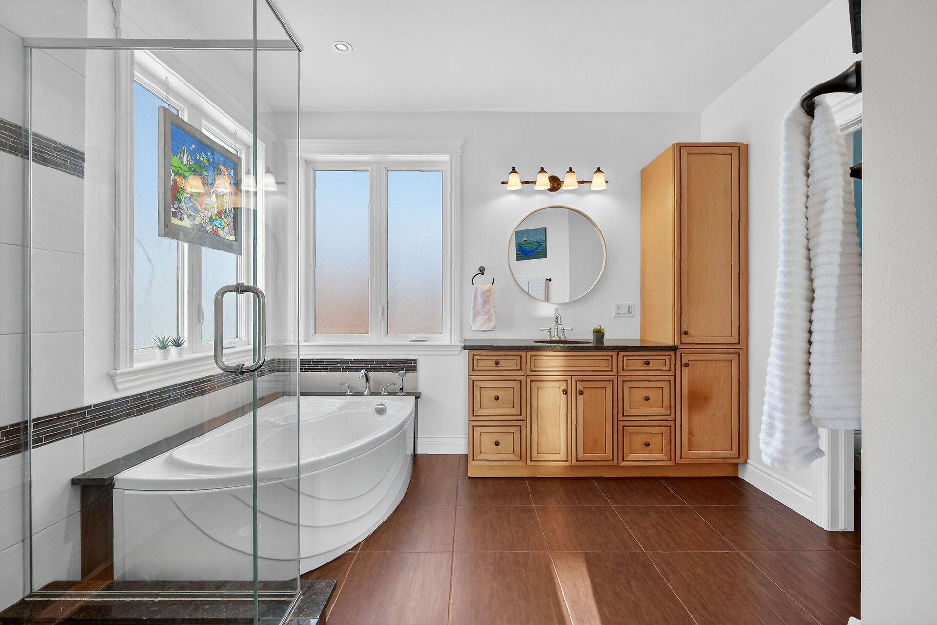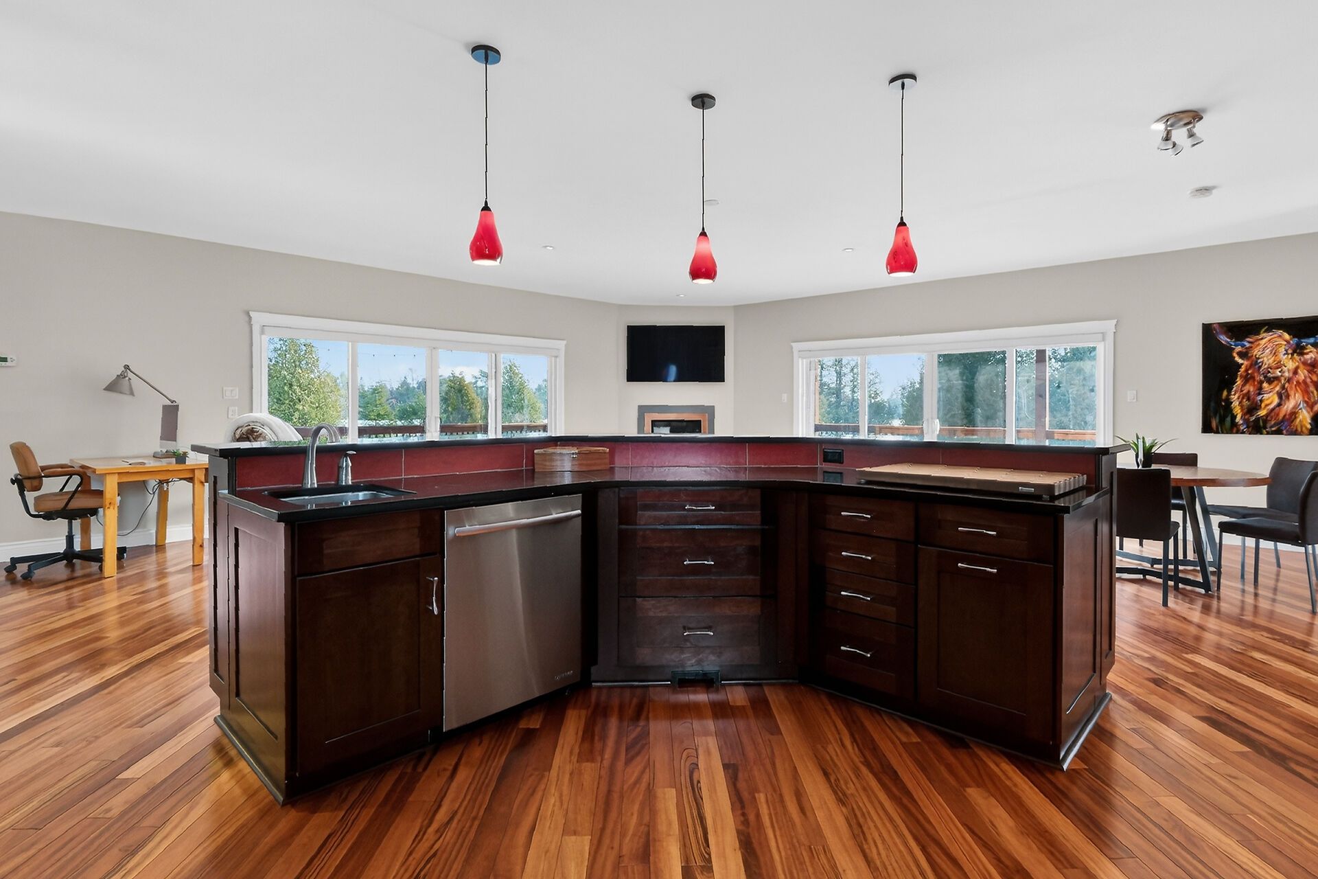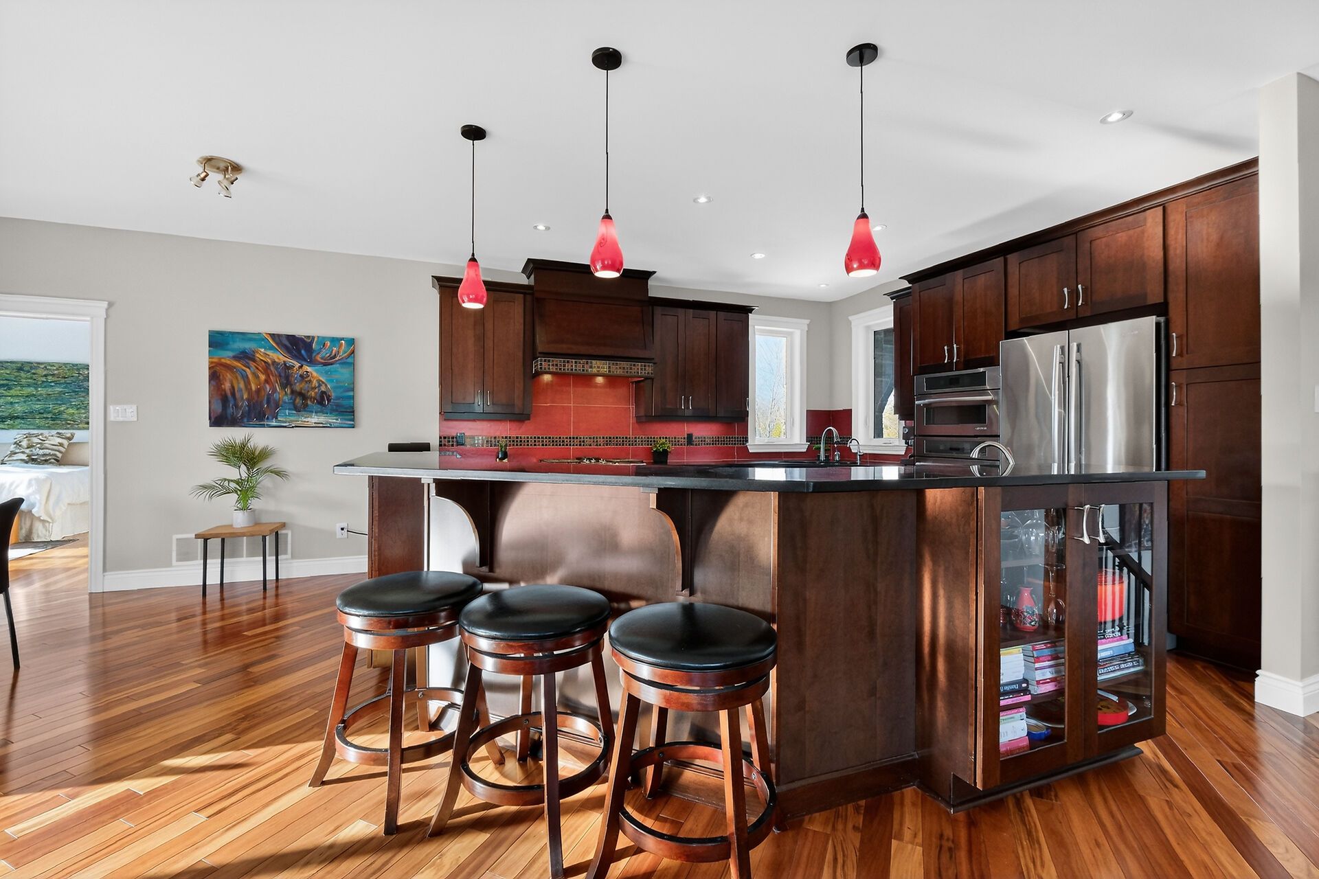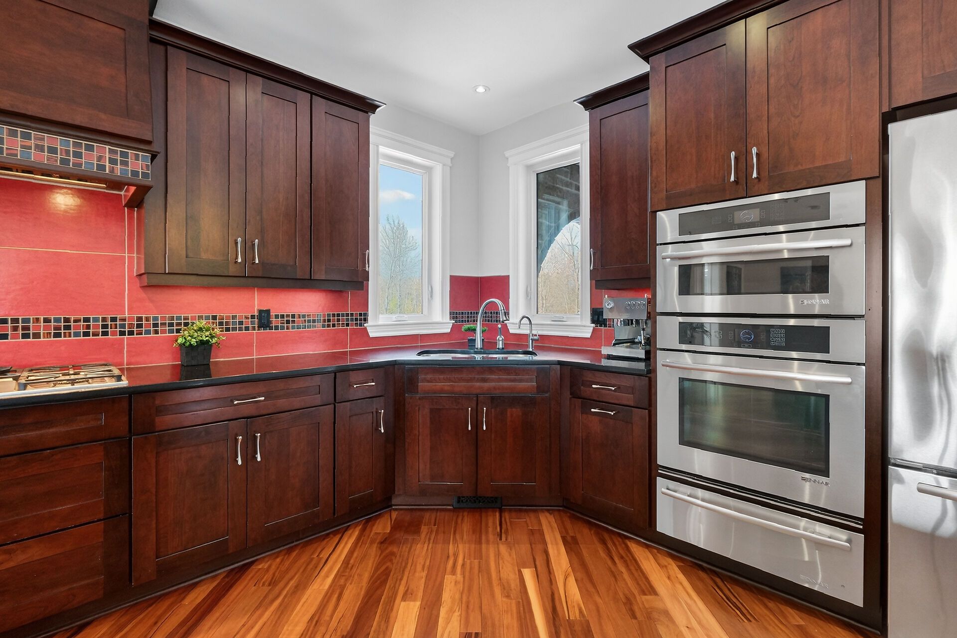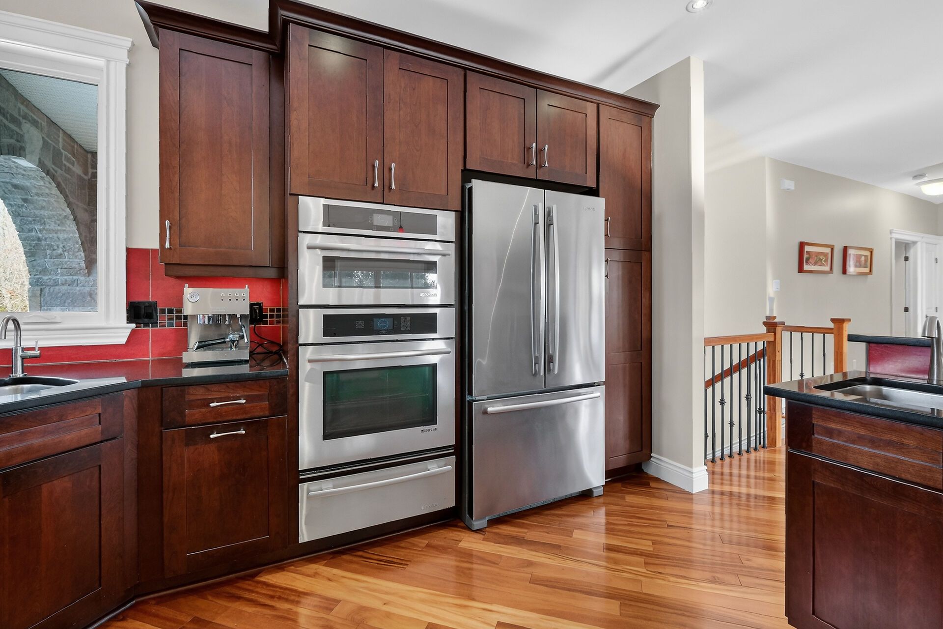 • Chef-inspired kitchen with stainless steel appliances and ample prep space.