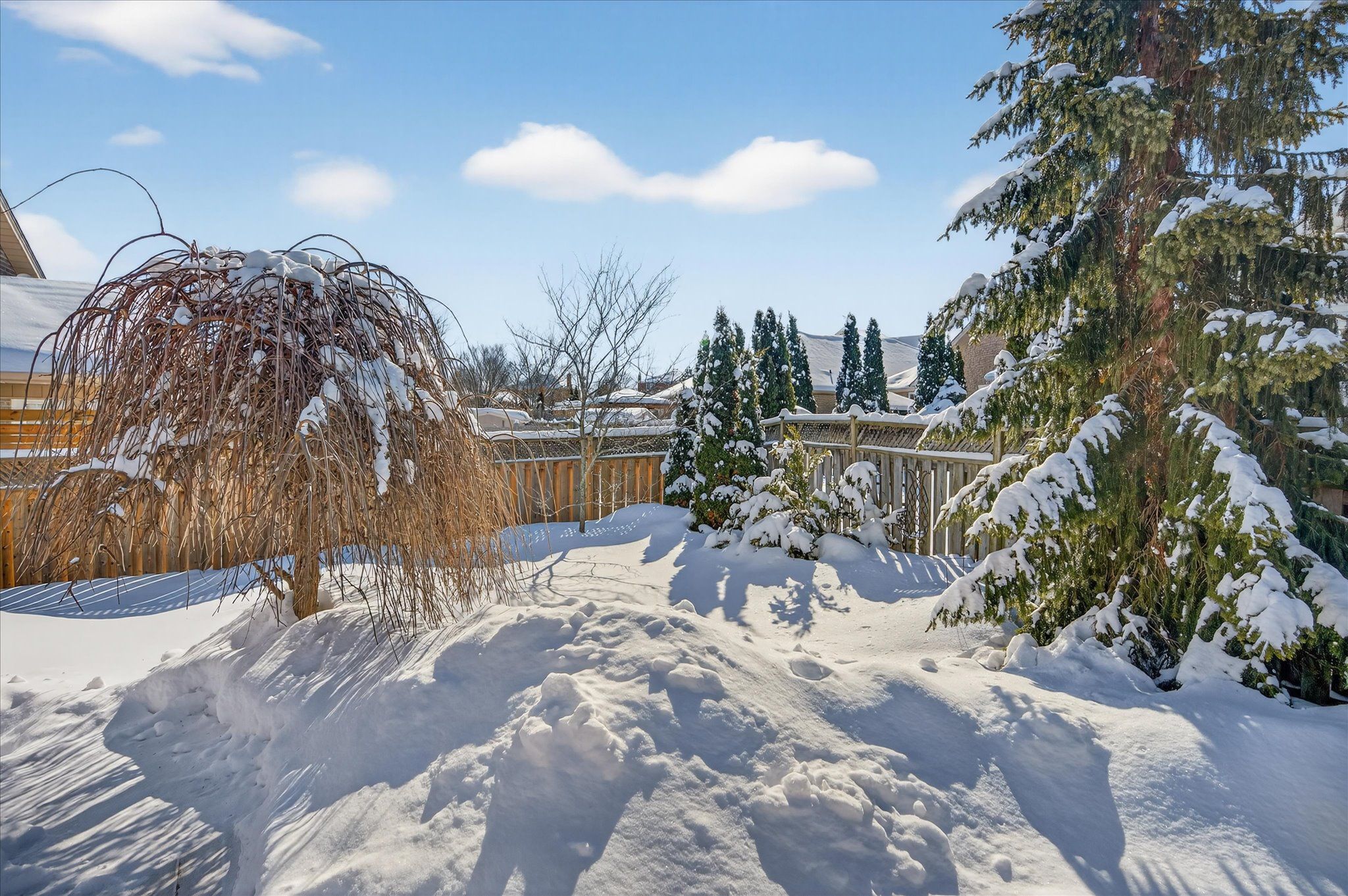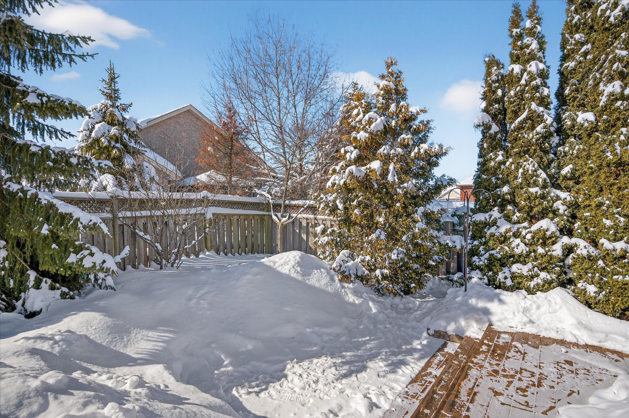 • South-facing backyard with large deck and mature gardens.