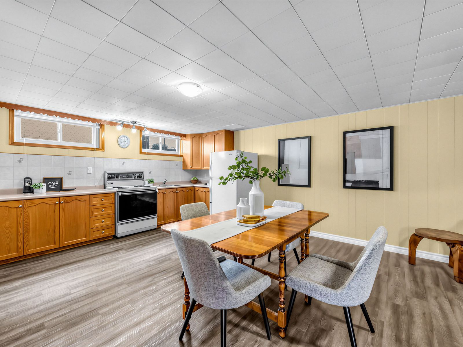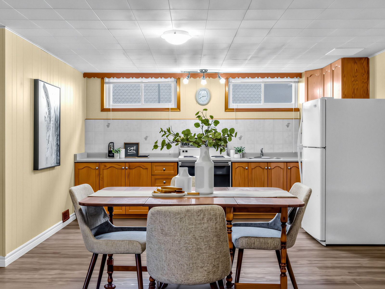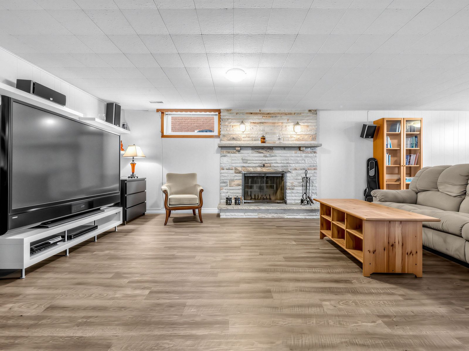 • Fully finished basement with family room, second kitchen, and cozy fireplace.