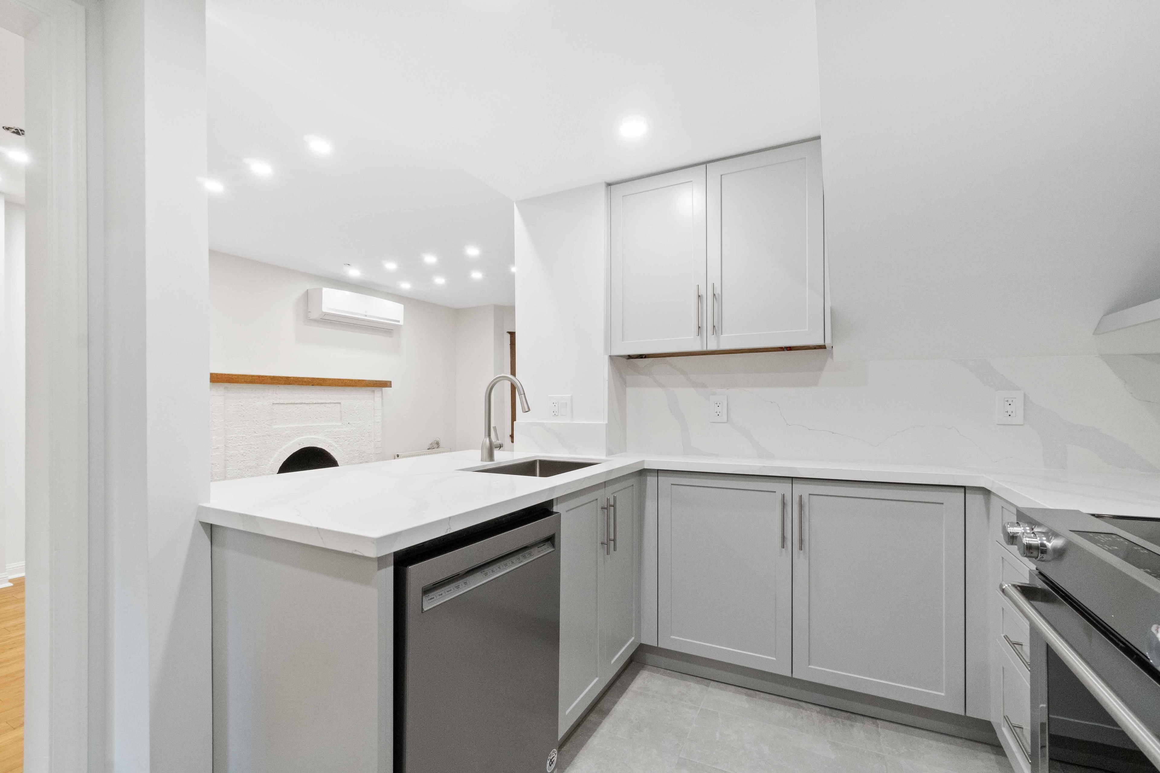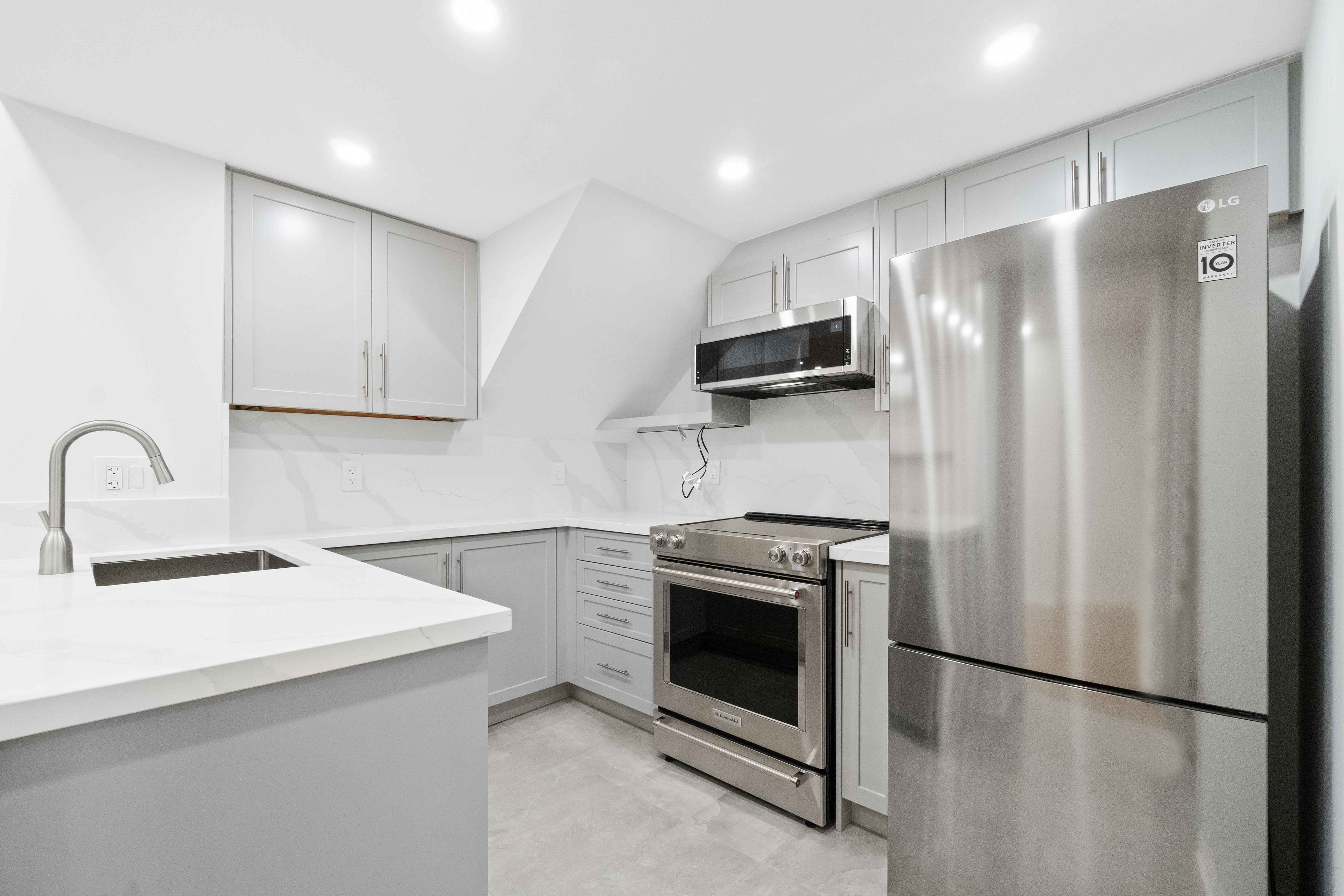 • Modern kitchen with quartz countertops and stainless steel appliances.