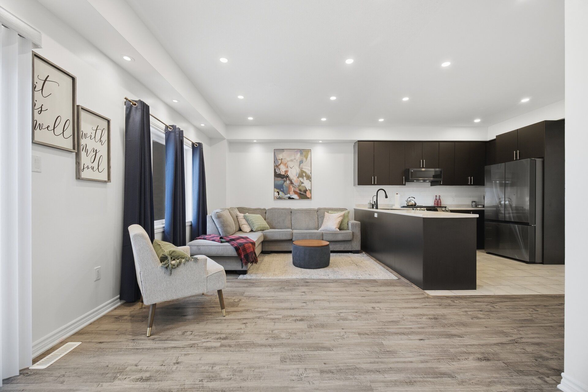 • Modern open-concept design with stylish finishes and bright eat-in kitchen.