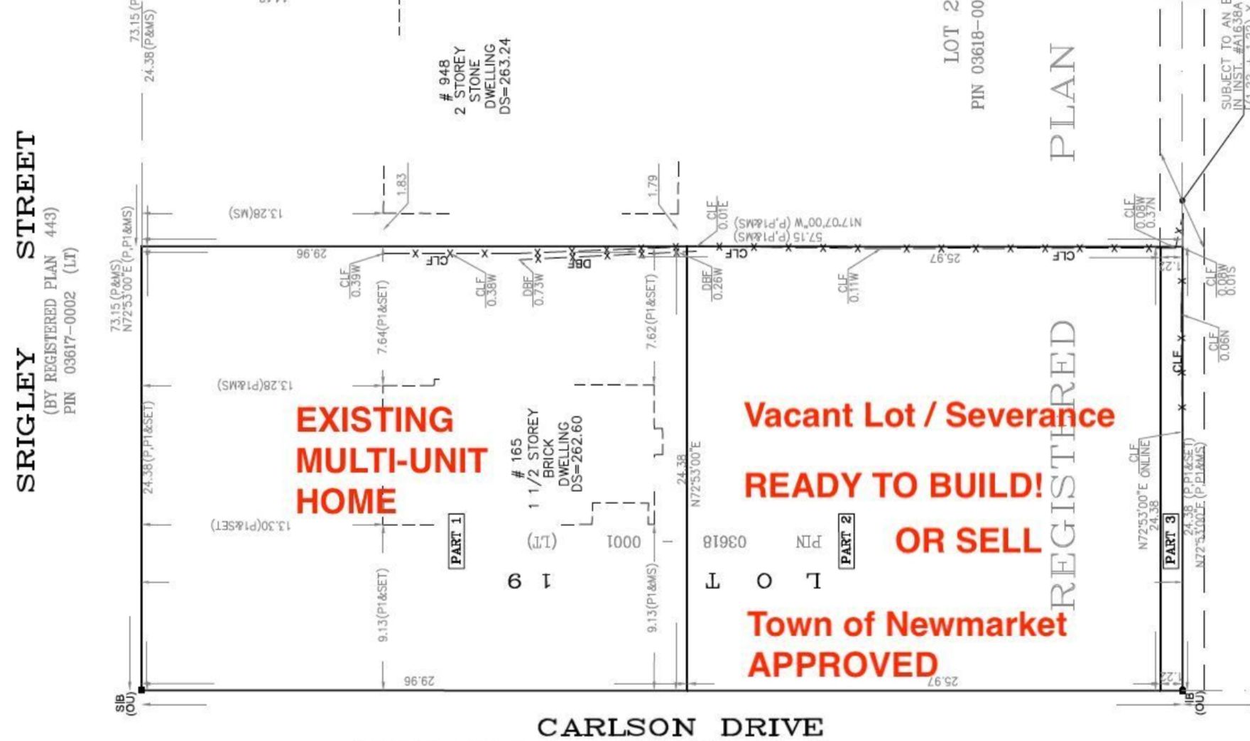 Rare find! **187. 5 x 80 ft** oversized corner double lot at 165 carlson drive - two parcels with granted city-approved severance and development plans for an additional modern 2-storey, 2750+ sqft detached home on additional vacant lot. Builder / investors special! This home located in the heart of newmarkets highly sought-after gorham-college manor community. Surveys, minor variance & consent applications approval, draft r-plan are available upon request. Endless investment possibilities: (1) retain the original multi-unit home, sever and sell or build on the vacant lot. (2) renovate the existing home, live on the upper floors and rent the basement apartment with separate entrance while landbanking the second parcel. (3) sever the lot and build two brand-new detached homes. (4) keep the double lot intact and construct a 5000+ sqft estate mansion. Surrounded by new luxury multi-million dollar mansions. Prime location: steps from top-rated schools (sacred heart) parks, major amenities, minutes to highway 404. 2 lots in 1. Request a copy of site-plans and book your tour today!
