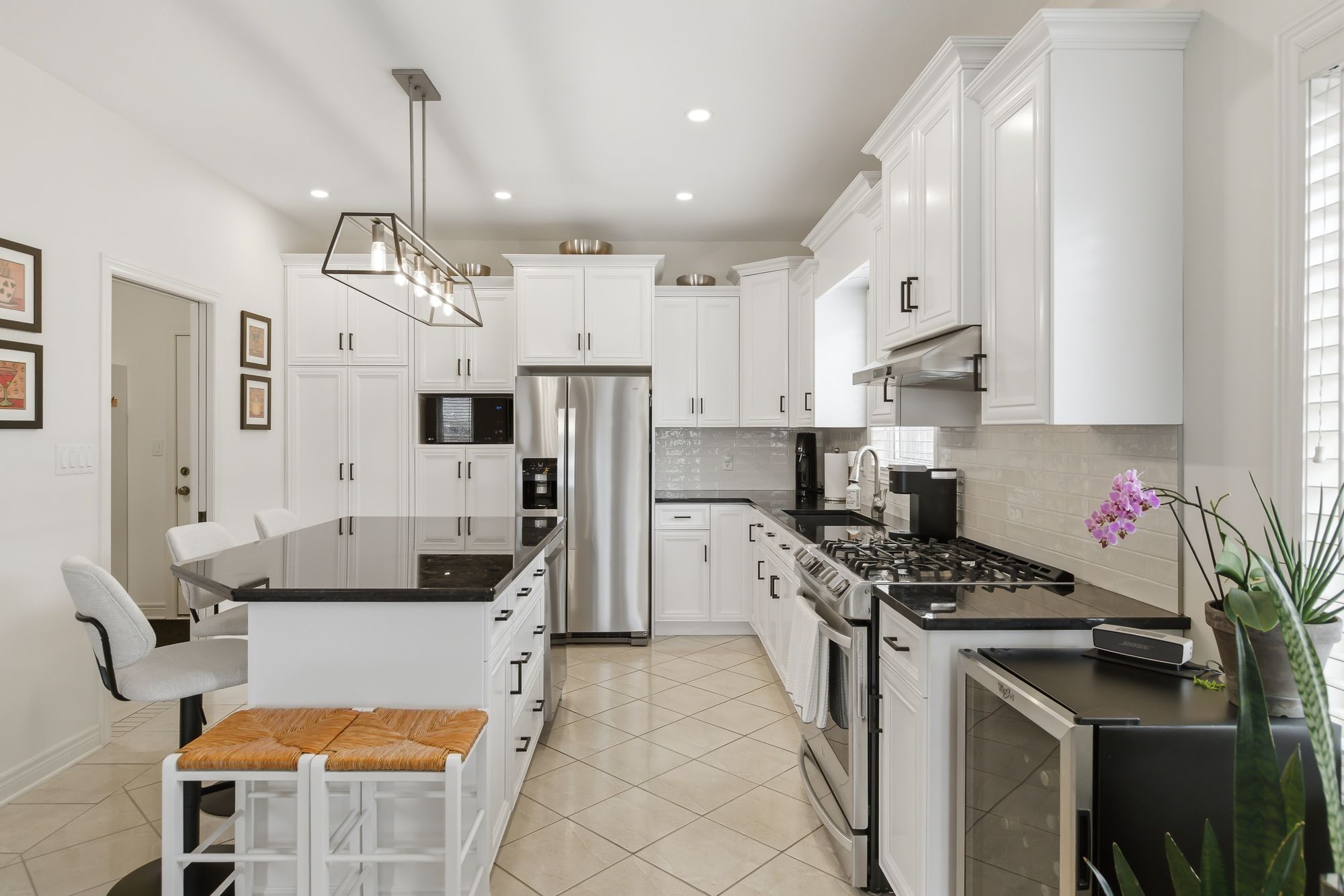 • Well-equipped island kitchen with granite counters and stainless steel appliances.