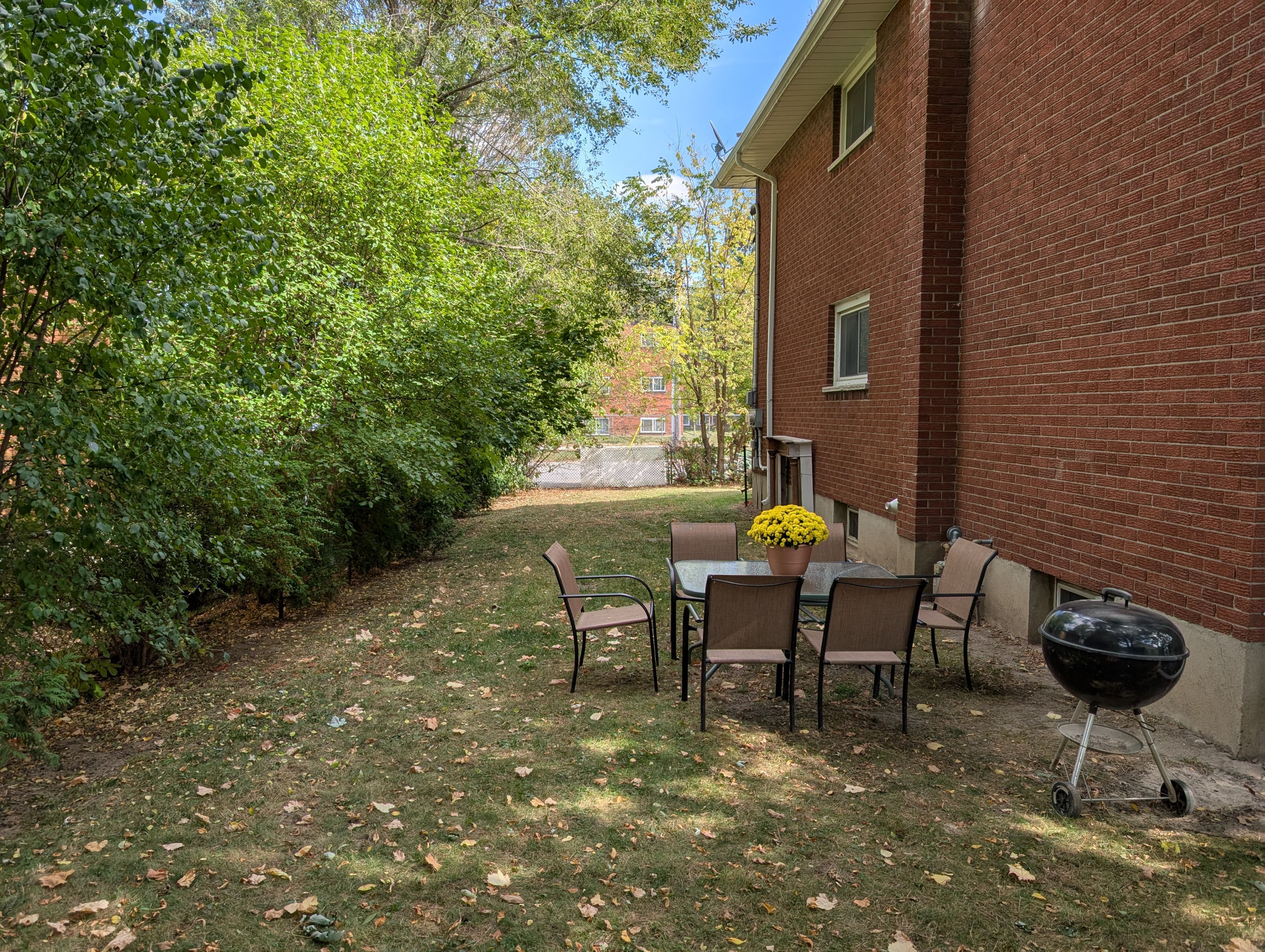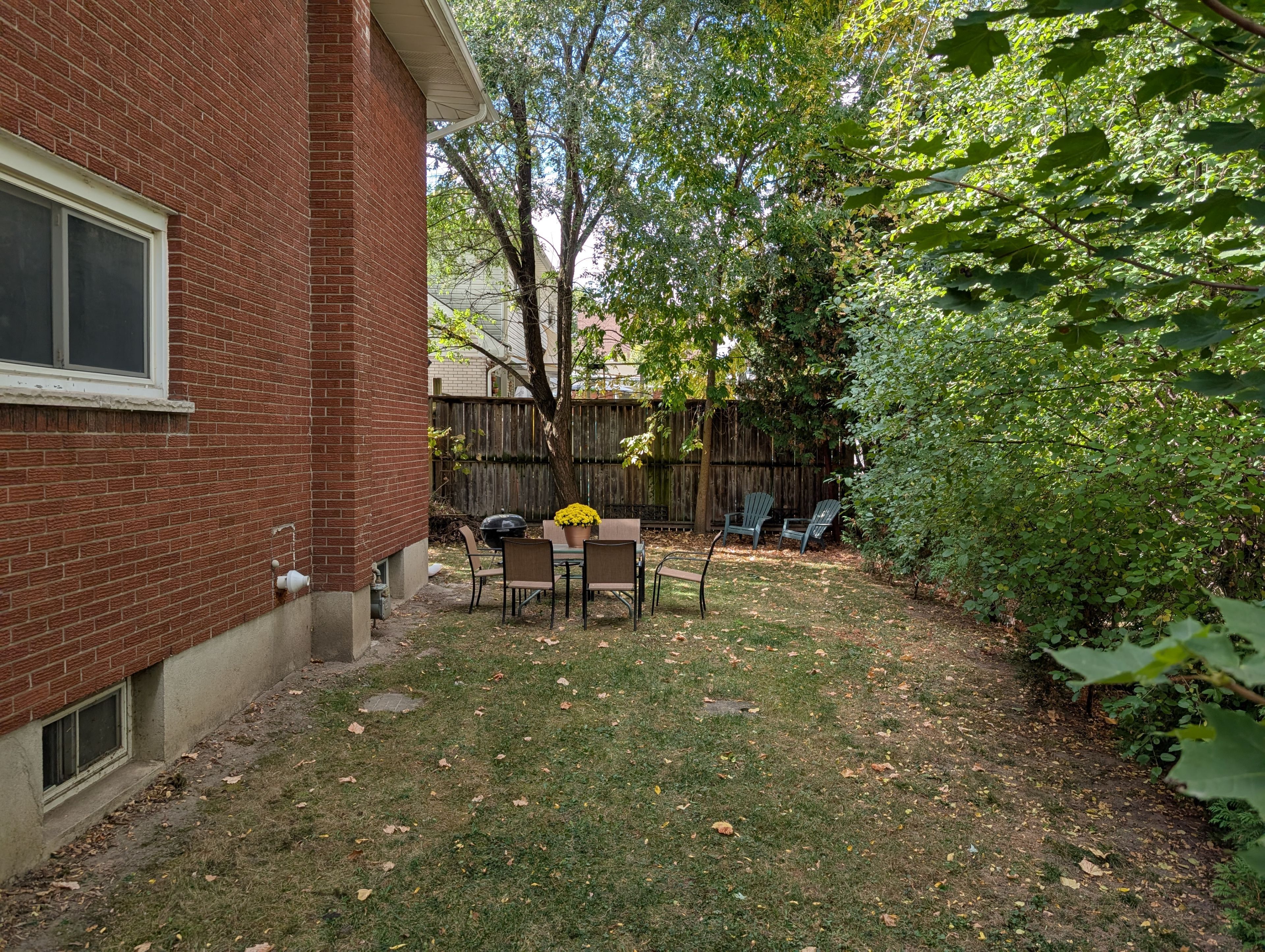 • Large corner lot features a backyard with mature trees and outdoor dining area.
