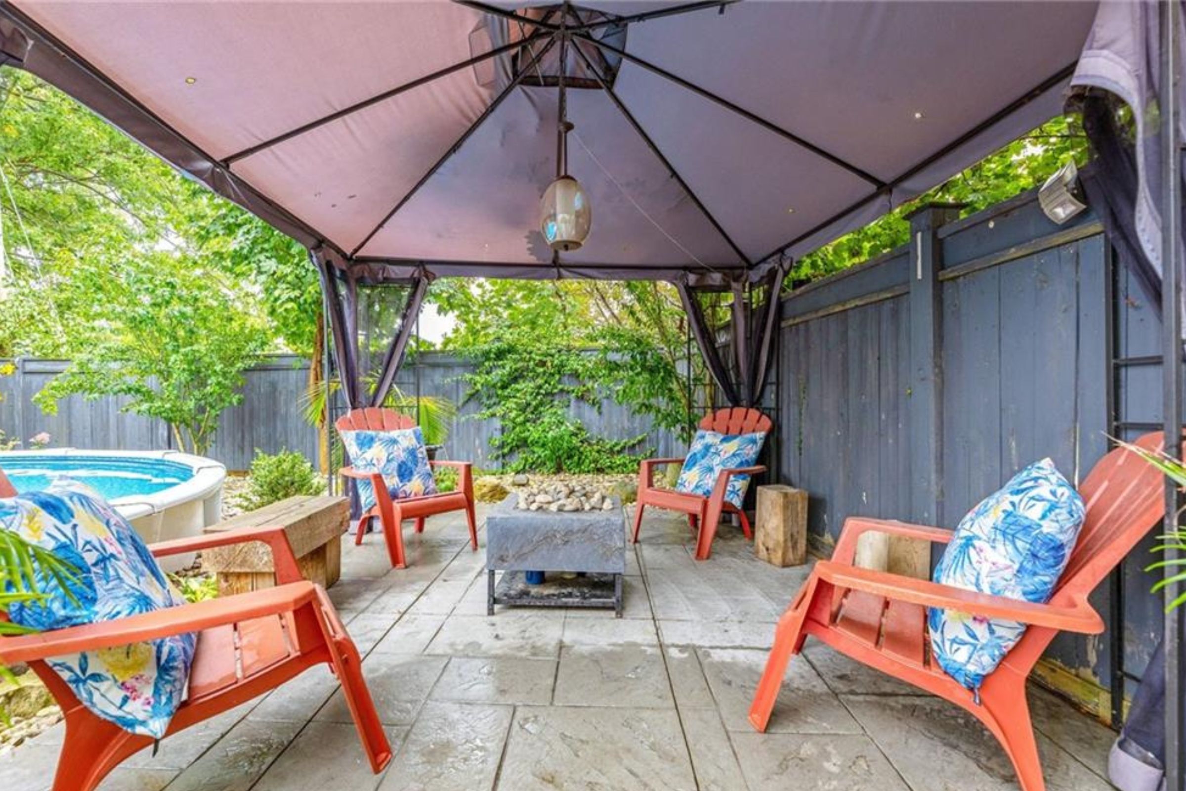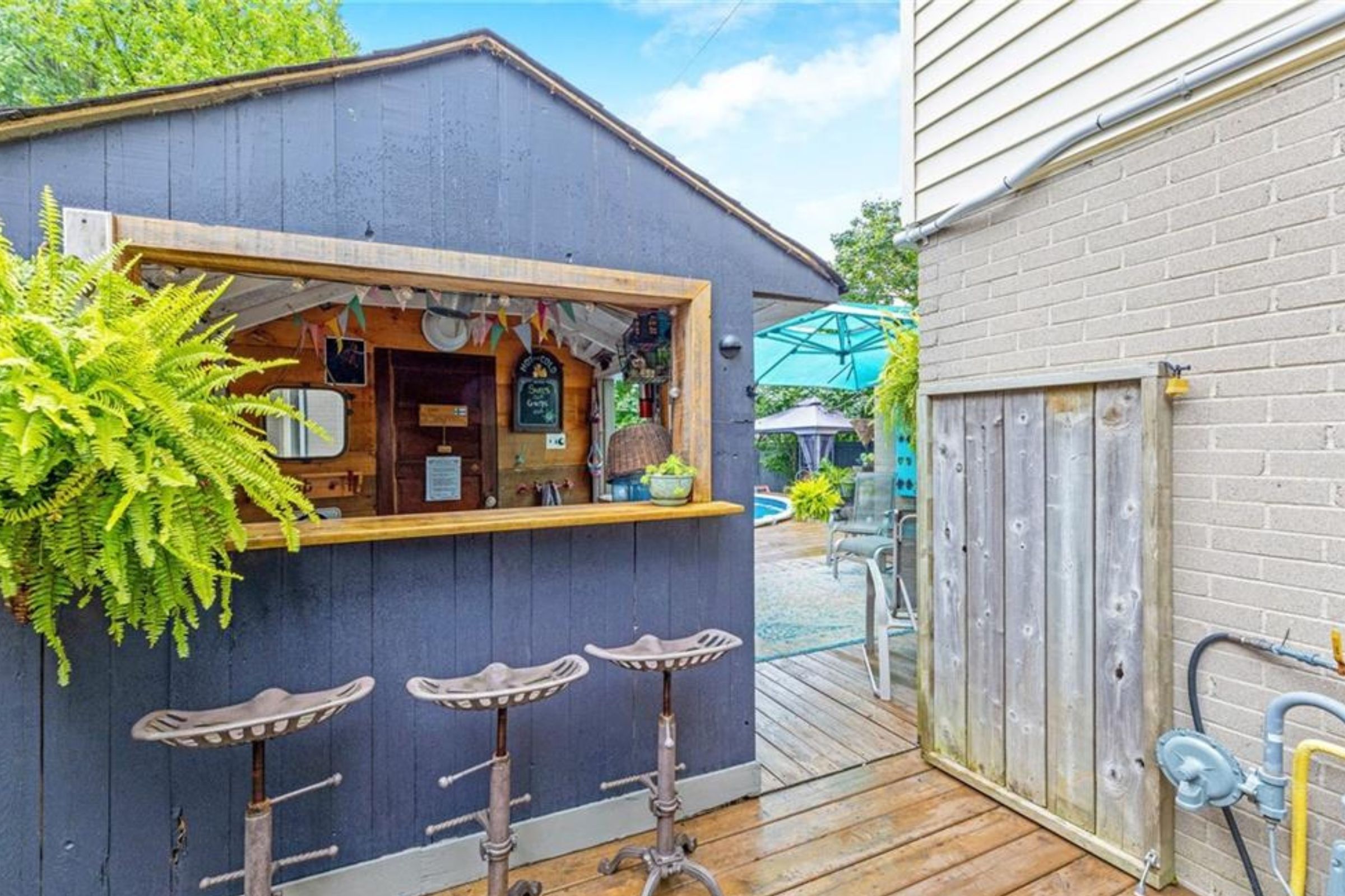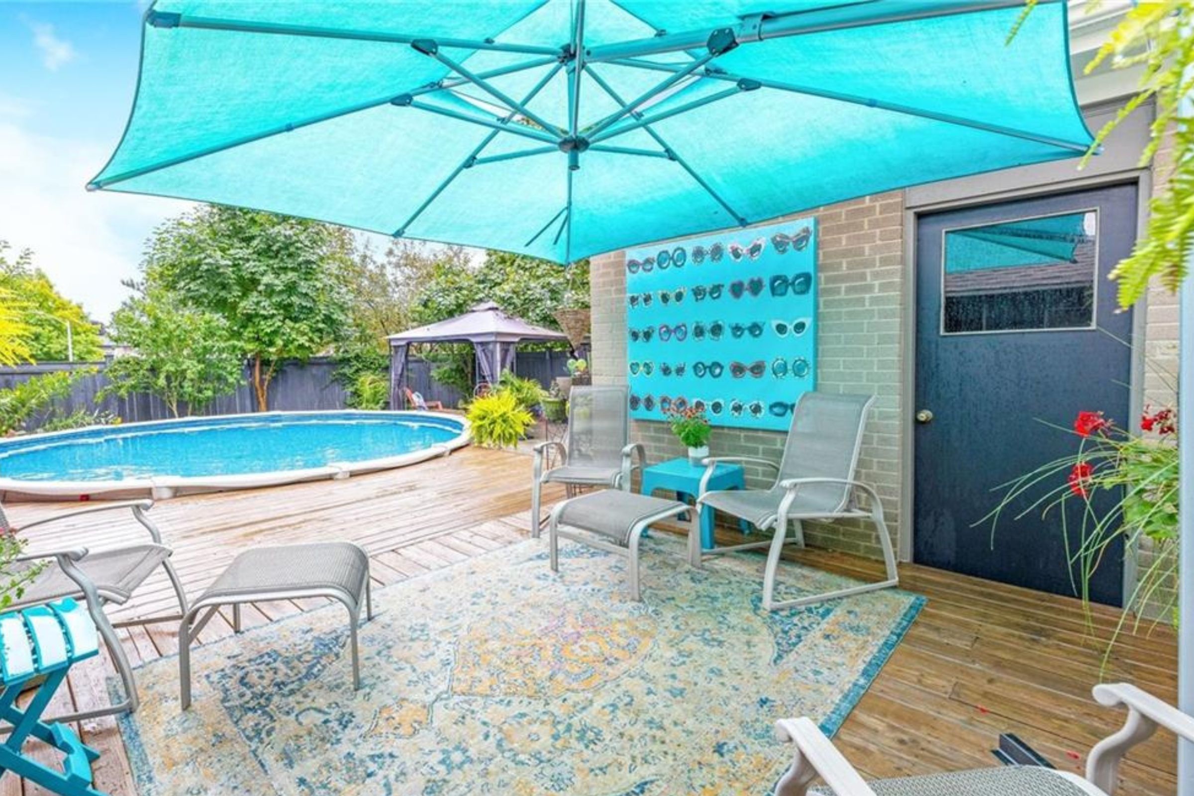• Private backyard with pool, cabana, sauna, and patio for entertaining.
