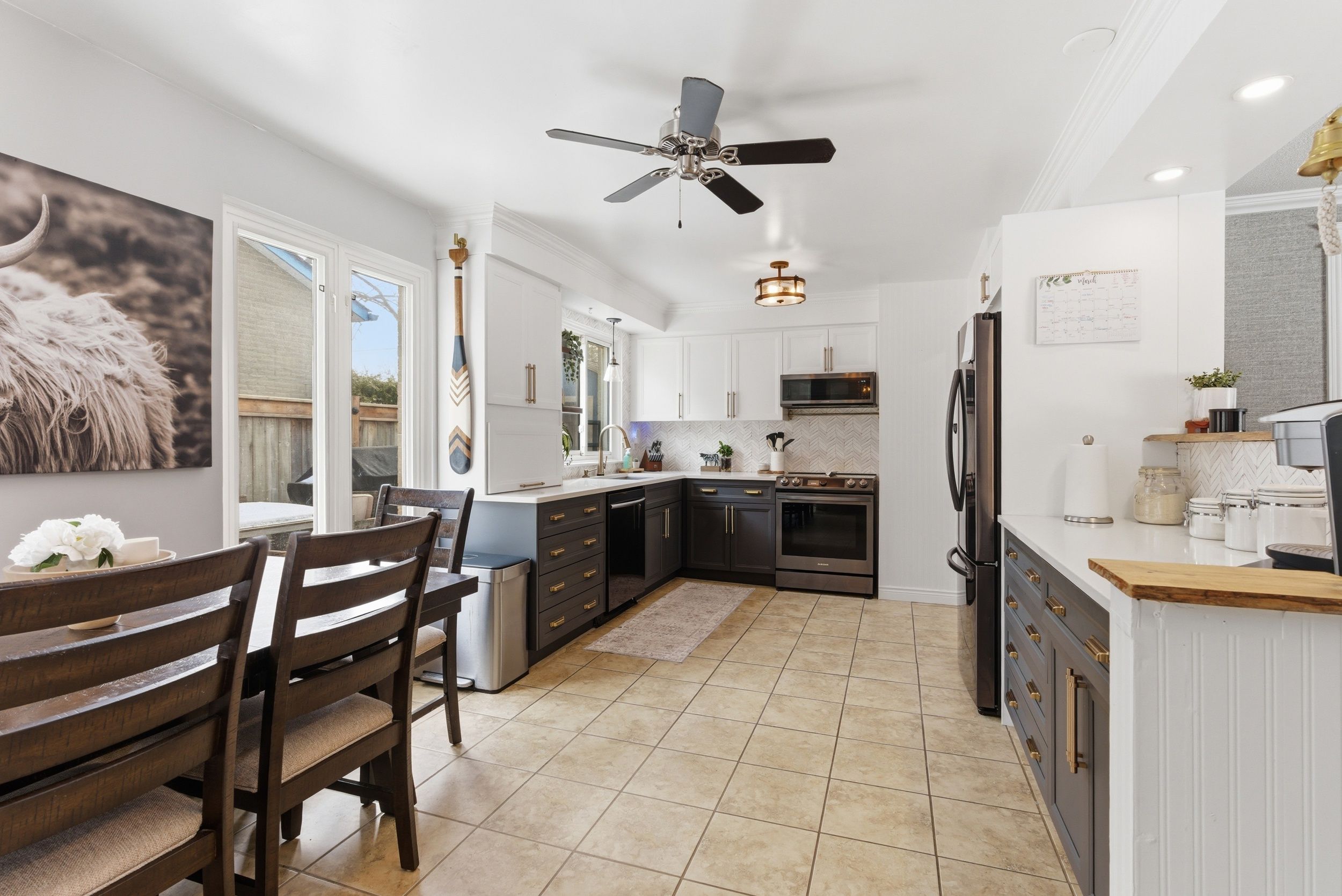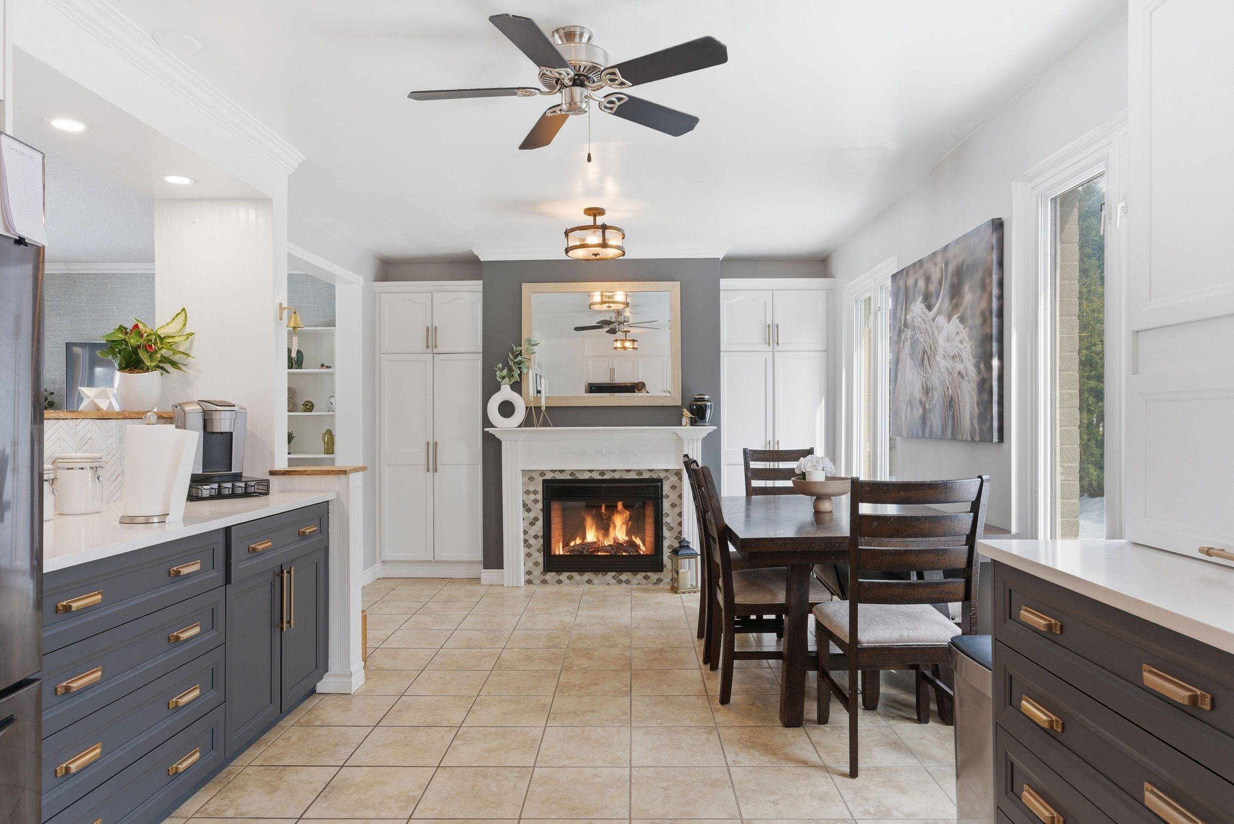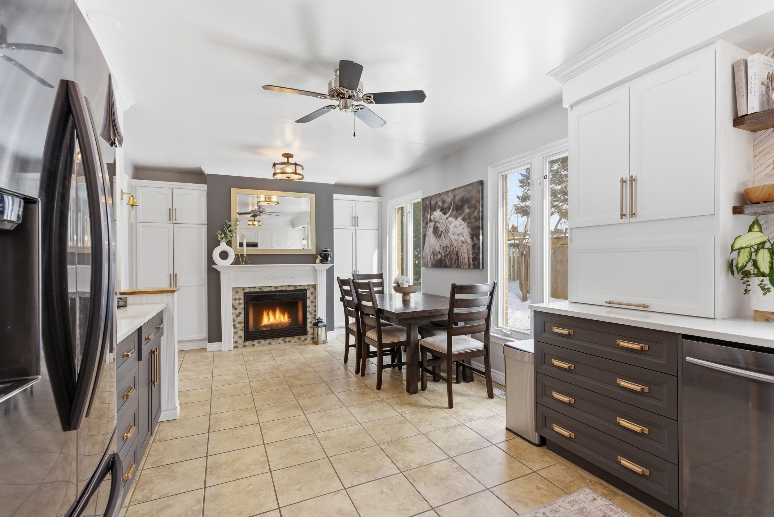 • Bright family room flows into a renovated eat-in kitchen with modern features.