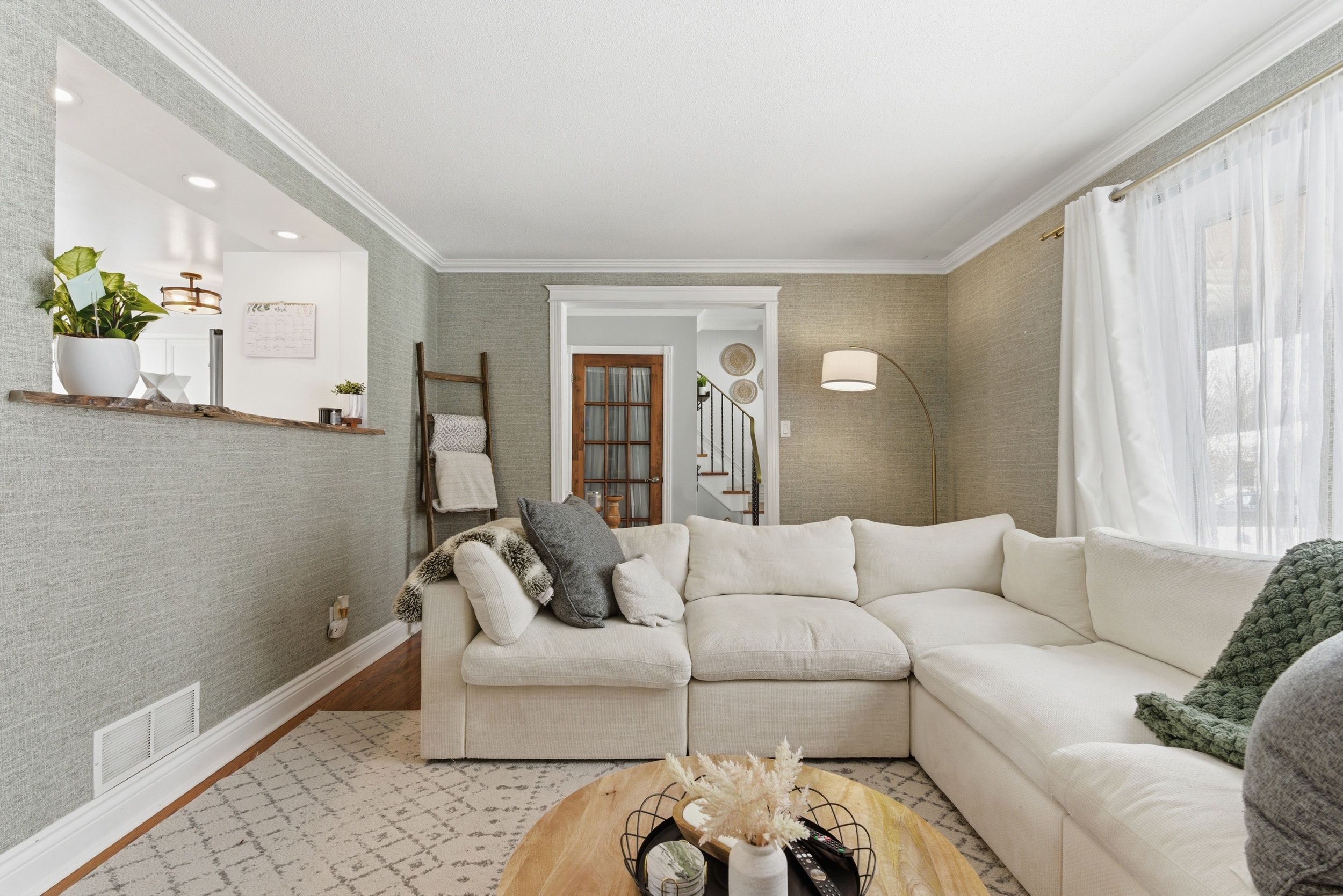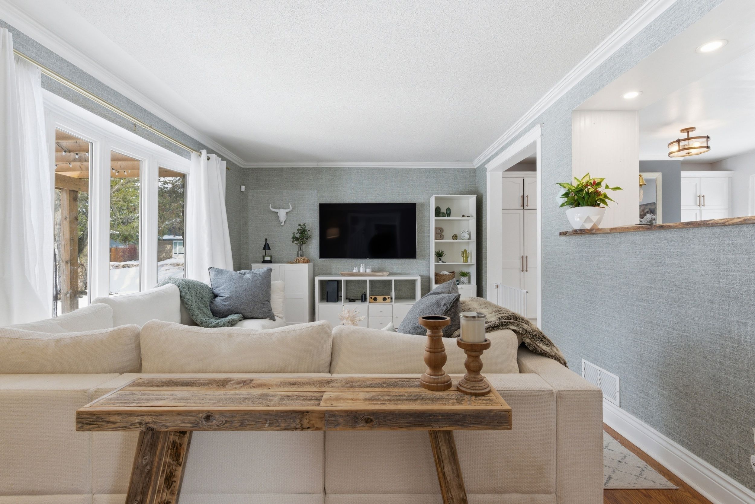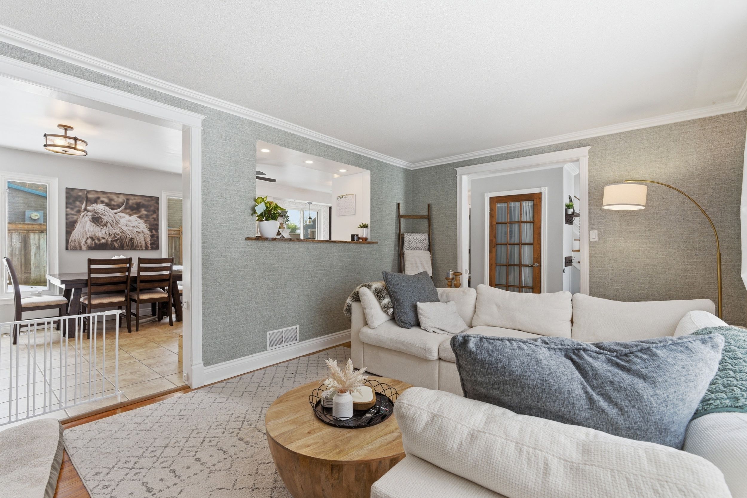 • Bright family room flows into a renovated eat-in kitchen with modern features.