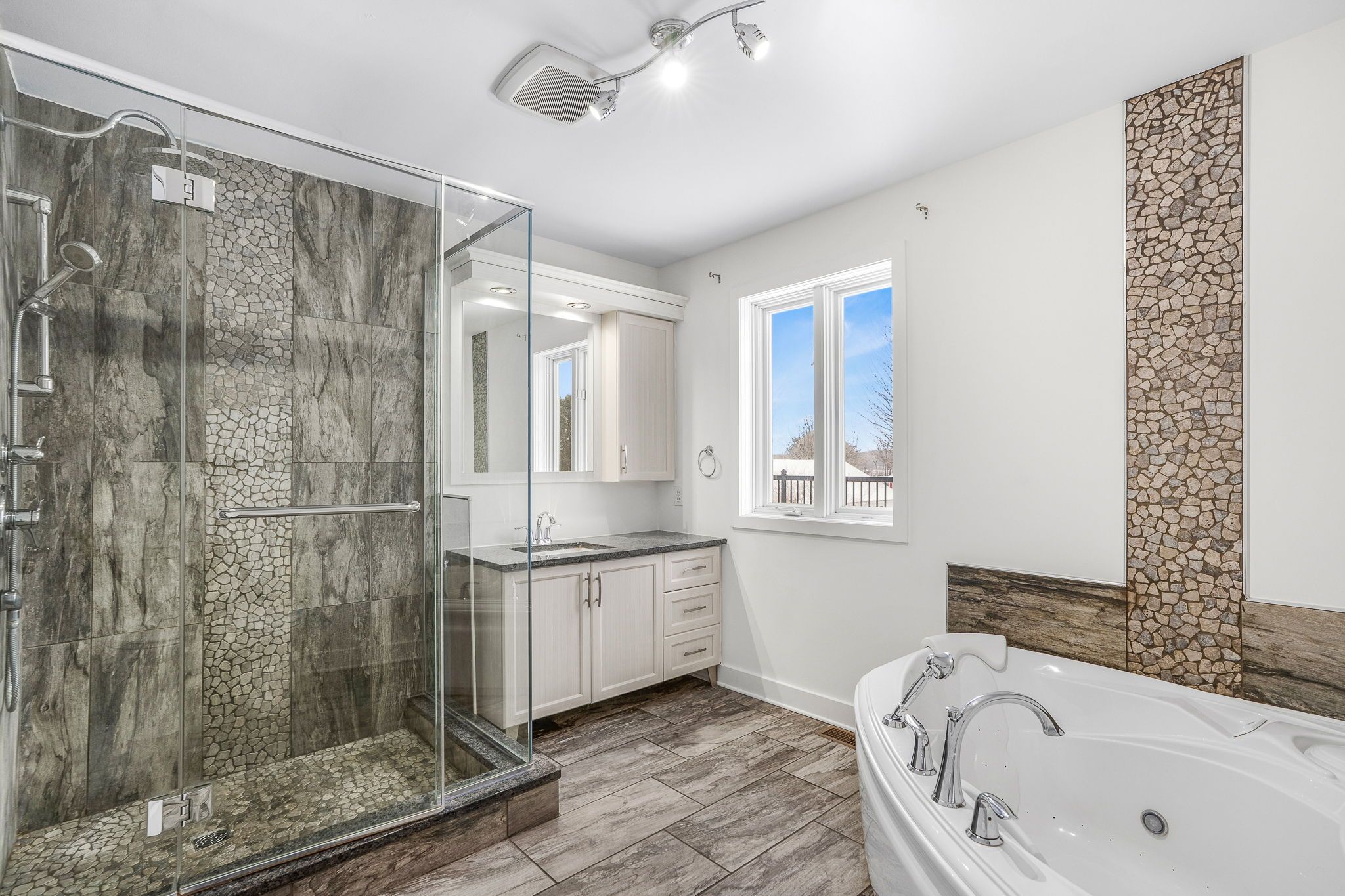 Escape to the country on quiet gourley road in the township east hawkesbury, just a short drive to highway 417 with an easy connection to the montréal area. This unique home offers a functional main level featuring a modern kitchen with included appliances, a large centre island, and an inviting family room with vaulted ceilings and a cozy wood fireplace. You'll also enjoy the large mudroom and laundry room. The upper level boasts a mezzanine-style family room with access to a large patio, three generous bedrooms including a primary suite with a huge walk-in closet with built-ins and its own fireplace. Impressive bathroom with a state of the art ceramic shower and soaker tub. The fully finished basement provides even more versatile living space. Enjoy the four-season sunroom with a sunken hot tub overlooking the large backyard, perfect for relaxing or entertaining. Car lovers and hobbyists will appreciate the incredible garage setup: four garages in total - one single, one double, plus another single with front and rear doors for easy drive-through access to the yard. The propane furnace, central a/c, two fireplaces and a heatpump will keep this home cozy all year round! Generlink generator connector installed.