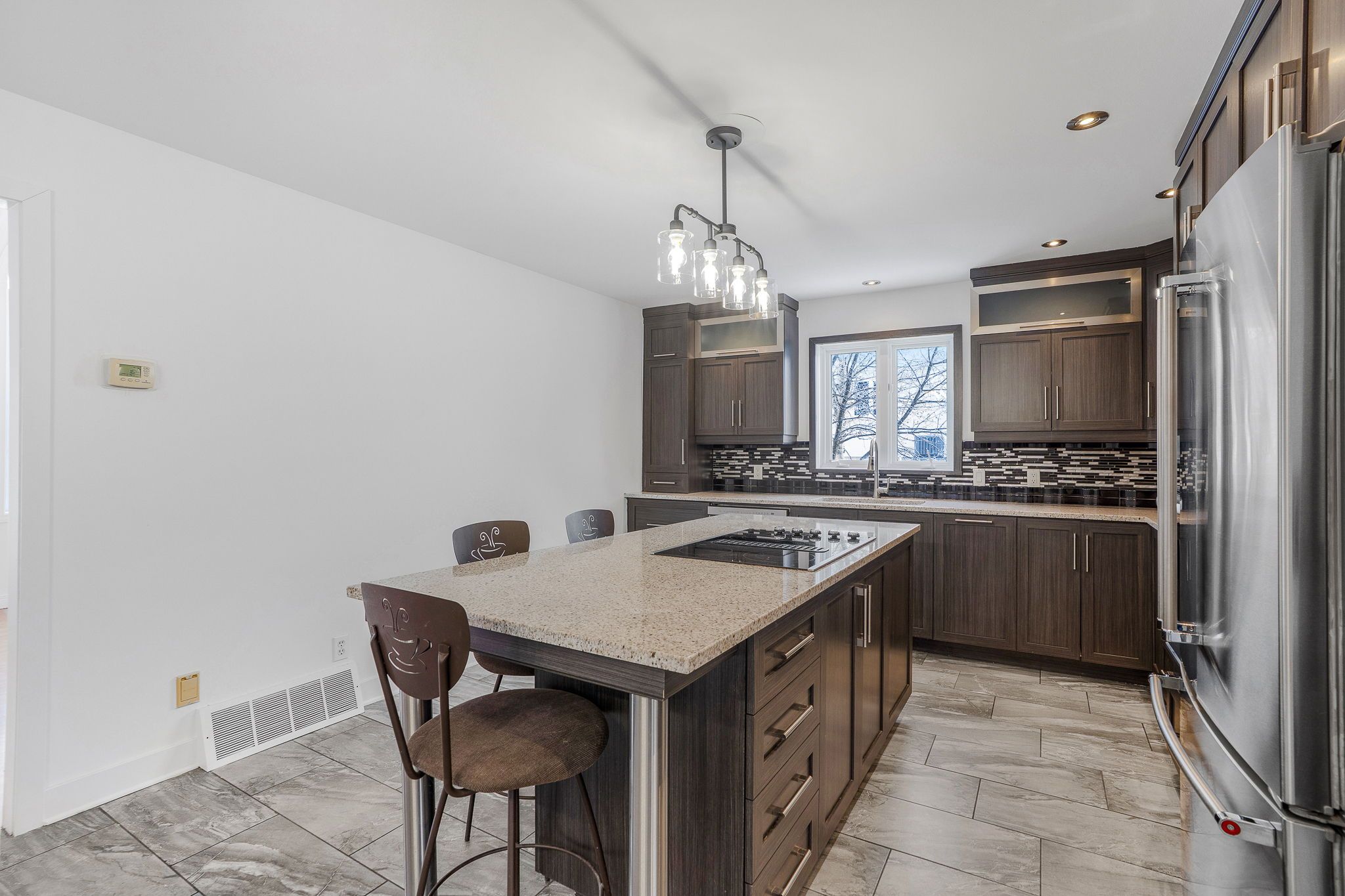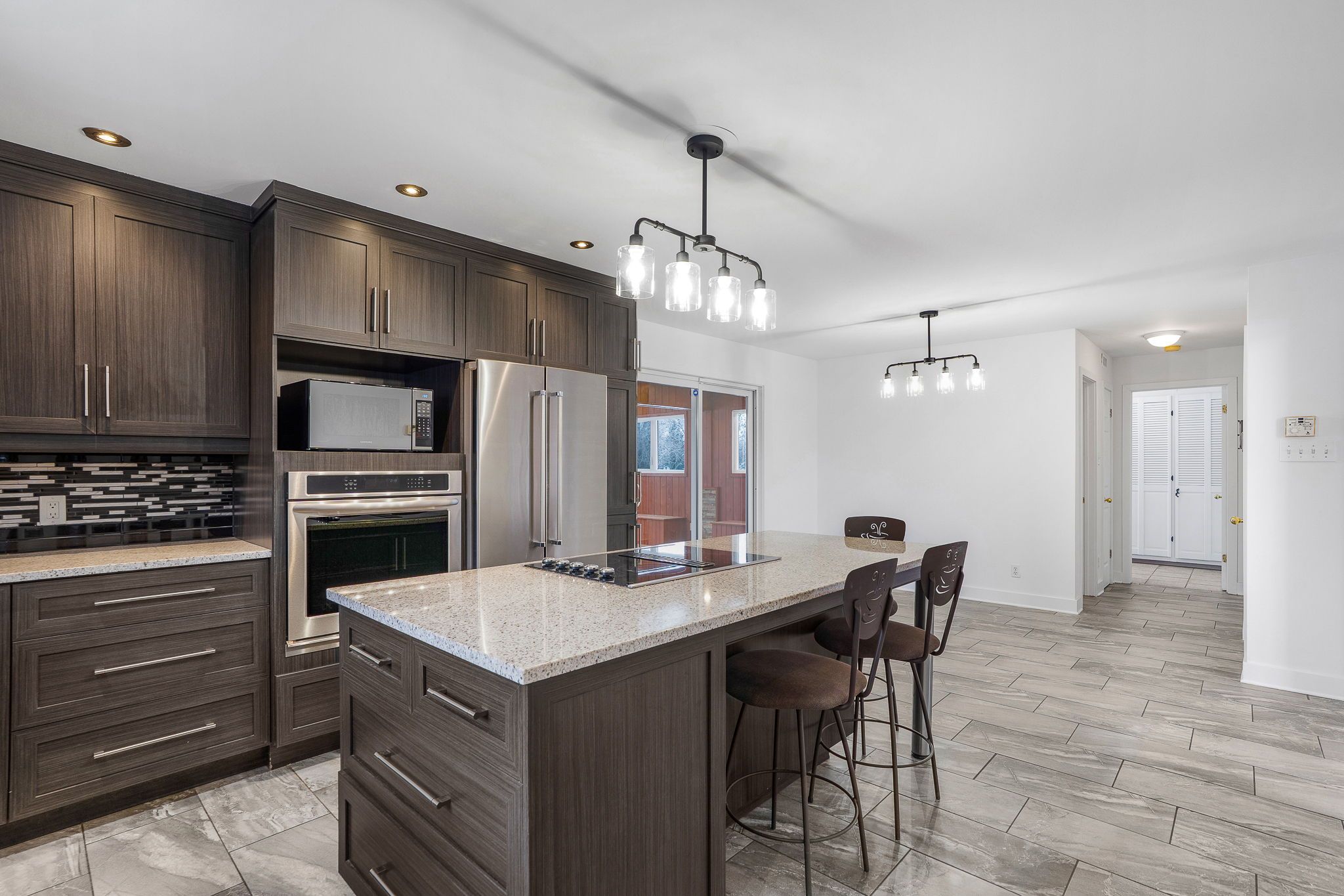 • Modern kitchen with appliances, large island, and inviting family room.