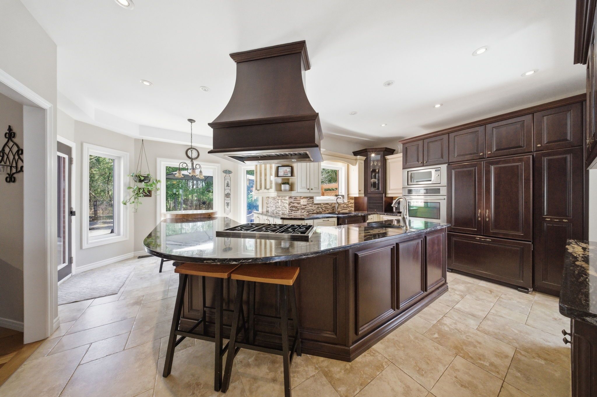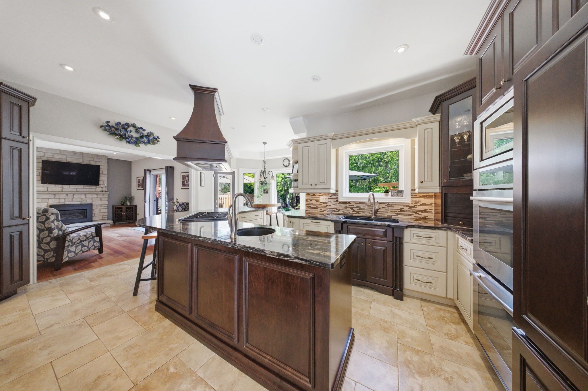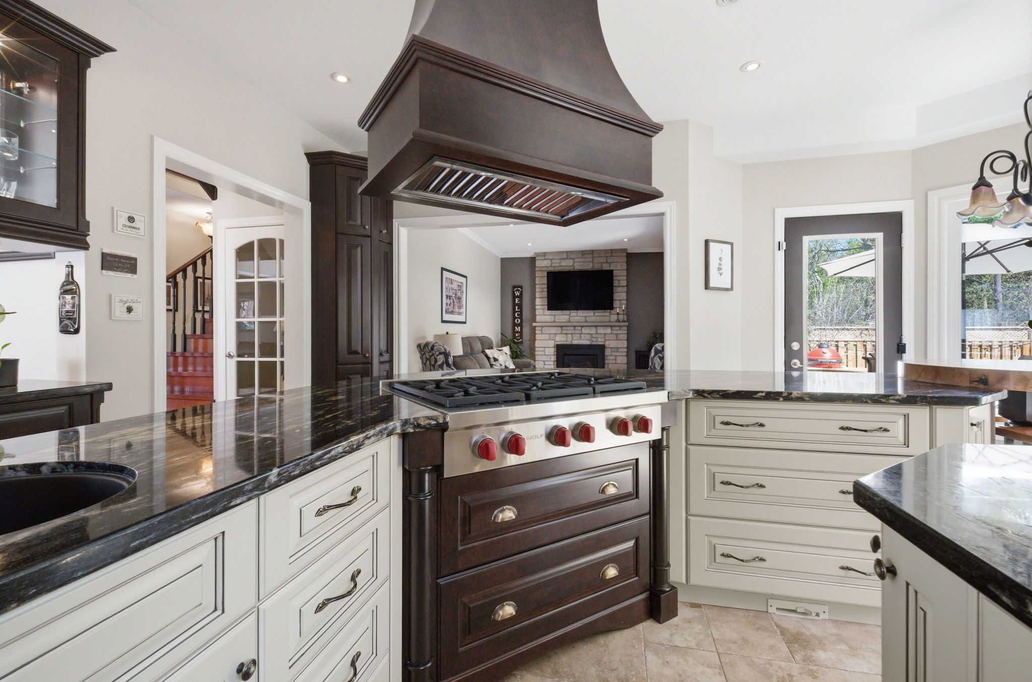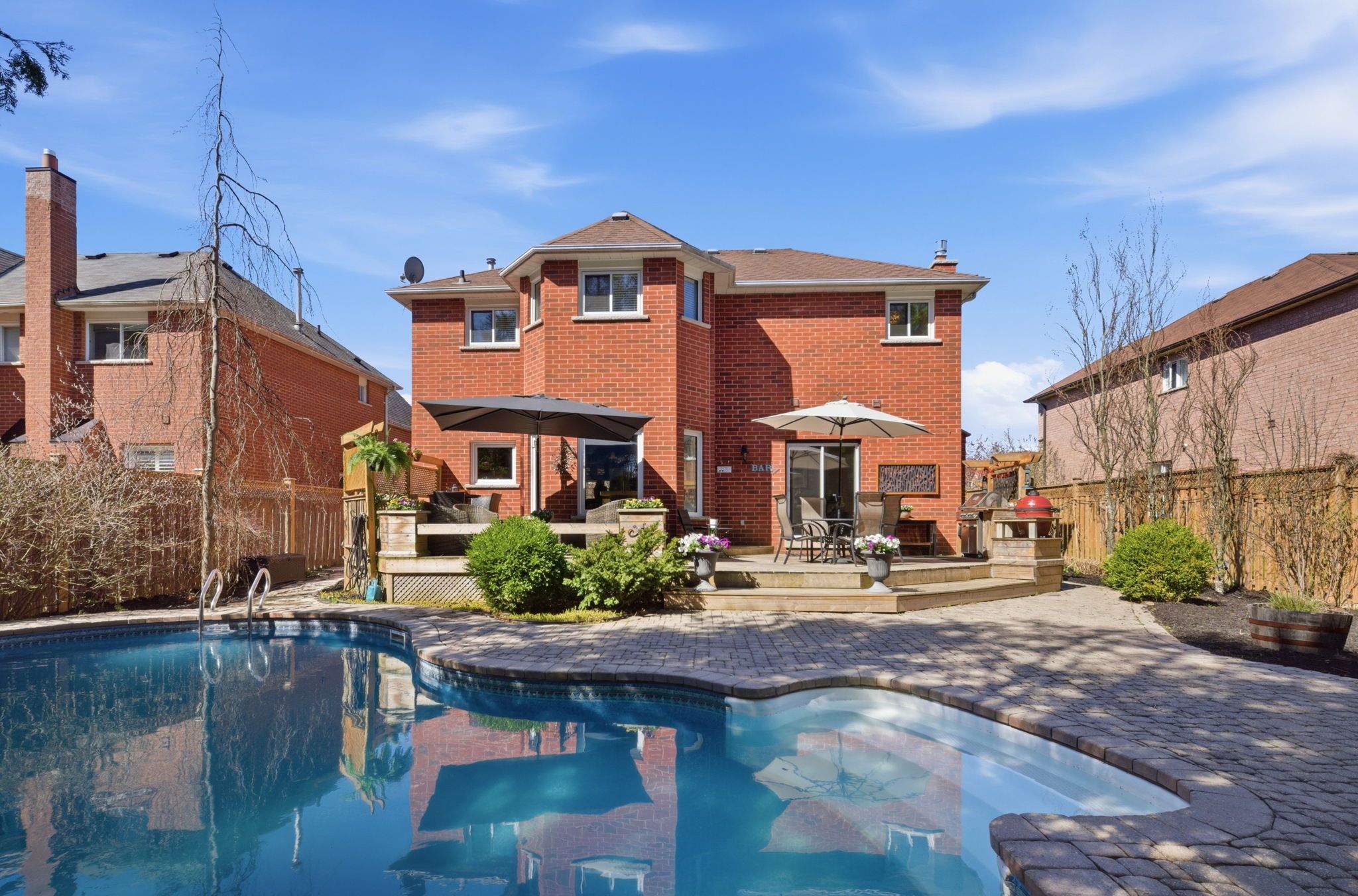 • Backyard oasis with heated pool, custom outdoor kitchen, and expansive deck.