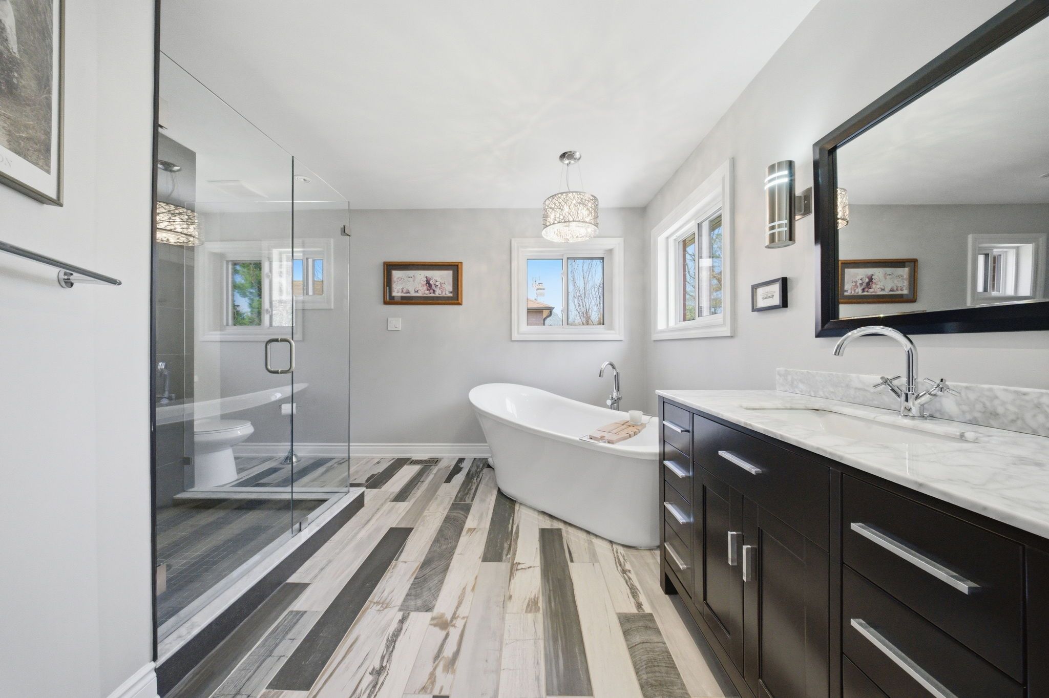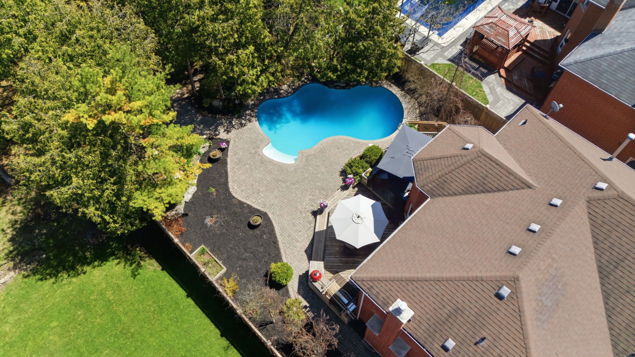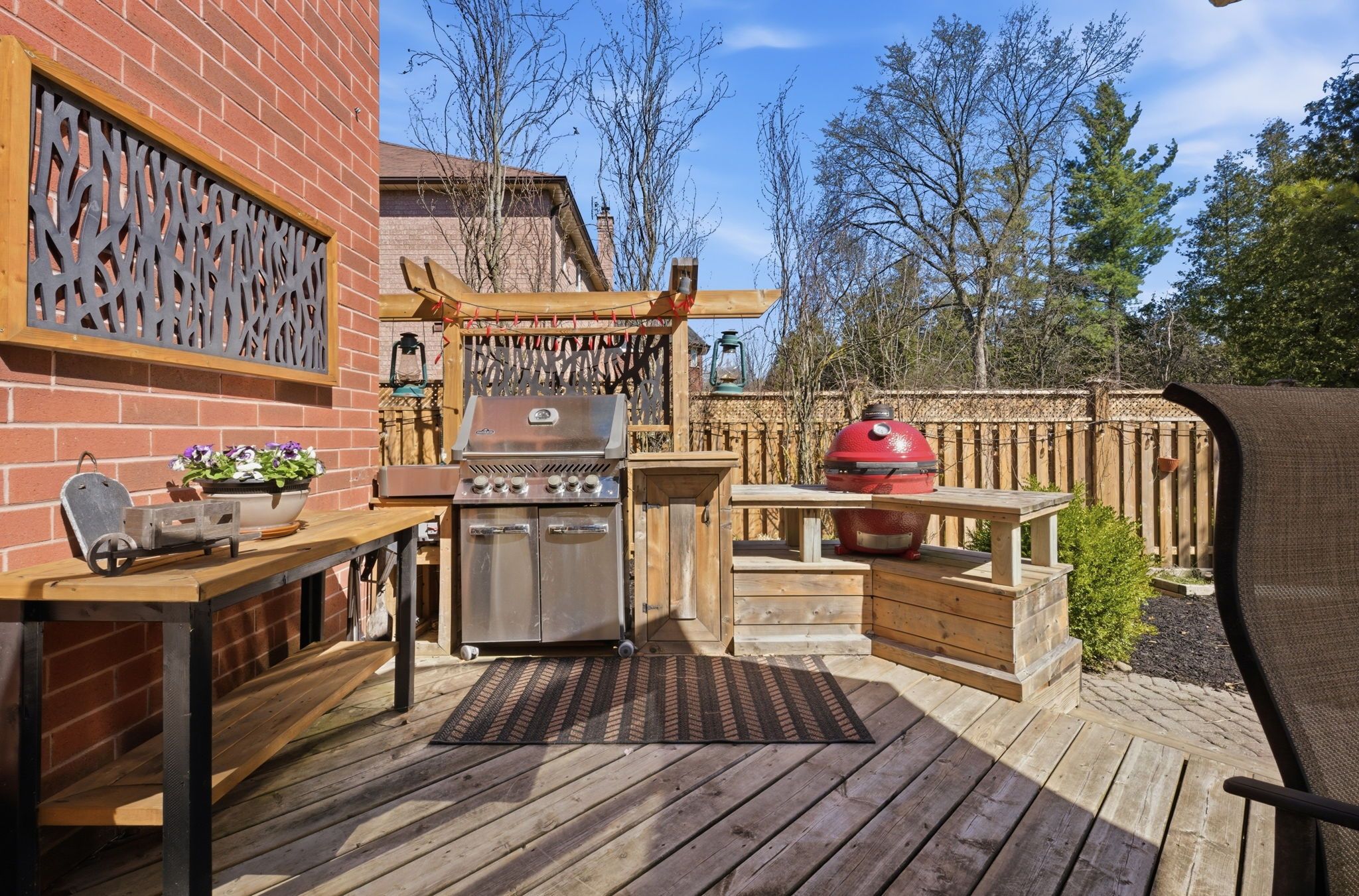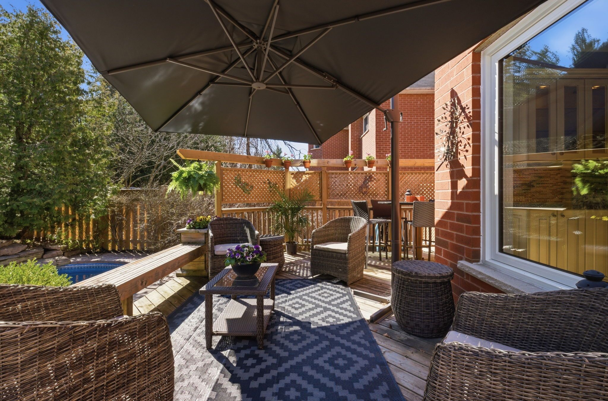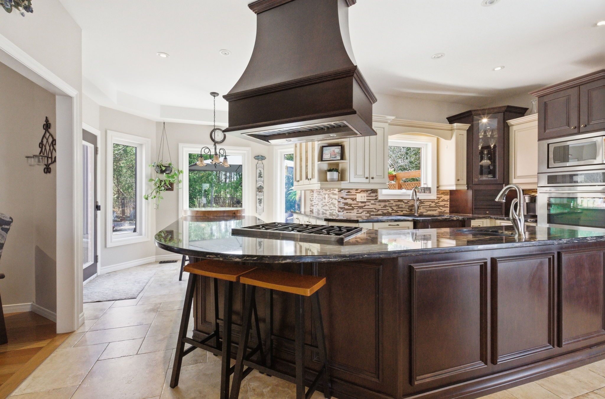 • Backyard oasis with heated pool, custom outdoor kitchen, and expansive deck.