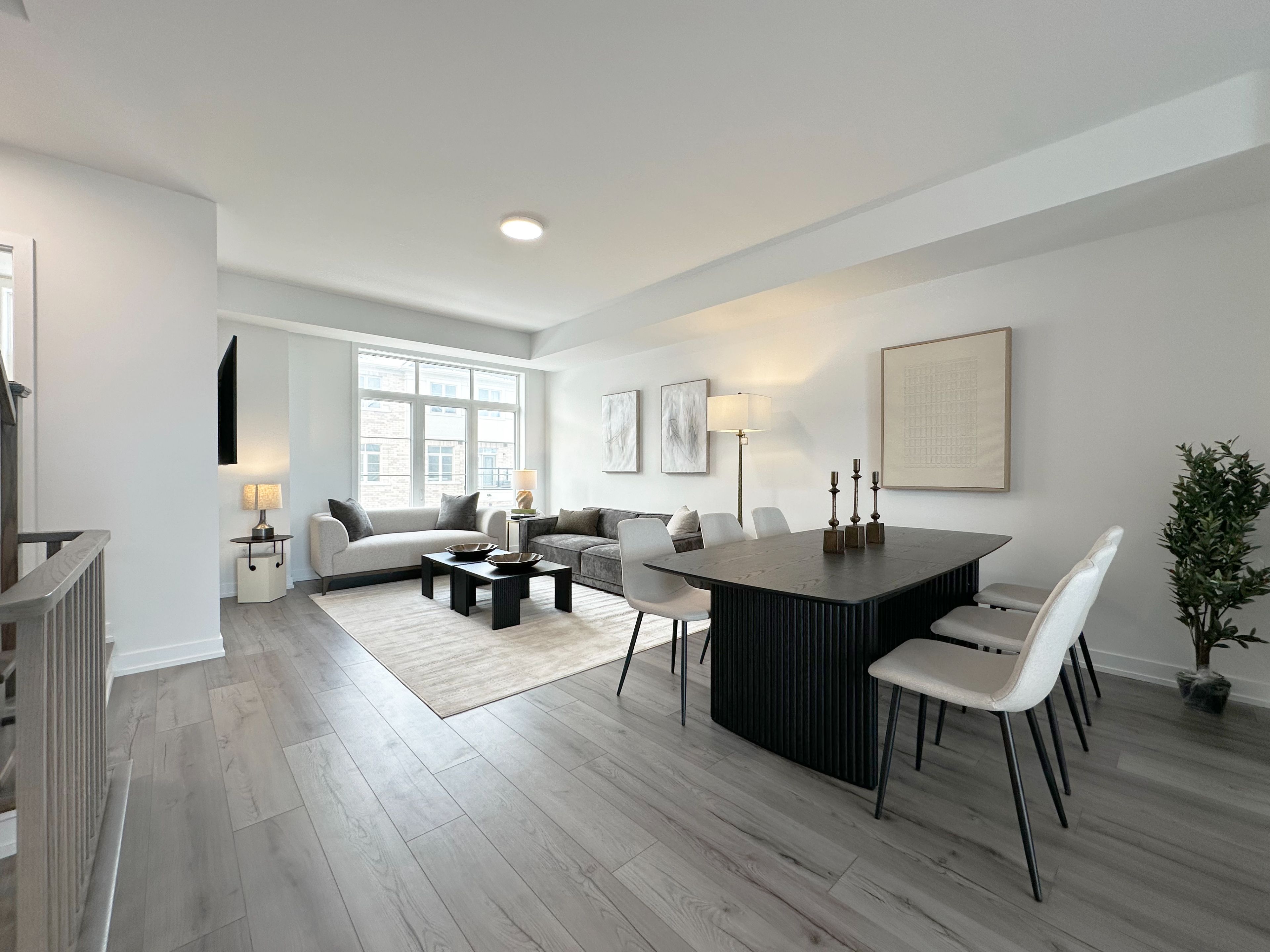 A remarkable home - brand new, never occupied, backed by full tarion warranty. This exceptional 4-bedroom, 3-bathroom plus powder room traditional townhome offers a perfect balance of elegance, comfort, and contemporary living in a welcoming, family-oriented neighbourhood. A private porch and driveway welcome you into a thoughtfully planned layout. The main level includes a generously sized bedroom and full bathroom-an uncommon feature-along with a walkout to a cozy backyard, making it ideal for guests, extended family, or a quiet home office. The centerpiece of the home is the bright, open-concept kitchen, dining, and living space, designed to maximize natural light and provide easy access to a private balcony overlooking the backyard. The kitchen is beautifully appointed with caesarstone countertops, upgraded cabinetry, and a modern tiled backsplash-perfect for everyday cooking and entertaining alike. Designed with attention to detail, the home showcases high ceilings, smooth surfaces, large windows, and stunning stained oak staircases. The third and fourth bedrooms are well-proportioned with oversized windows. The primary bedroom features a spa-inspired ensuite complete with a dual-sided glass shower, while a conveniently located linen closet adds extra storage space. Additional highlights include: multi-zone central air conditioning; a private garage with a full driveway accommodating two vehicles; a premium five-piece appliance package; and generous storage throughout. Perfectly situated close to highways 401 and 407, go transit, schools, healthcare facilities, fitness centres, restaurants, and a marina, this home delivers outstanding accessibility. Nestled within a protected natural heritage setting, it offers the best of both worlds-peaceful surroundings with urban conveniences nearby. Hst is excluded from the purchase price. Buyers may qualify for the government new home hst rebate, subject to applicable eligibility criteria.