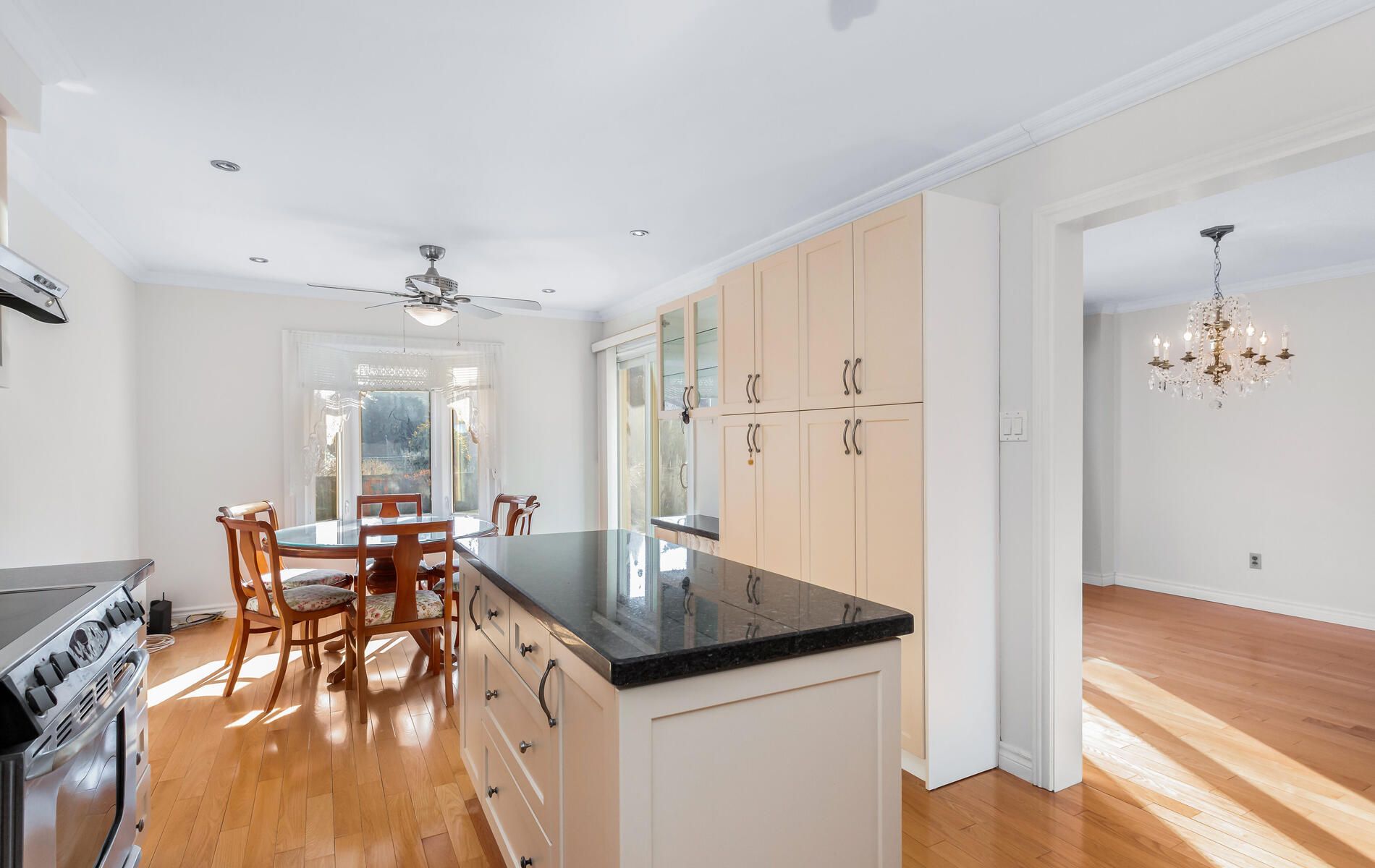 • Granite countertop kitchen with a breakfast area and yard view.