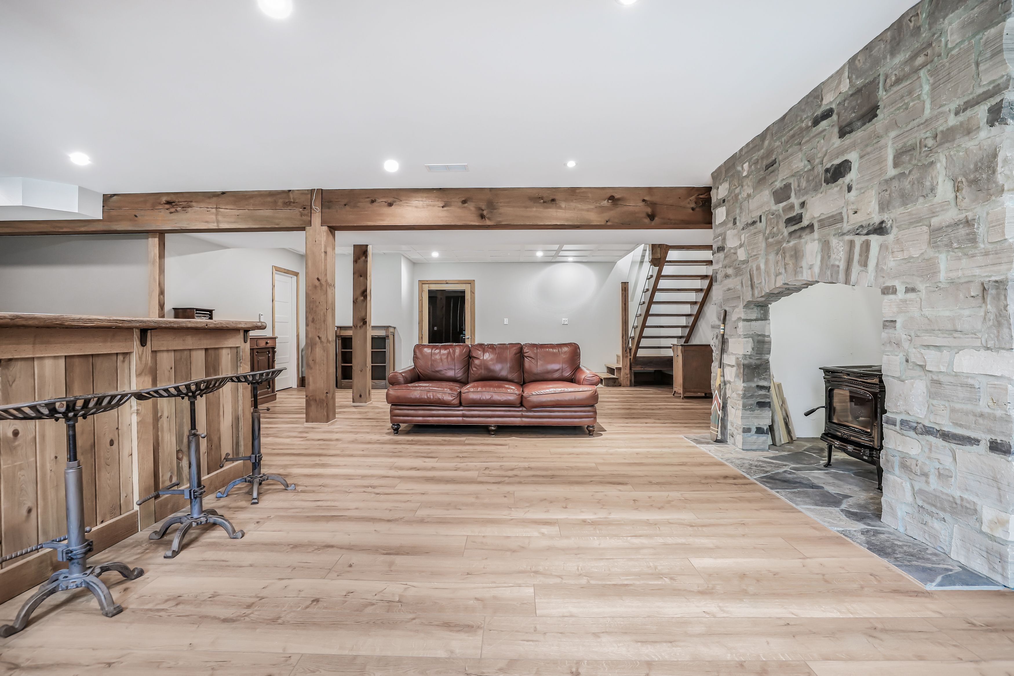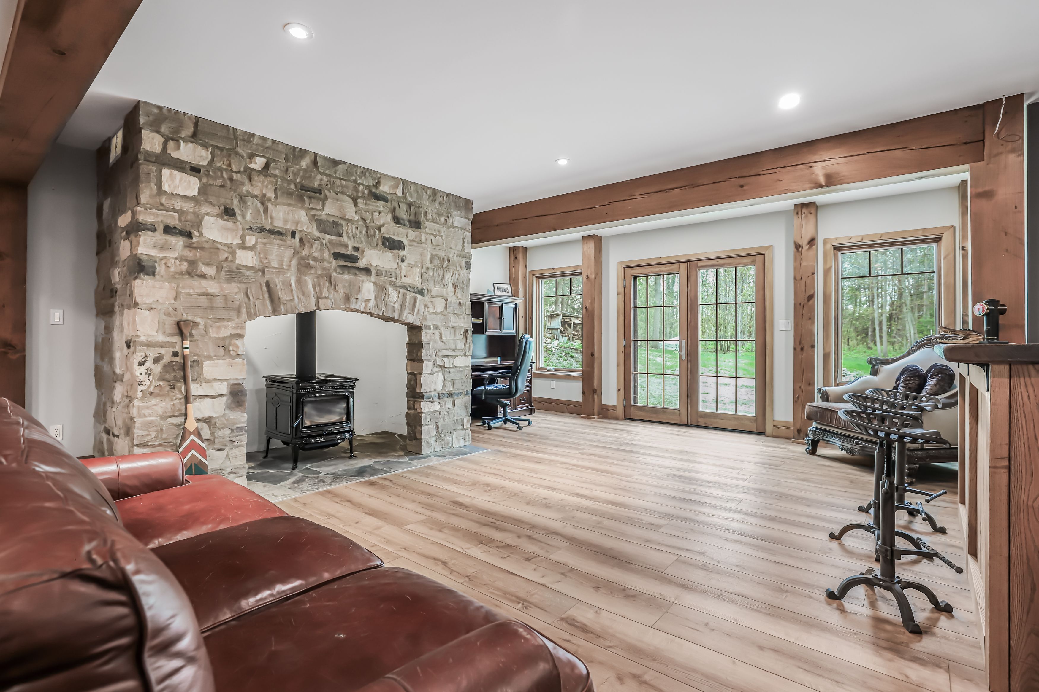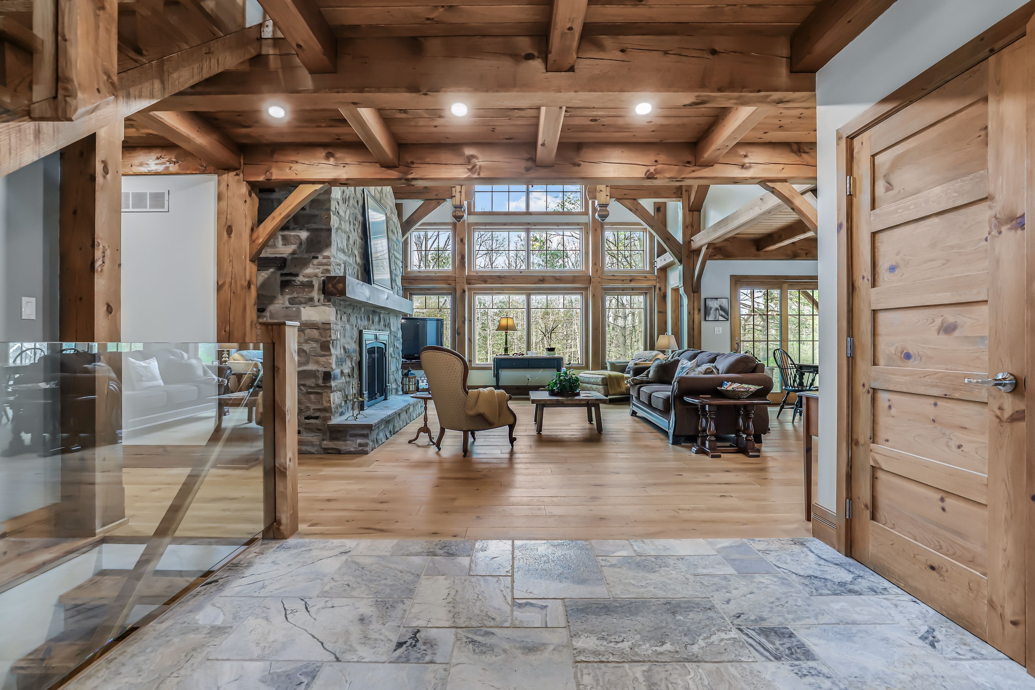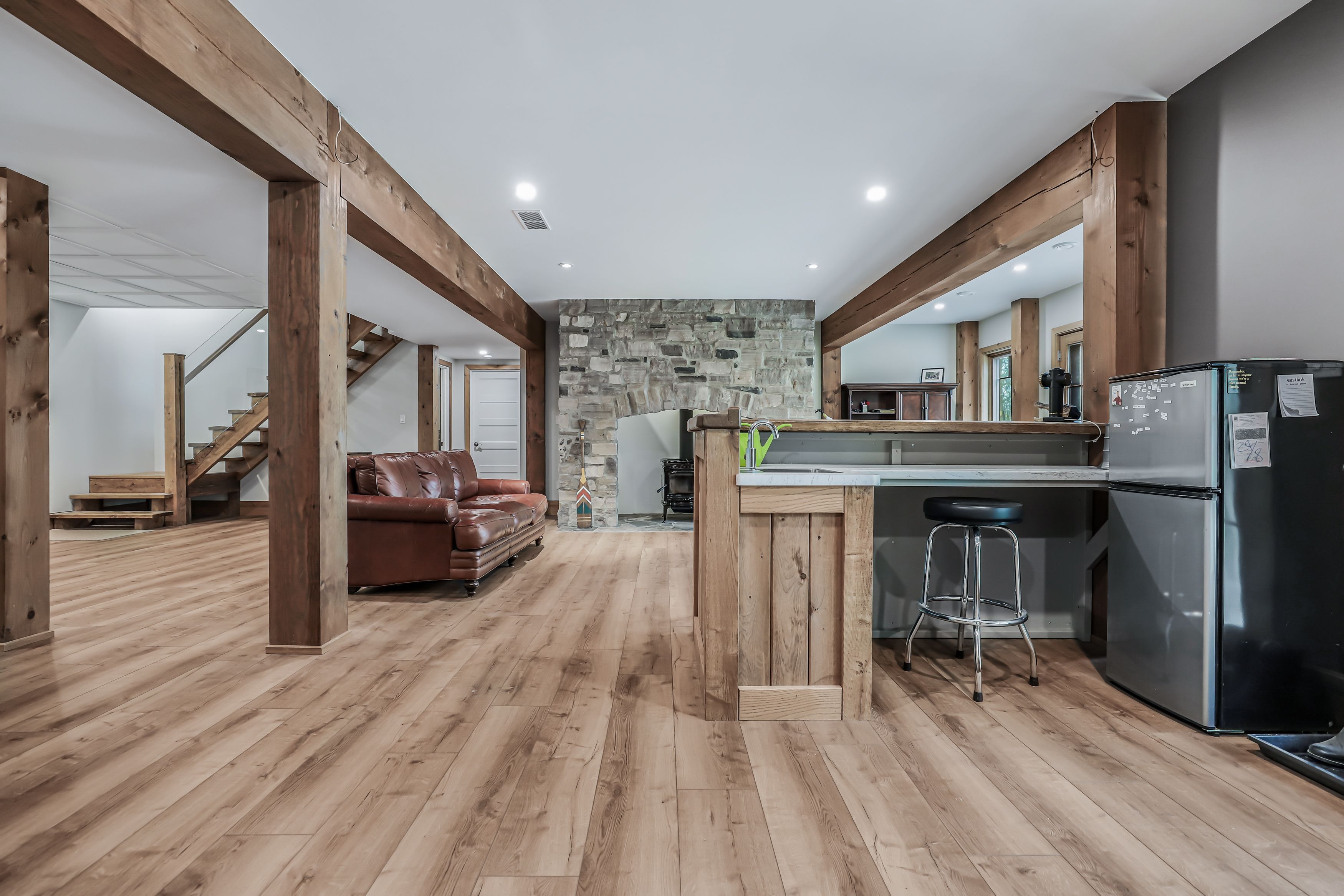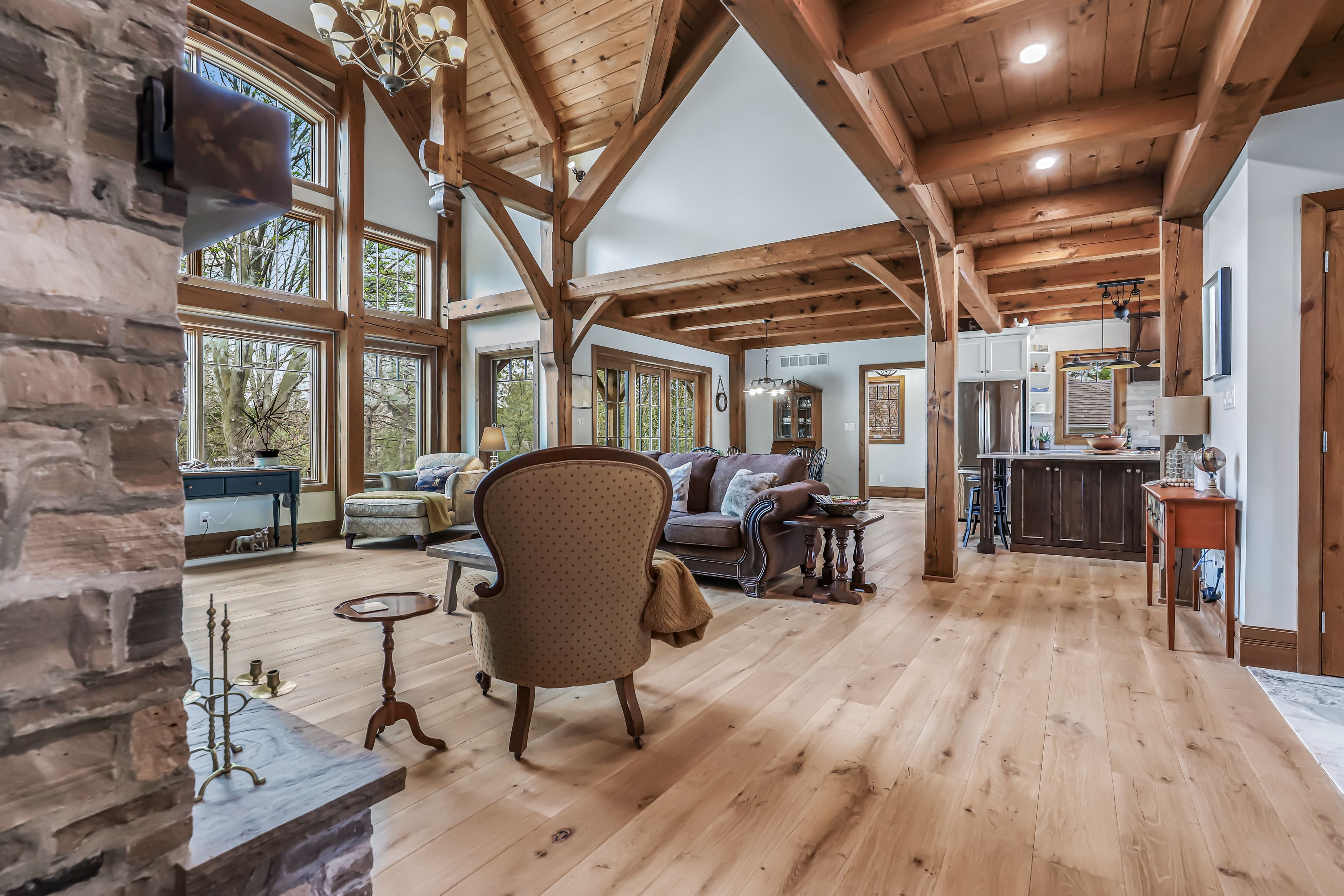 A rare riverfront retreat in southampton. Welcome to a one-of-a-kind timber frame masterpiece nestled on the banks of the saugeen river, just steps from the shores of lake huron. This extraordinary home blends artisan craftsmanship with refined luxury in one of ontario's most coveted locations. From the moment you step into the grand foyer, you're greeted by a stunning interplay of natural elements rich timber beams, elegant tile, and soaring glass. The dramatic living room is the heart of the home, where cathedral ceilings and exposed hammerbeam trusses frame a floor-to-ceiling stone fireplace. Sunlight floods the space through expansive windows, creating a warm and inviting ambiance. The chefs kitchen is an entertainers dream, with a generous central island that seats five, gleaming quartz countertops, and exquisite cabinetry with custom pot drawers and glazed uppers. Host elegant dinners in the dining room, or step onto the raised balcony to dine alfresco with views of your private, treed backyard. The main floor primary suite is a tranquil escape featuring its own secluded balcony, a lavish 5-piece spa-inspired ensuite with freestanding soaker tub, glass walk-in shower, double vanity, and a generous walk-in closet. Upstairs, a glass-railed loft overlooks the living room, flanked by two private bedrooms and a luxurious central bath. The fully finished lower level offers even more indulgence: a radiant-heated family room with stone hearth wood stove, wet bar, walk-out patio access, a spacious bedroom, full bath, exercise room, and a wine-lovers dream cold room. Just steps from pioneer park, the riverfront harbour, and southampton's charming downtown, this home offers an unparalleled lifestyle of beauty, privacy, and prestige.