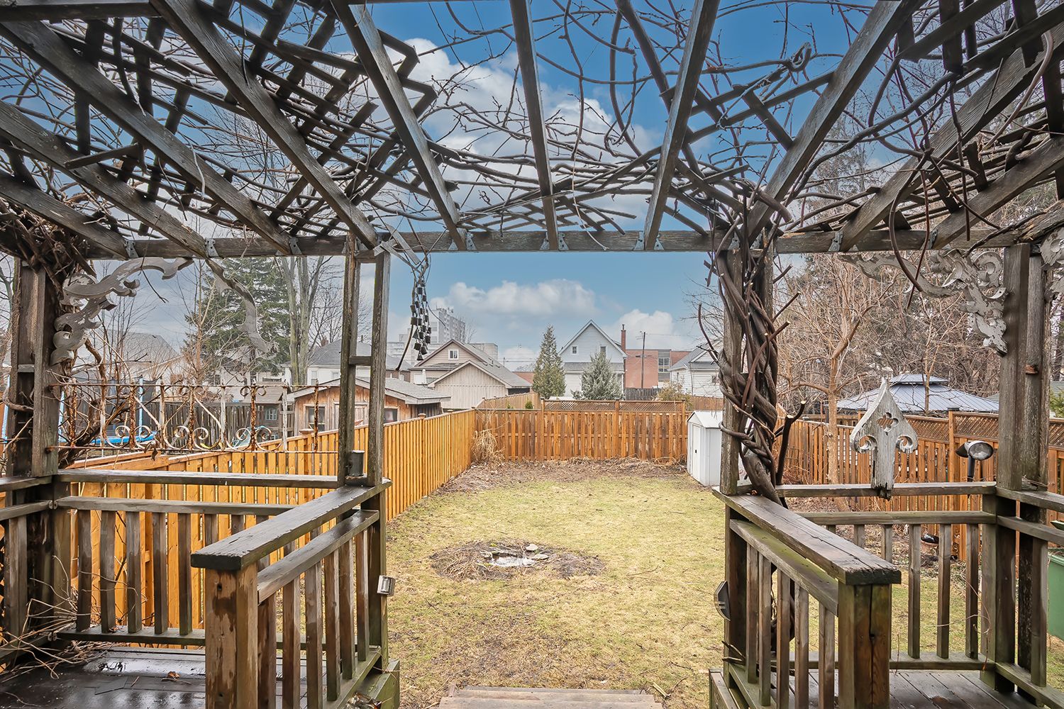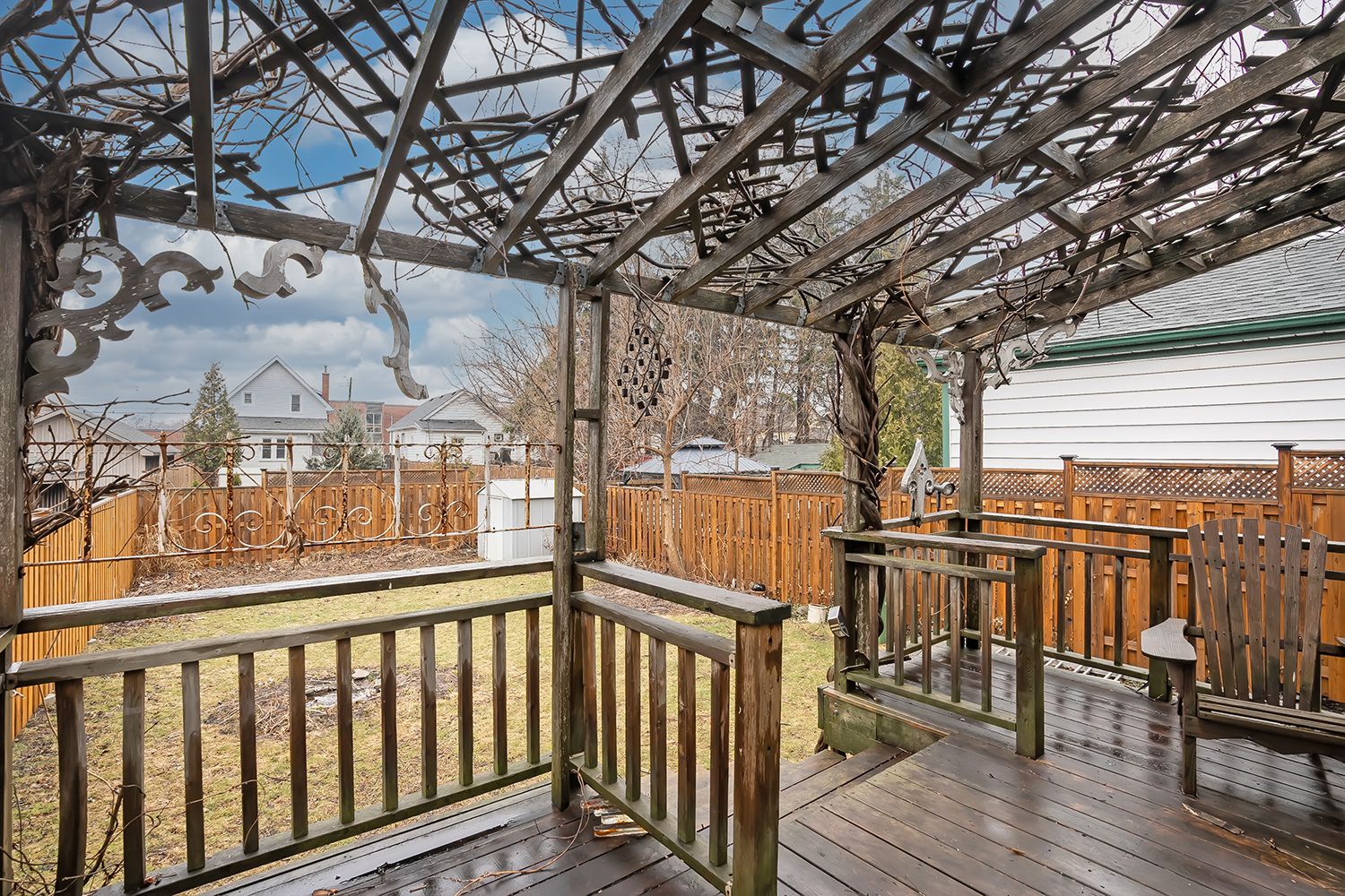 • Kitchen features a walk-out deck with pergola and mature vines.