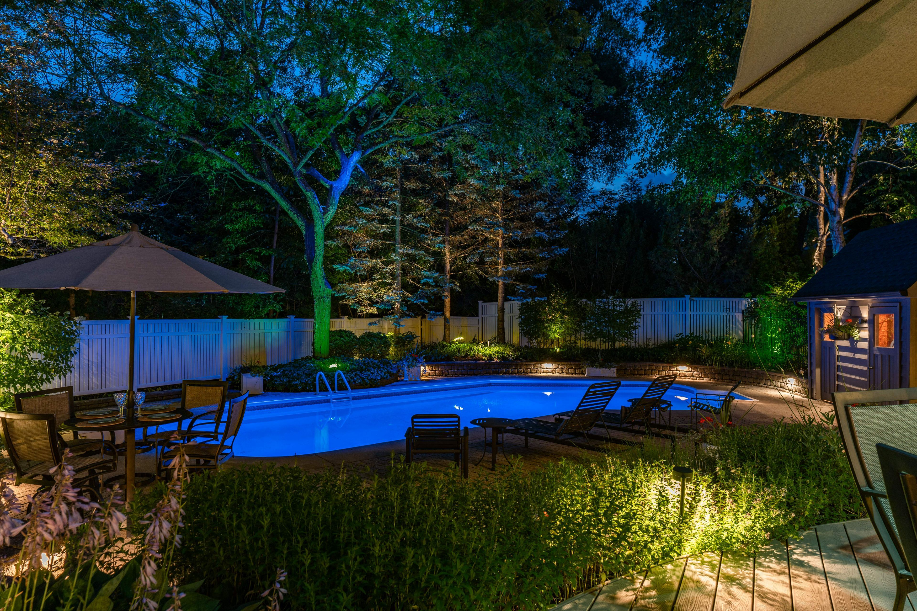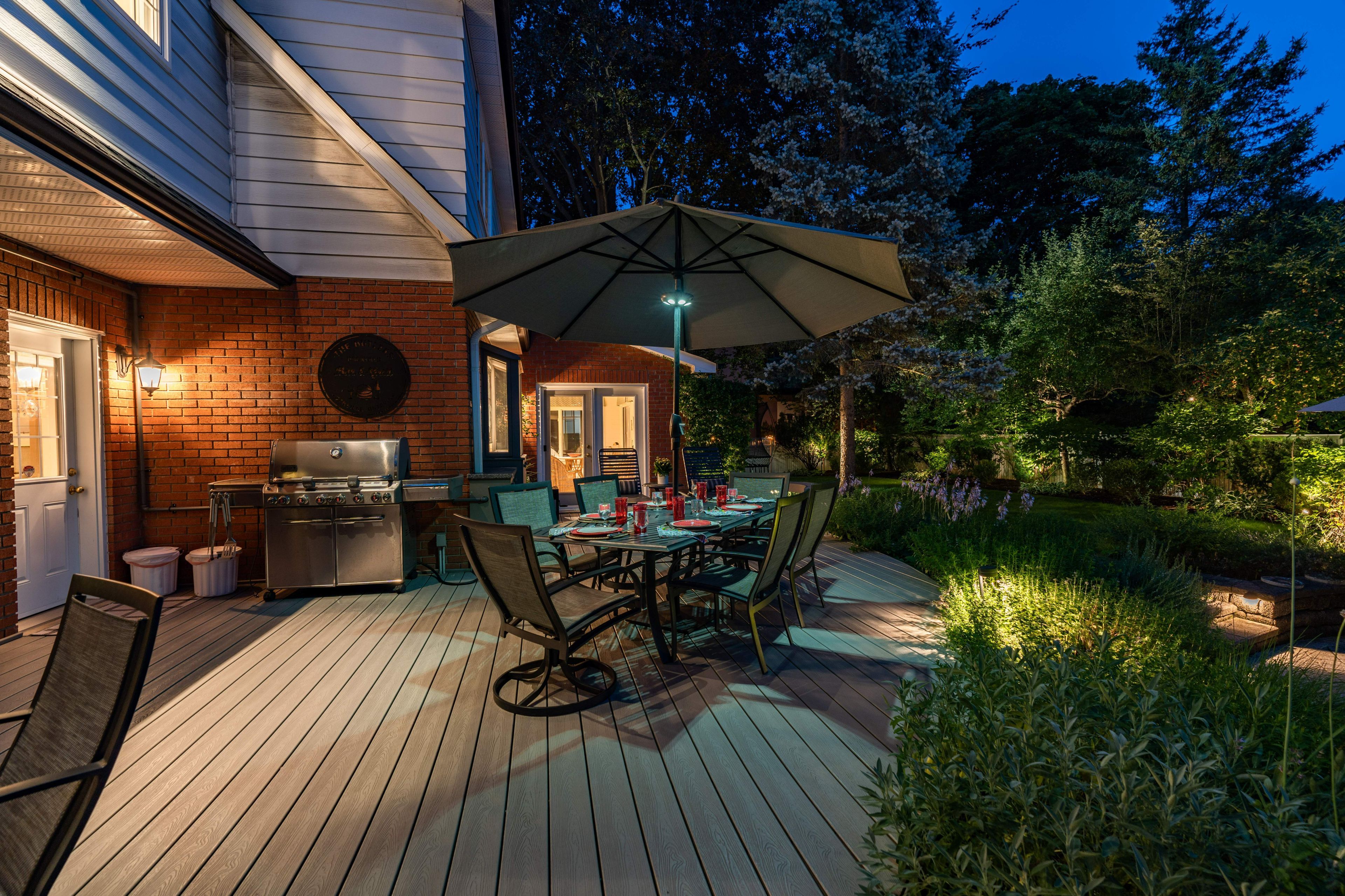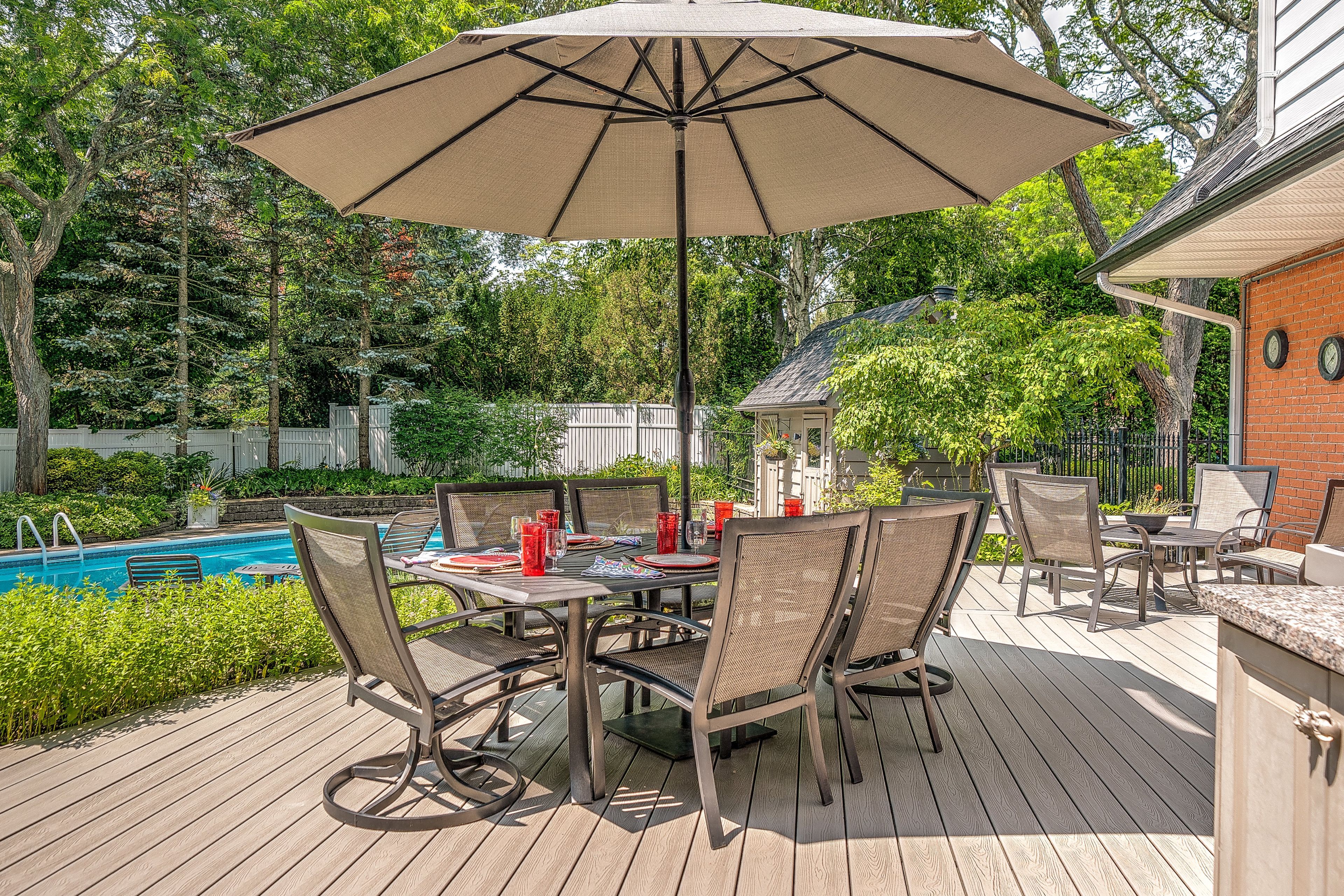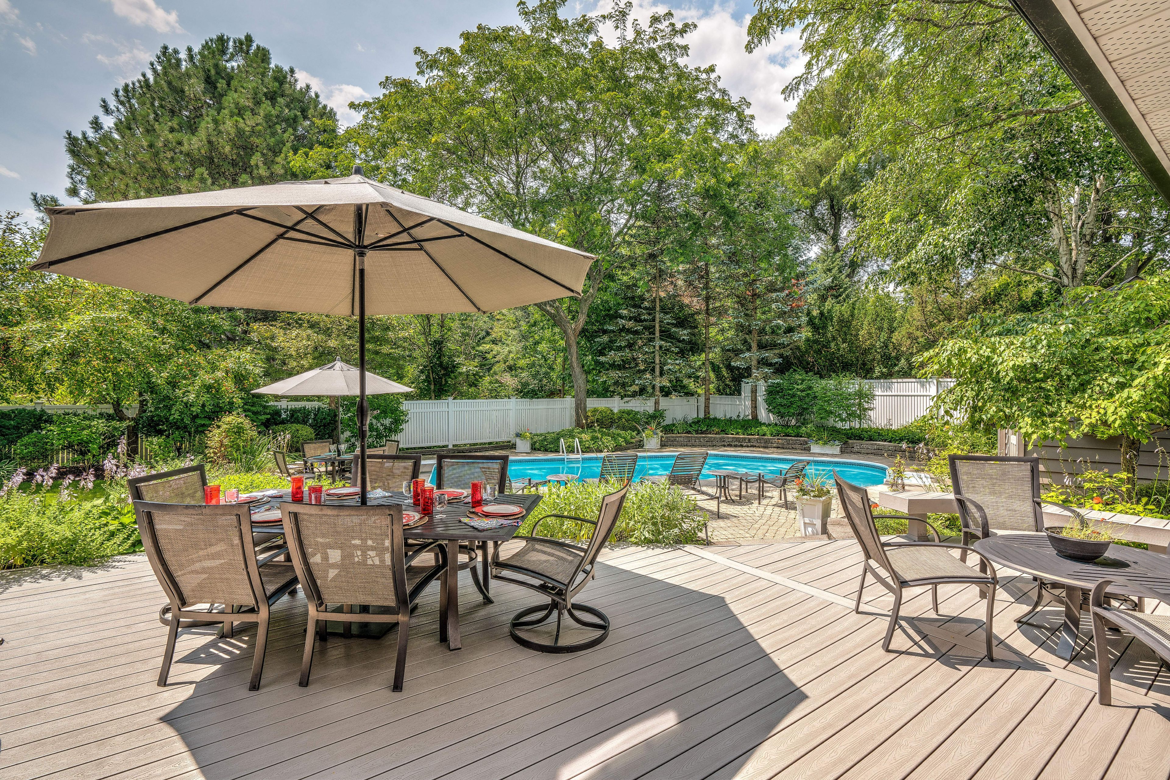 • Backyard oasis features a pool, multi-level deck, and patio for relaxation.