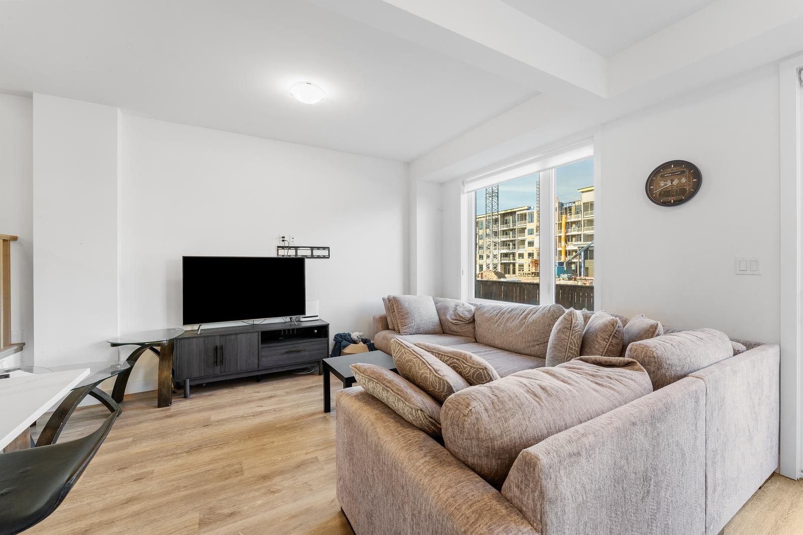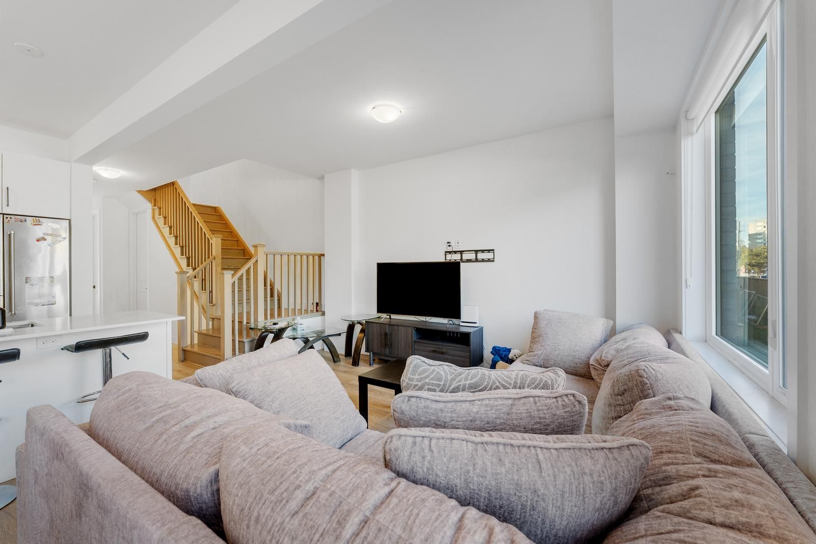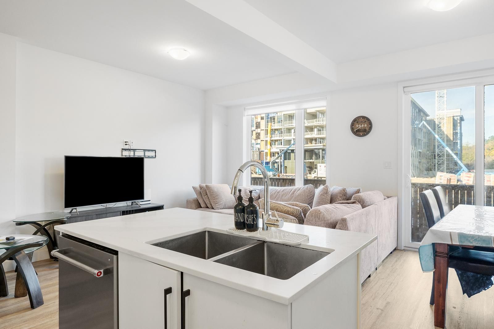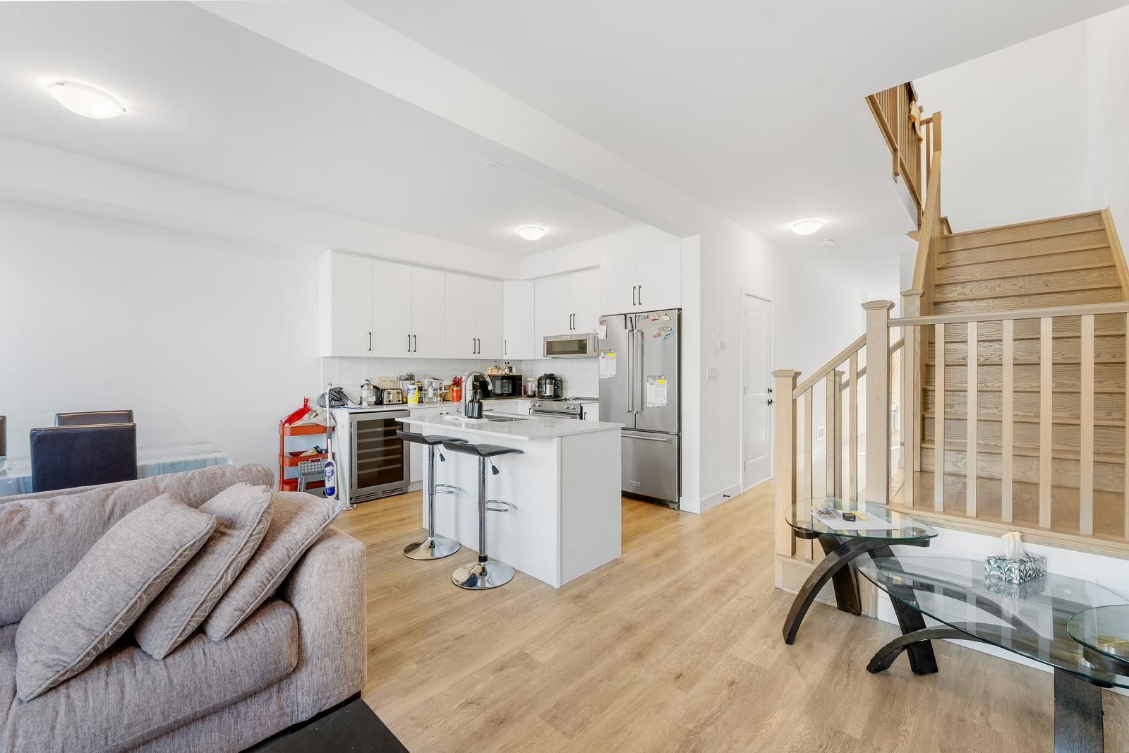 Priced to sell!!! Welcome to your dream home! This stunning 3-bedroom, 2. 5-bathroom townhouse boasts an exceptional two-storey layout designed for modern living. Step inside and be captivated by the soaring 9-foot ceilings and expansive foot doors that create an open, airy atmosphere. The luxurious vinyl hardwood flooring flows seamlessly throughout the main level, enhancing the stylish open-concept living and dining areas. The contemporary kitchen features sleek white cabinetry, stainless steel appliances, and a convenient wine fridge, all complemented by elegant quartz countertops. Retreat to the master suite, where you'll find a spacious 4-piece ensuite complete with a relaxing soaker tub, a unique shower, and a generous walk-in closet. The two additional bedrooms are equally spacious, offering ample closet space and comfort. Convenience meets practicality with upper-level laundry, making chores a breeze. The unfinished basement presents endless possibilities for customization to fit your lifestyle. Dont miss the opportunity to make this exquisite townhouse your new home!