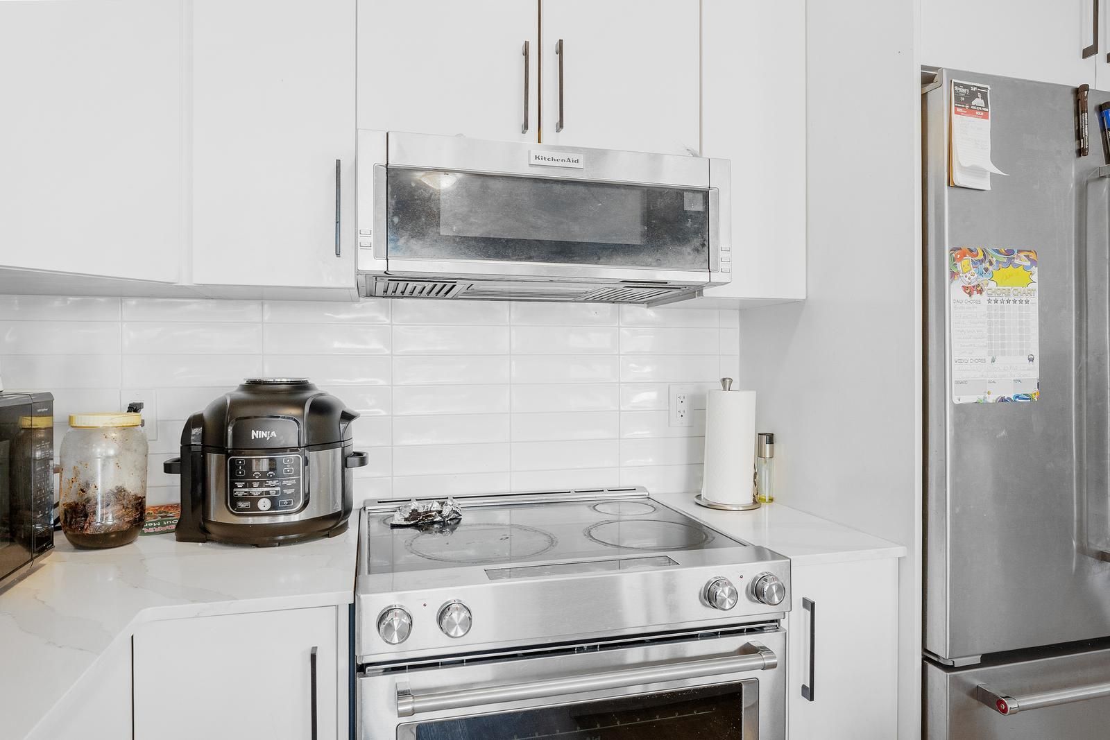 • Stylish kitchen featuring stainless steel appliances and quartz countertops.