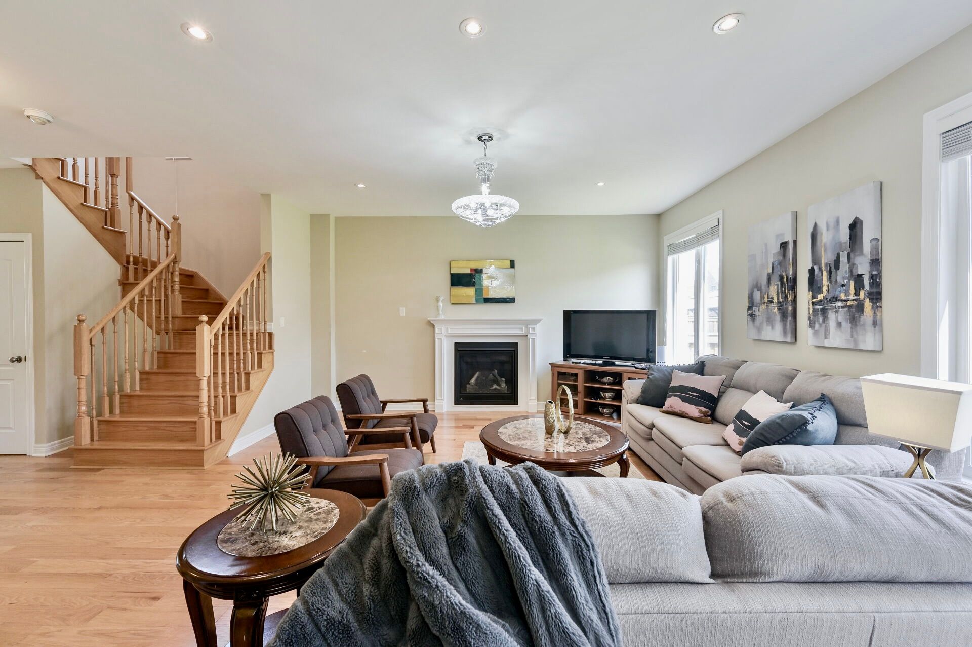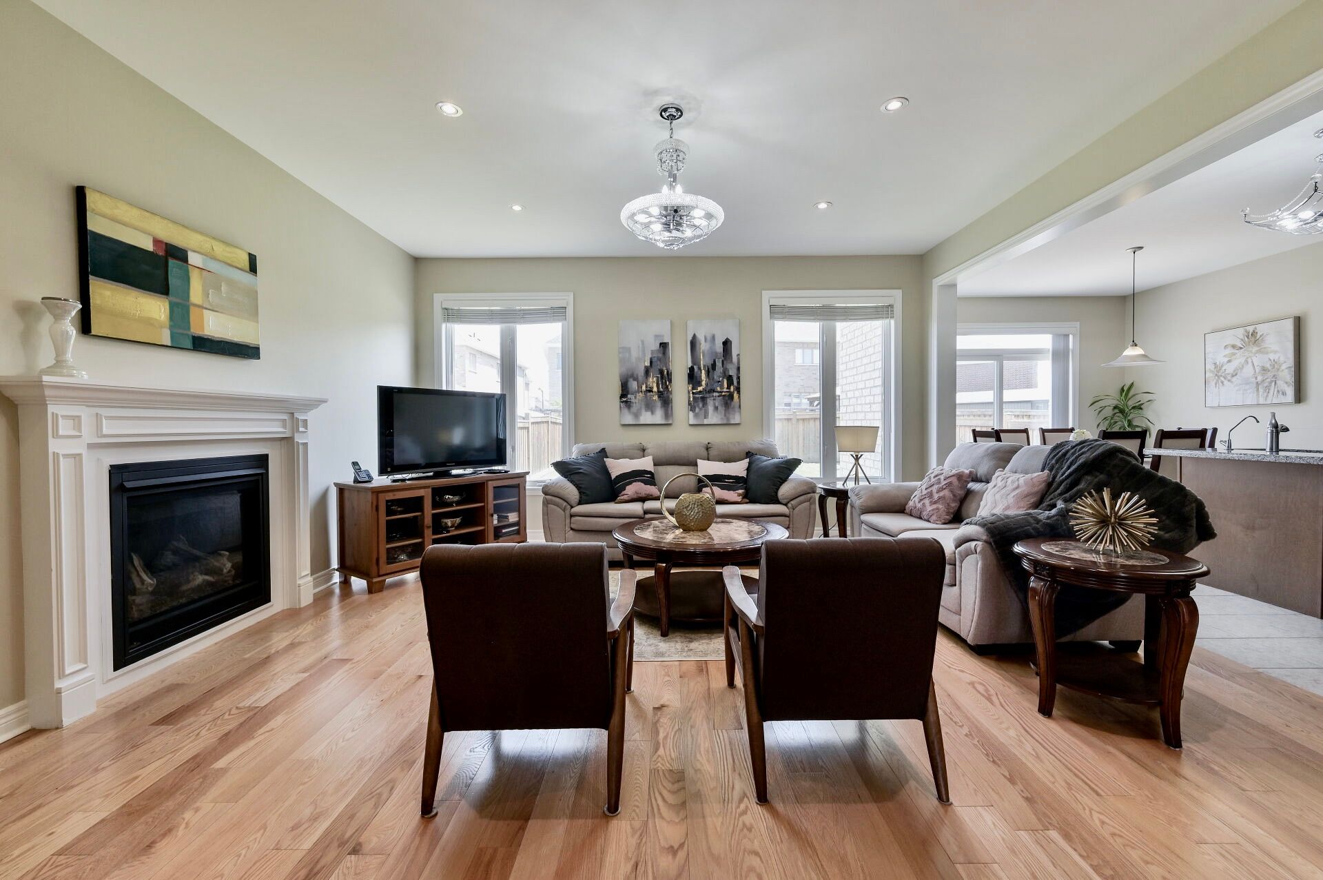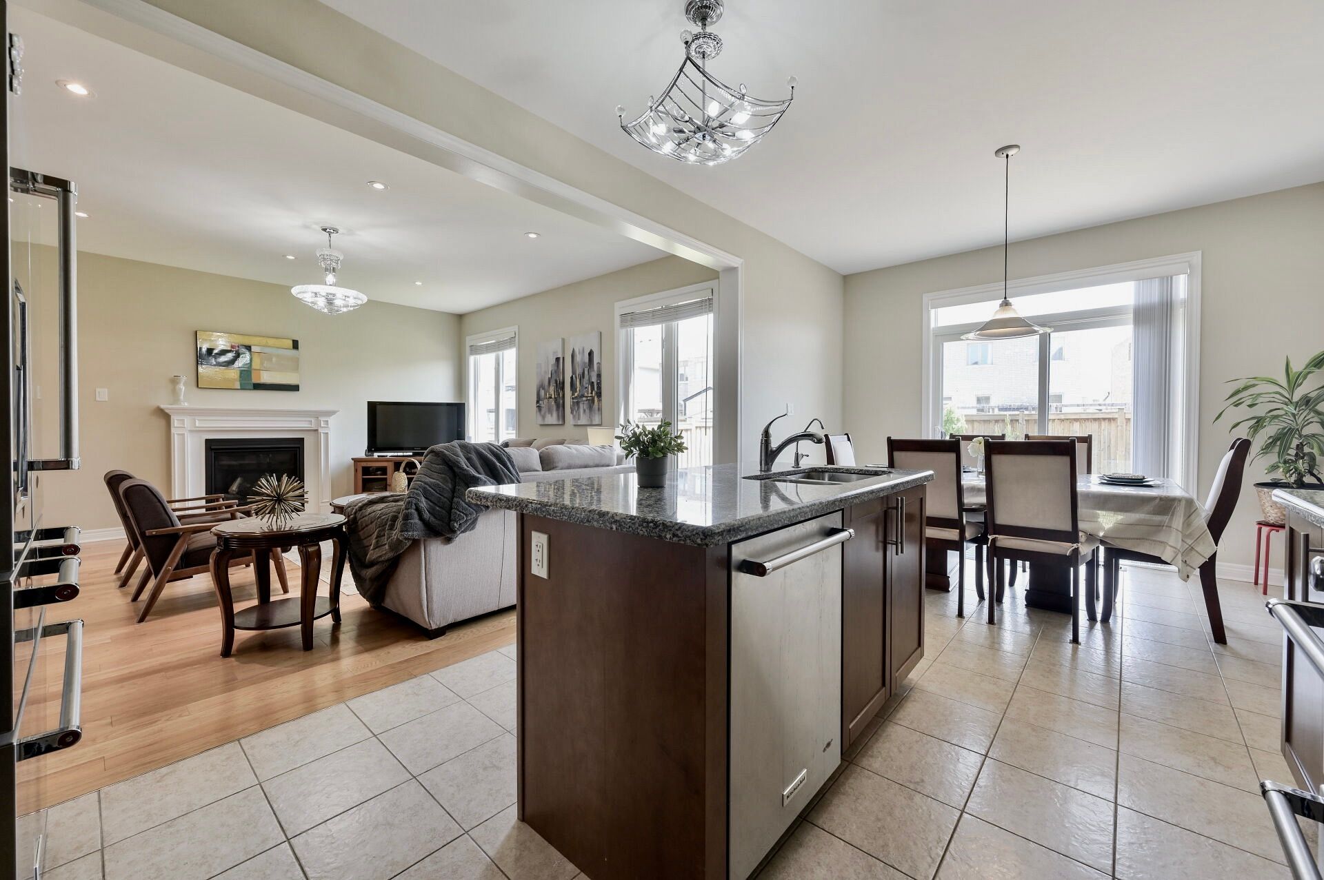 • Bright open-concept layout with a cozy gas fireplace.