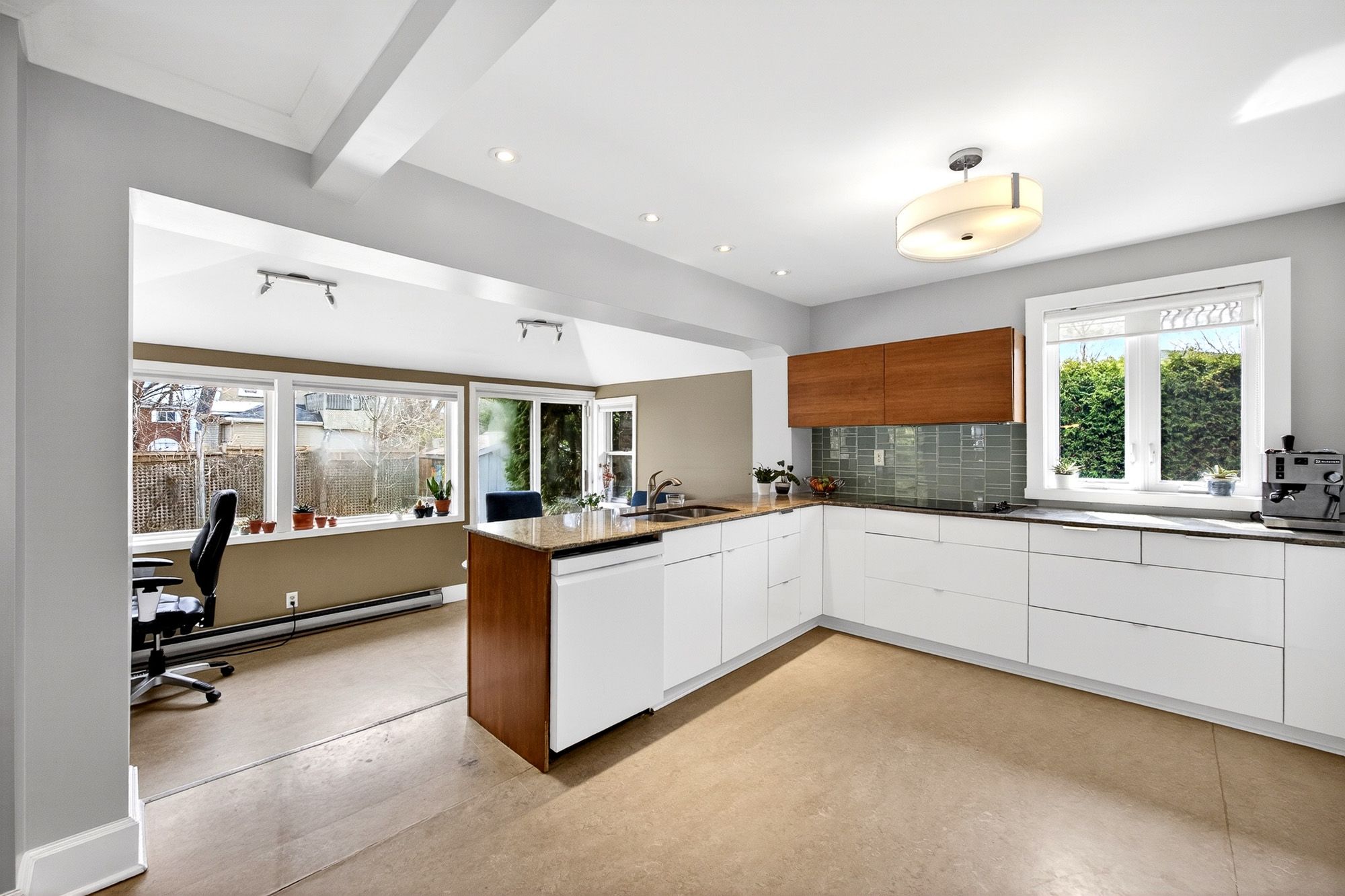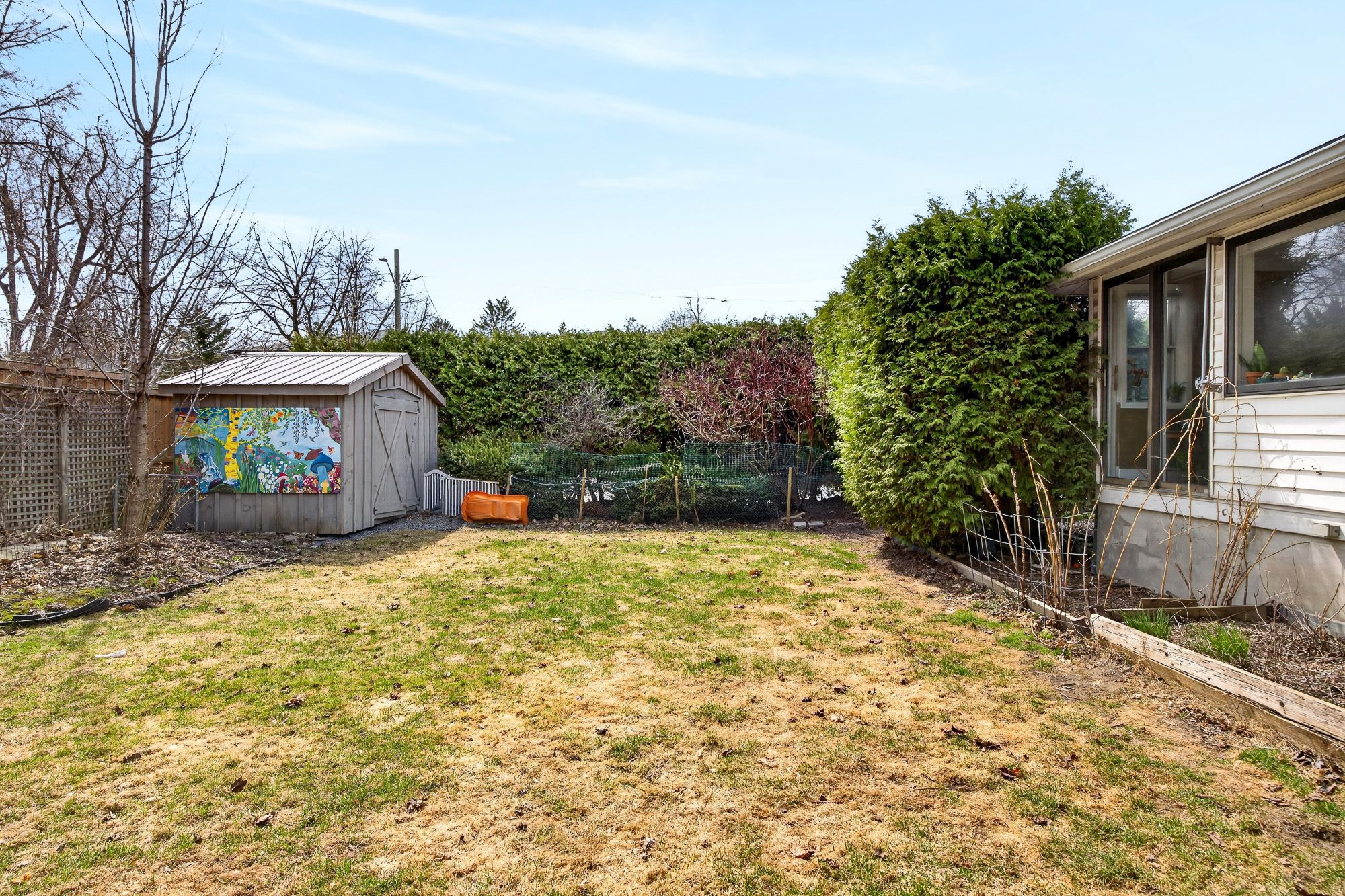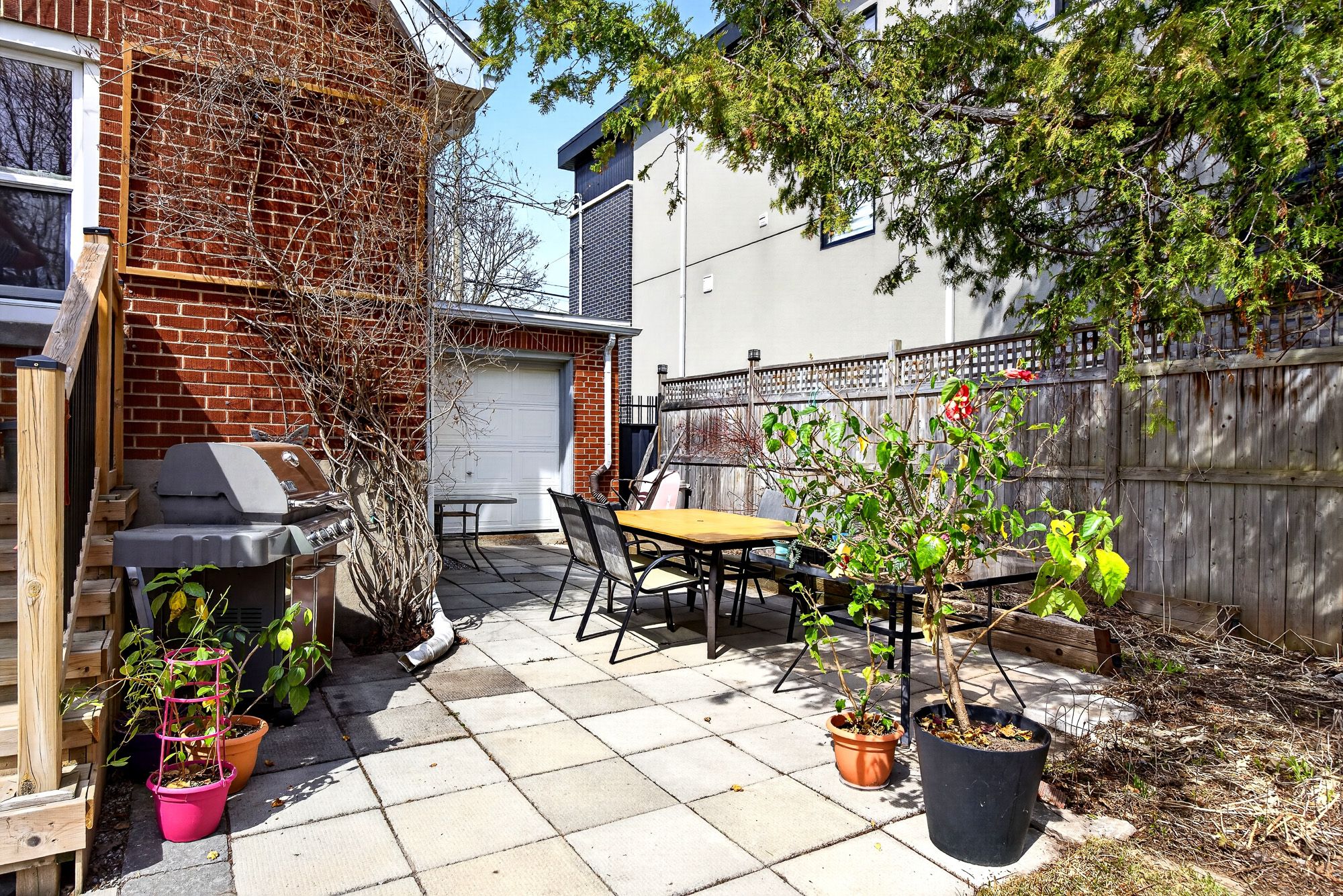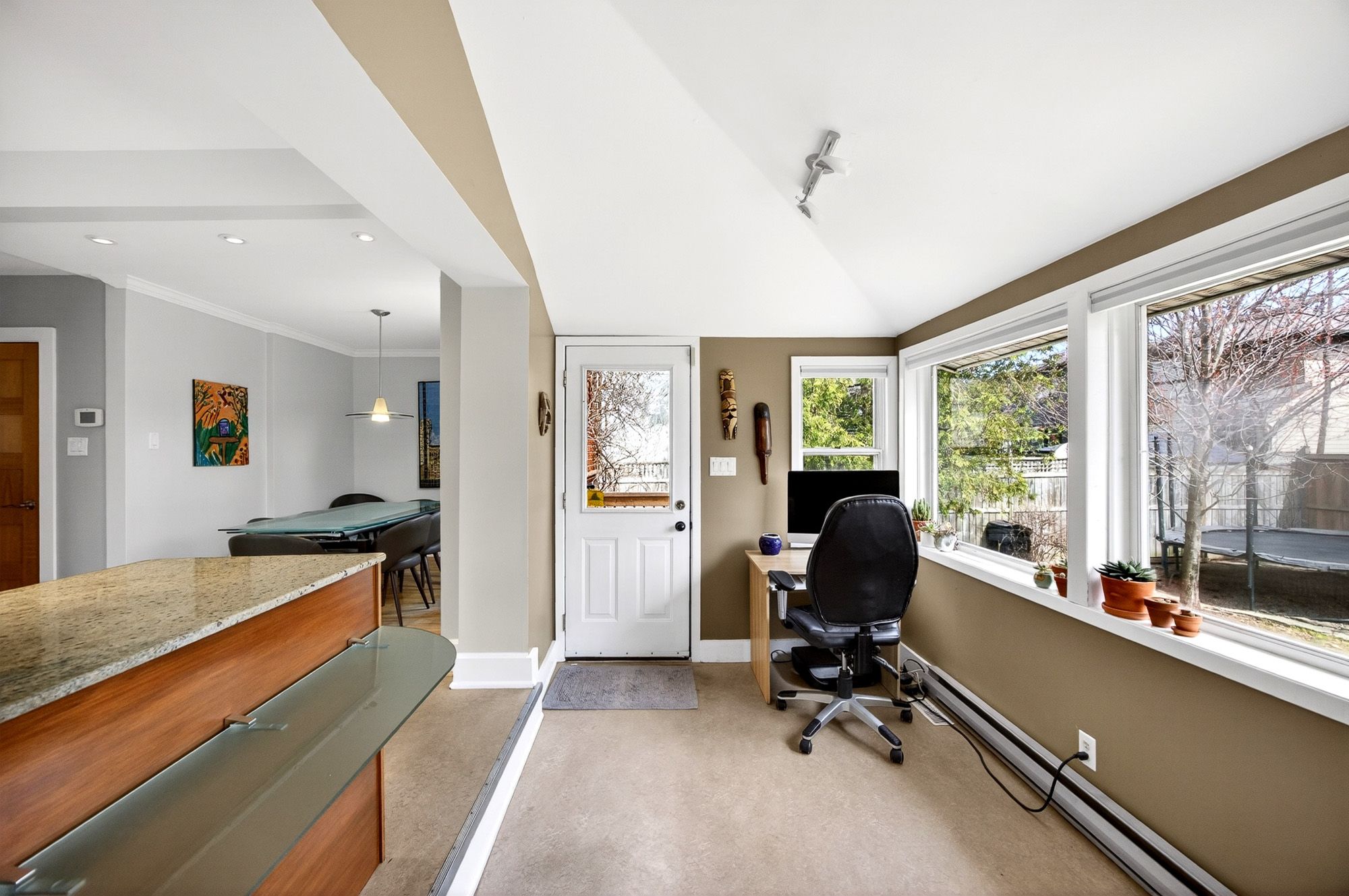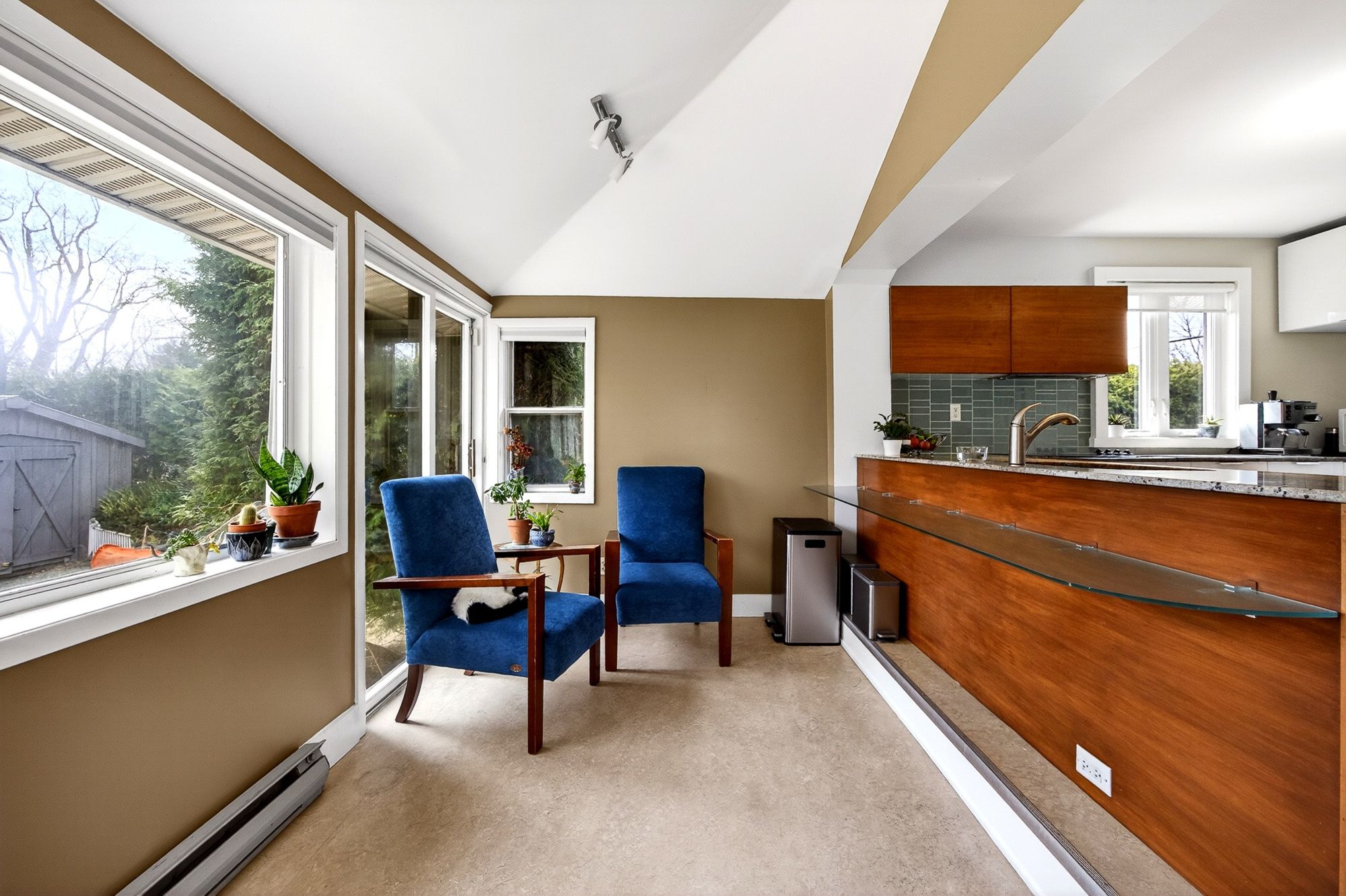 • Bright sunroom overlooks private backyard with mature gardens.