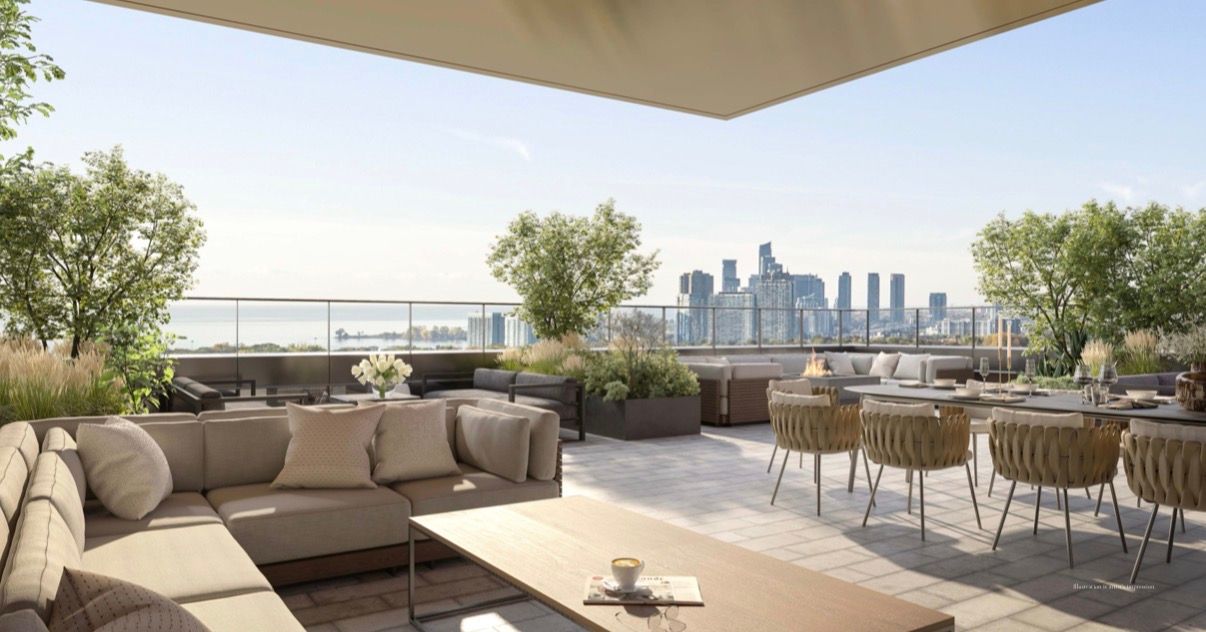 • Building amenities include a gym, party room, and a rooftop terrace with views.