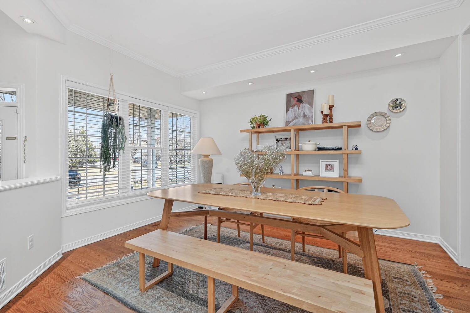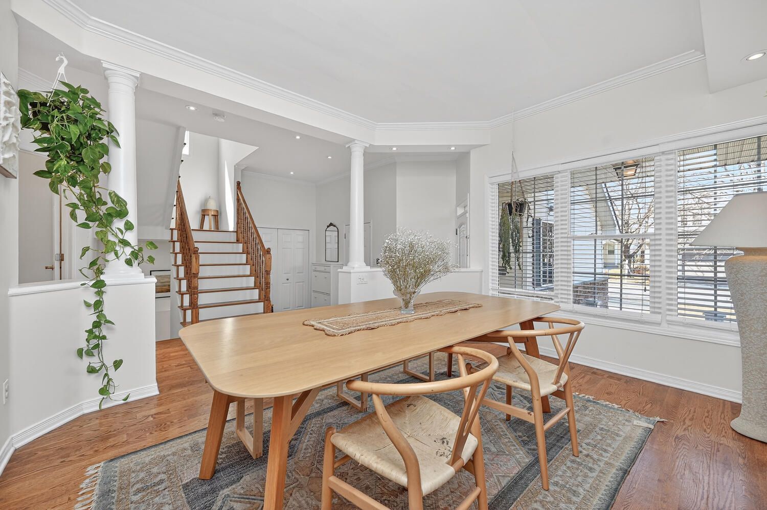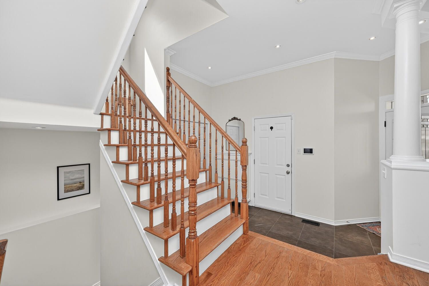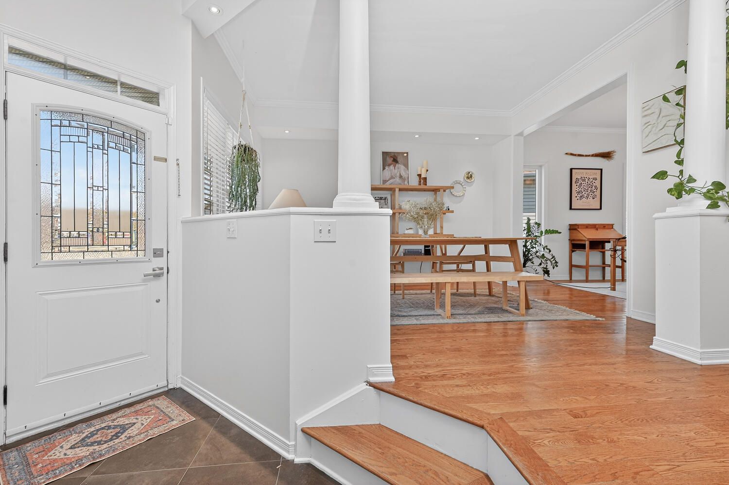 • Bright foyer leads to elegant rooms with hardwood flooring and large windows.