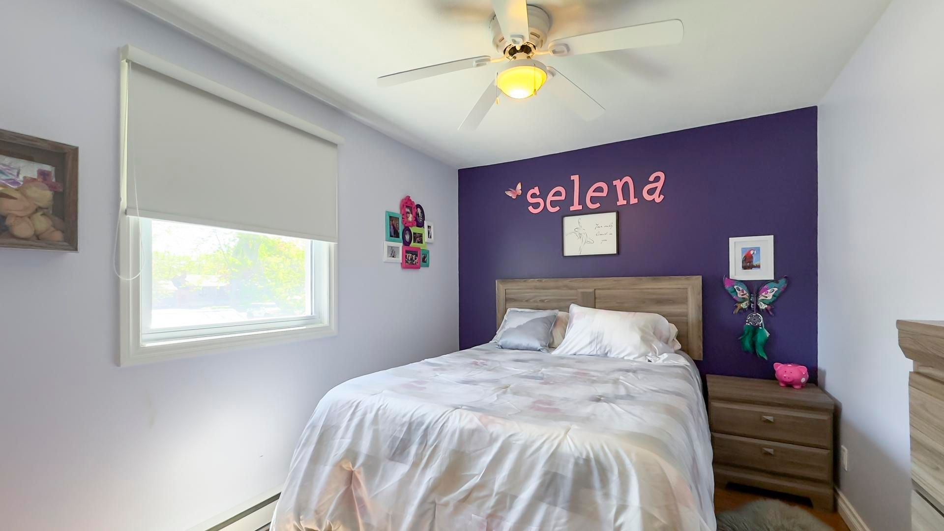 • Spacious living room with natural light and cozy gas fireplace.