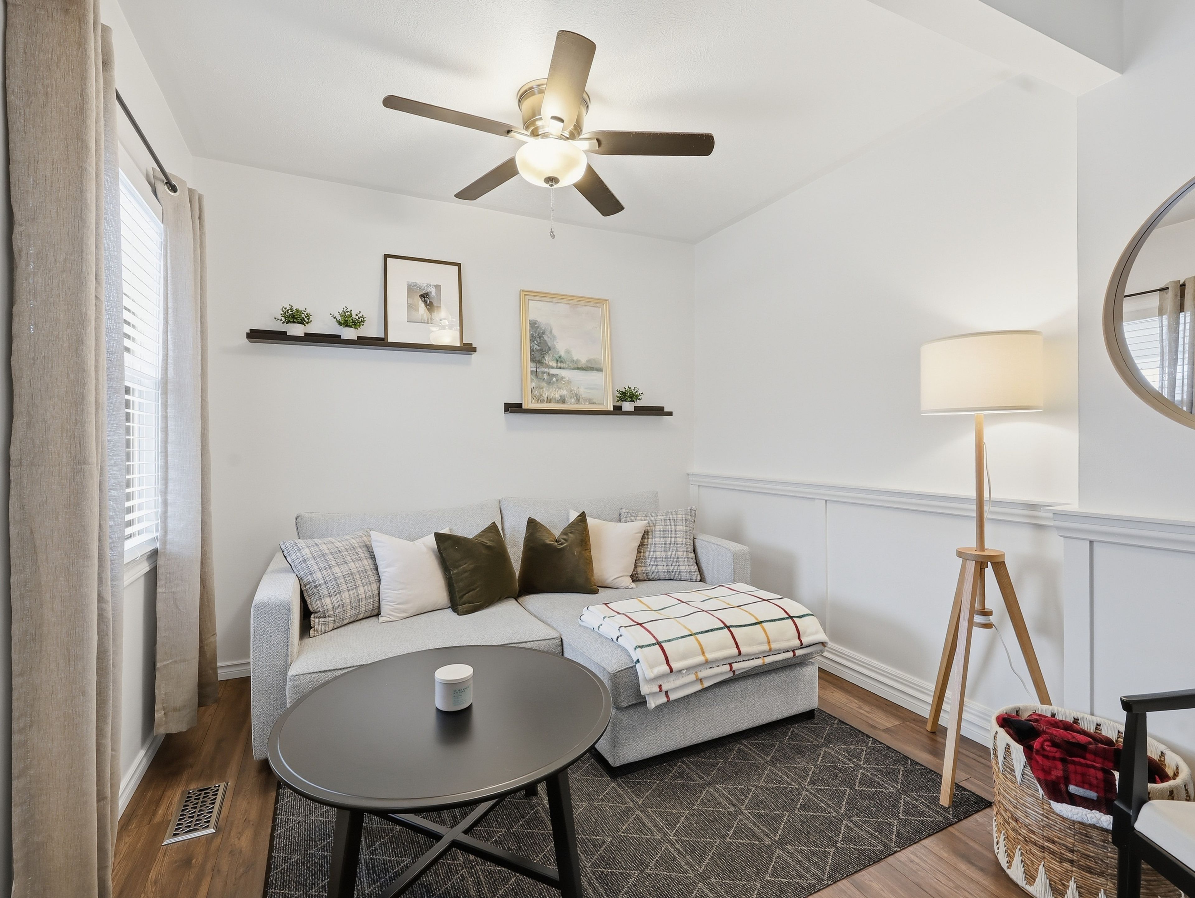 Welcome to this beautifully updated bungalow, where charm meets modern comfort. From the moment you arrive, the adorable wraparound porch sets the tone; inviting, stylish, and full of character. Step inside and you're immediately struck by the warmth of the living space, featuring a stunning stone fireplace with custom built-ins on either side, complete with accent lighting. It's the perfect cozy spot to unwind. The open-concept layout flows seamlessly into a thoughtfully updated kitchen, showcasing a large 8-foot island, newer cabinetry, stainless steel appliances, and a gas stove, truly a space you won't want to leave. A large pantry with built-in shelving offers plenty of storage, while the adjacent dining area features a charming coffee nook and sliding doors leading to the backyard, ideal for easy bbq access. The main level also offers a freshly updated bathroom and two generously sized bedrooms, providing comfortable and functional living. Downstairs, the finished basement expands your living space with a spacious rec area, complete with extensive wall-to-wall built-in shelving and a versatile utility room. Outside, enjoy a fully fenced backyard featuring a great-sized deck with a gazebo and a shed, perfect for relaxing or entertaining. This home is full of warmth, style, thoughtful updates and close to the highway for those commuters. Come see it before it's gone!