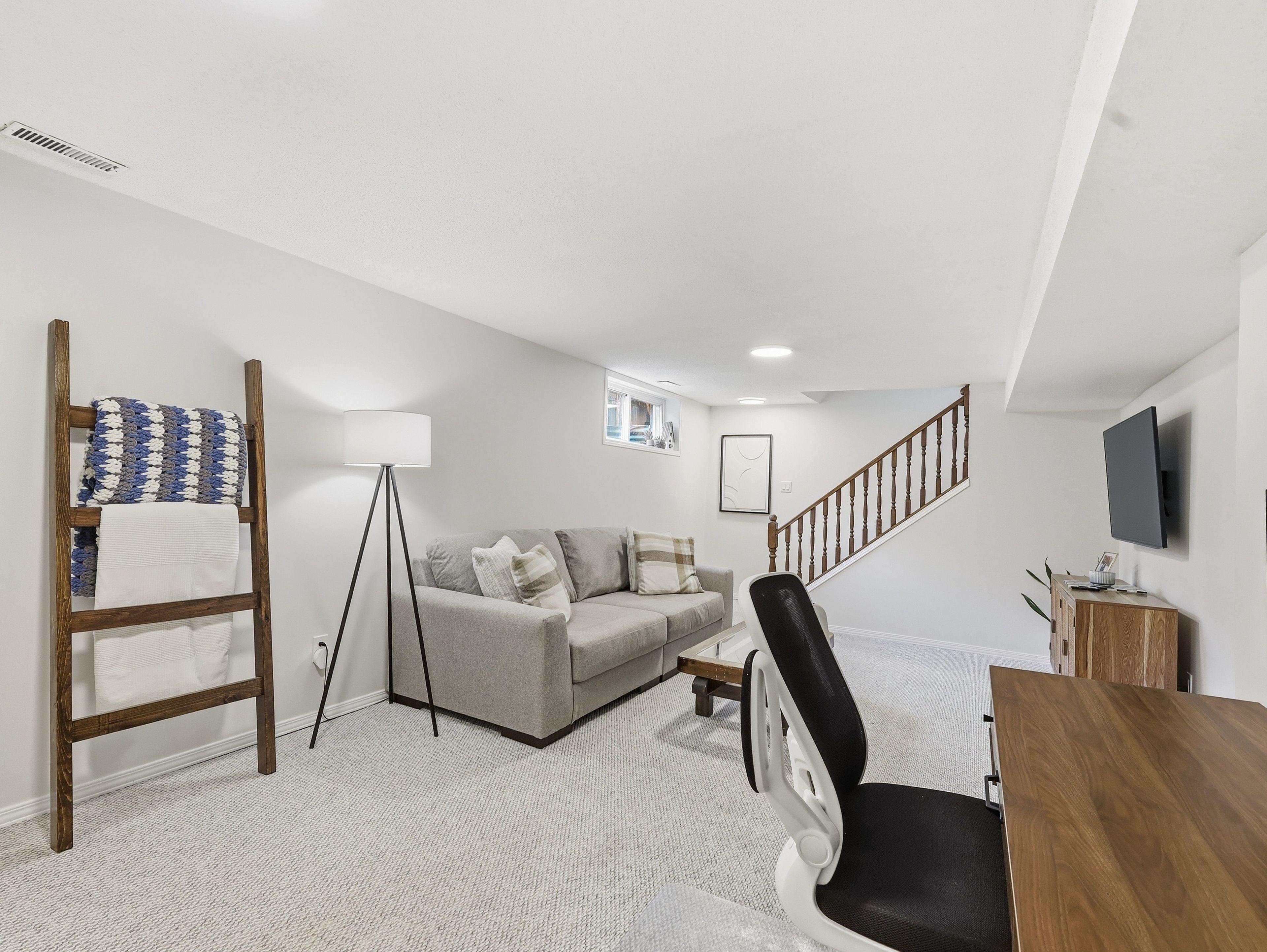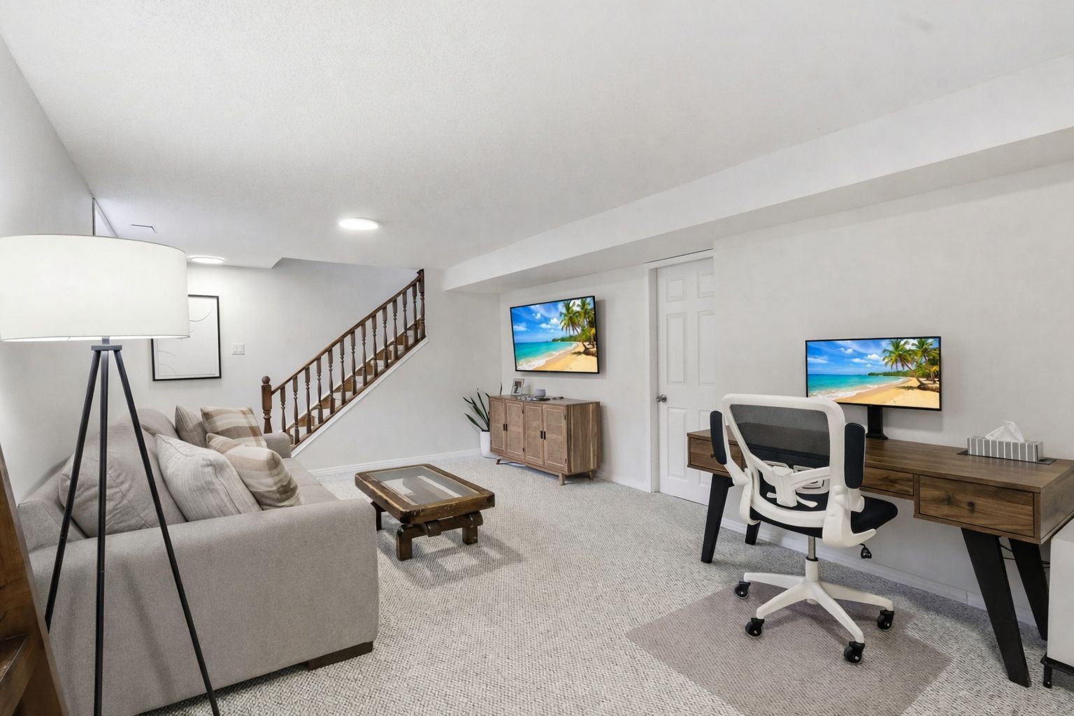 • Cozy living space featuring a stone fireplace and custom built-ins.