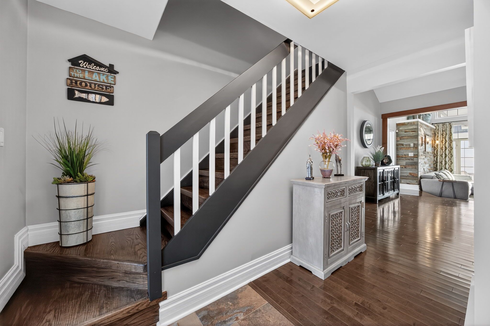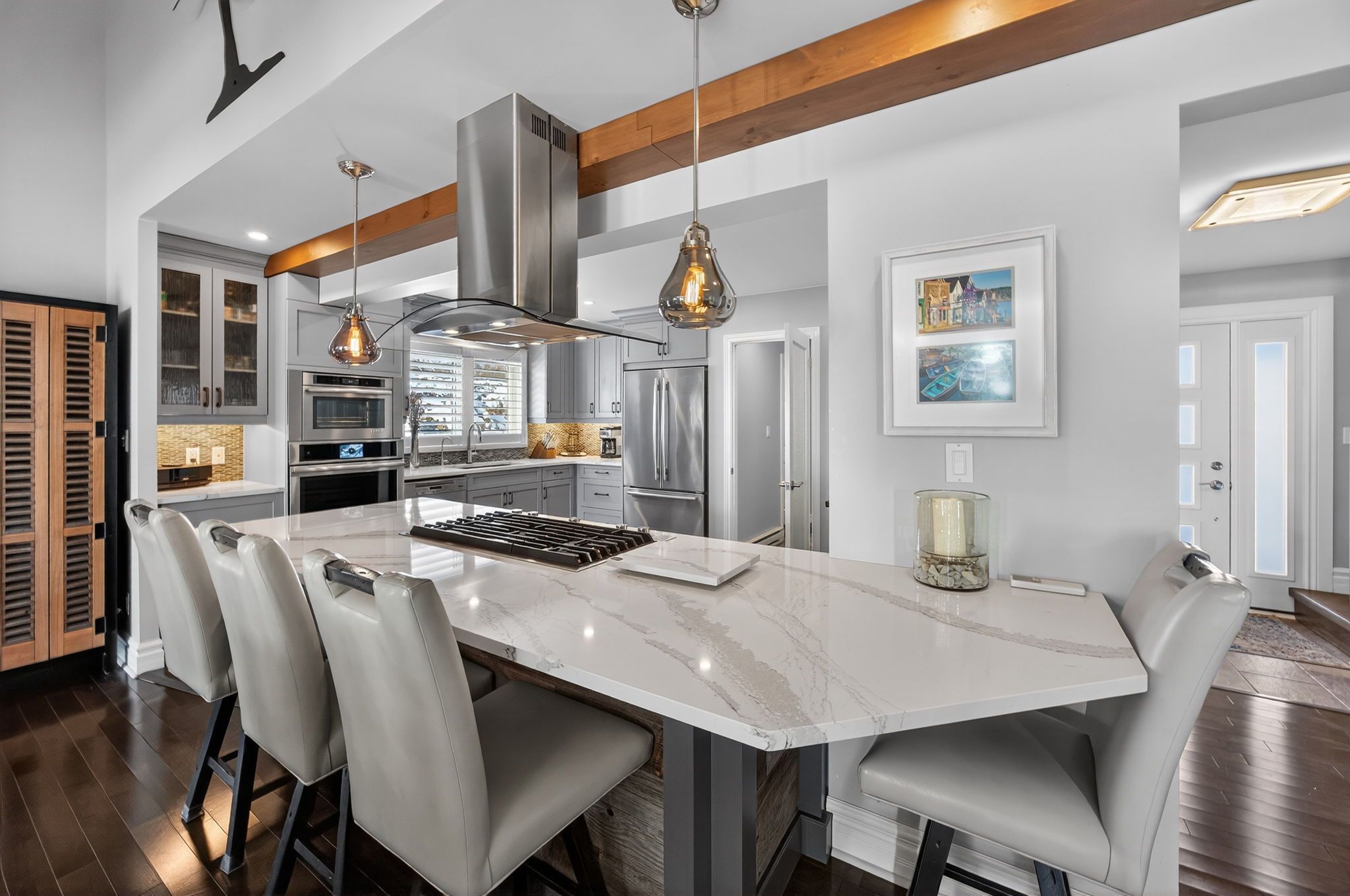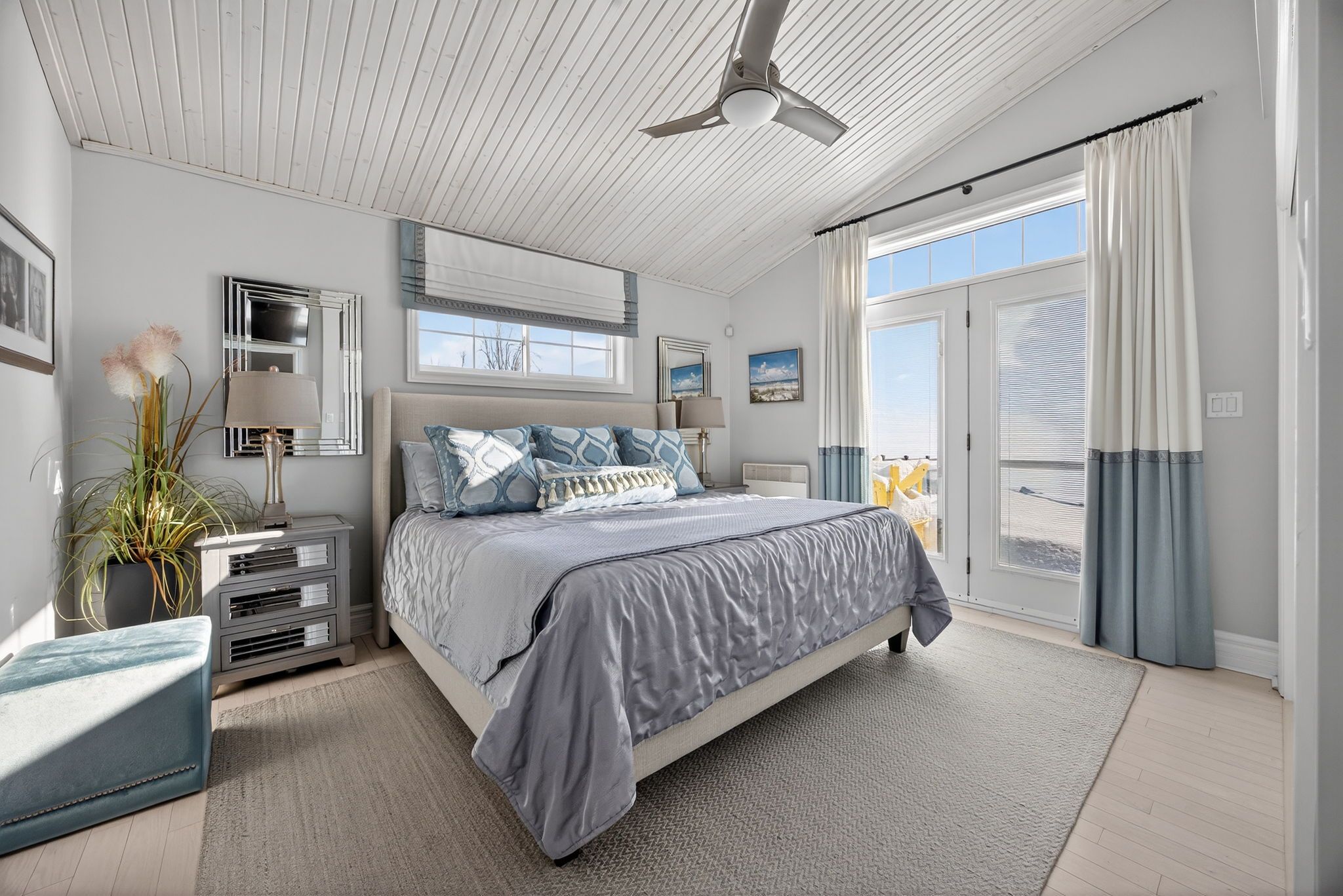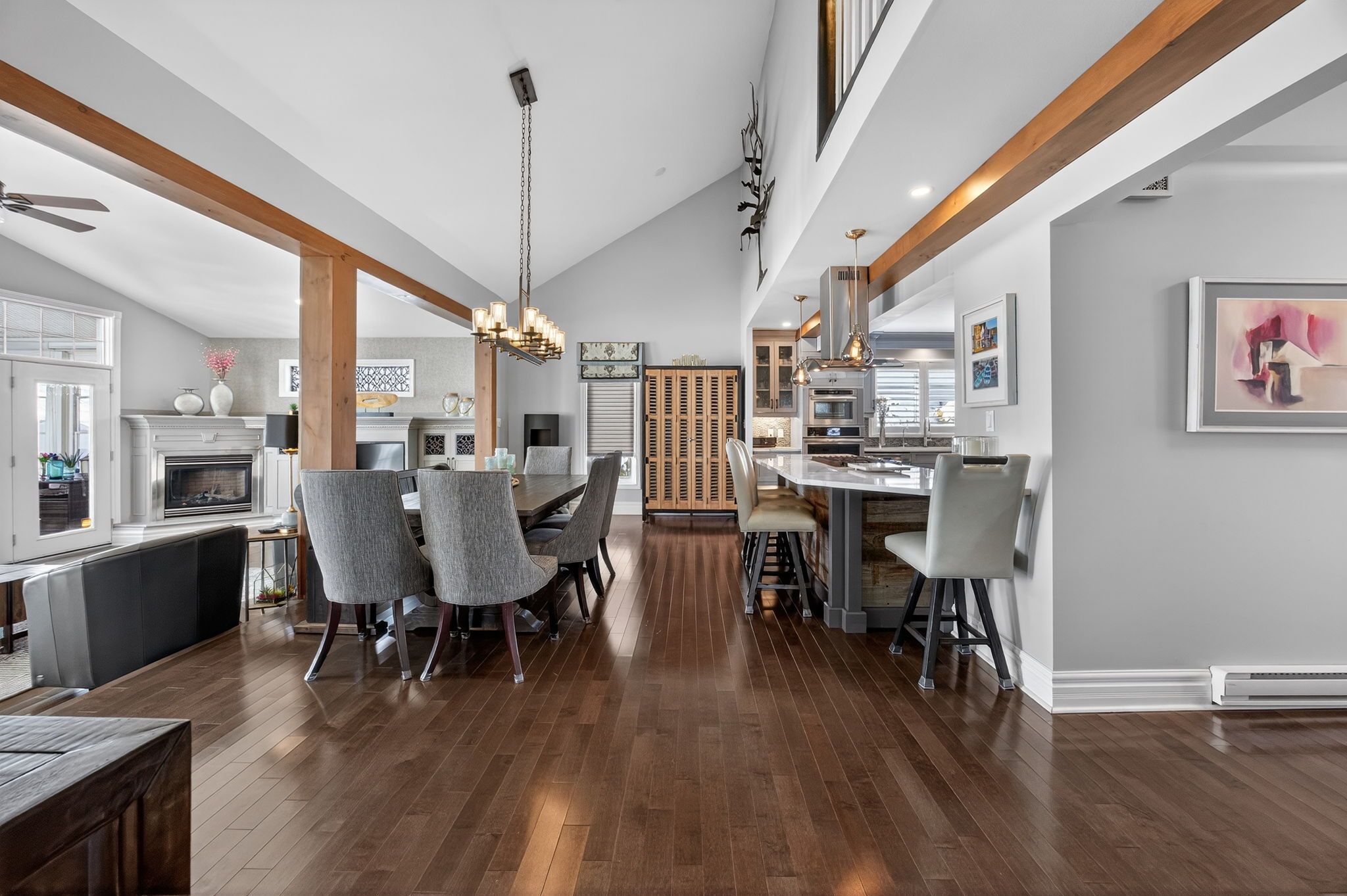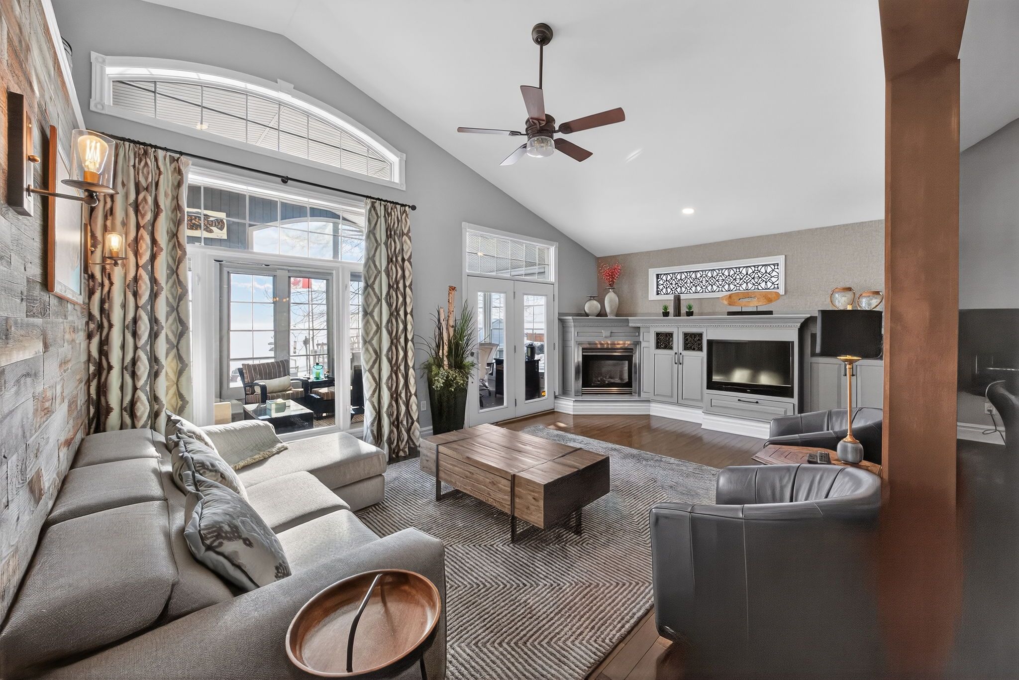 What a treat! Delightful home, meticulously cared for. Custom designed kitchen with top quality cambria counters. Jennair gas range, built in double oven and terrific breakfast bar (ideal for guests while entertaining & chef duties are happening)... That makes me think of the handy wine fridge.! Spacious dining area, suitable for large table & vaulted ceiling adds drama... Flowing beautifully to the sunken living room, with built-in cabinets and cozy gas fireplace. All of this with gorgeous view of the sparkling sun on the water. (isn't that what lakefront living is all about?) main floor primary bedroom offers convenient privacy and another amazing view of the lake... Along with a walkout to the deck and waterfront. The primary ensuite is awesome, heated floors, stand-alone tub, glass shower... Just so nice! Then the large walk-in closet is perfectly positioned and well suited to handle your wardrobe. The main floor laundry and garage entrance make for handy access and convenience. Walk up the hardwood stairs, across the loft view over the great living areas and find a private bedroom area, with it's own 4pc ensuite (heated floors, no less). The waterfront is easy access, gently sloping with a terrific dock system (composite surface) approx 60ft long. Now, you can't miss the gracious size and high ceiling in the amazing sun room (very adjustable windows & screens) which can extend your enjoyment so much of the year. The vieto radiant heaters and custom blinds ensure you have all the comfort options you can imagine. All year long you can surely relax in the jacuzzi hot tub, and there are 2 separate gas line hook-ups for bbq etc. Worry free is a good thing, hence the full home generac generator is standing by at your service to ensure no interruptions... Even during that dinner party, or waterfront gathering. Nice!