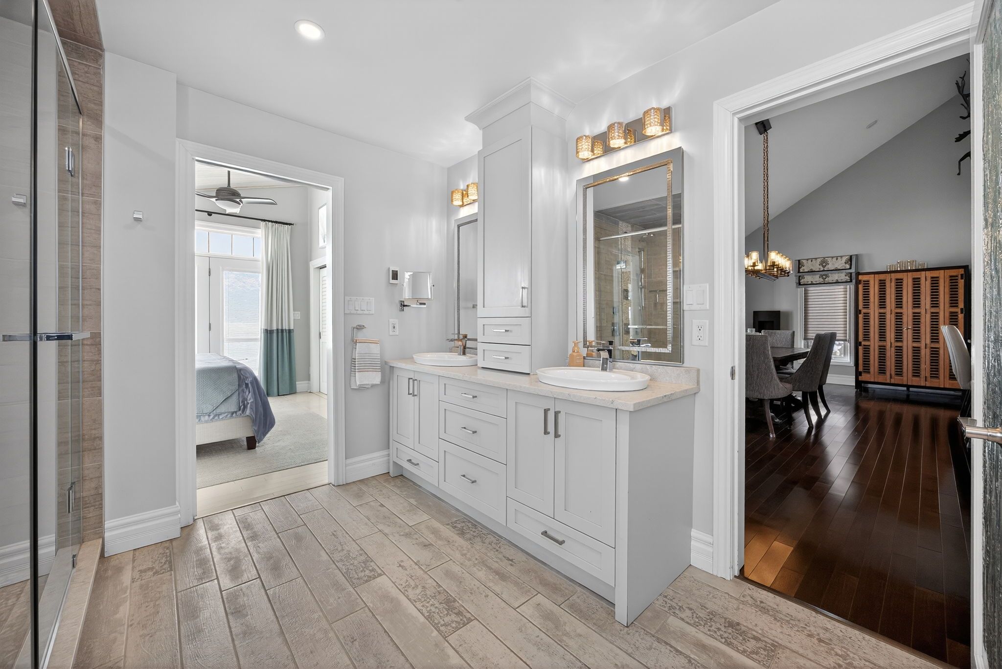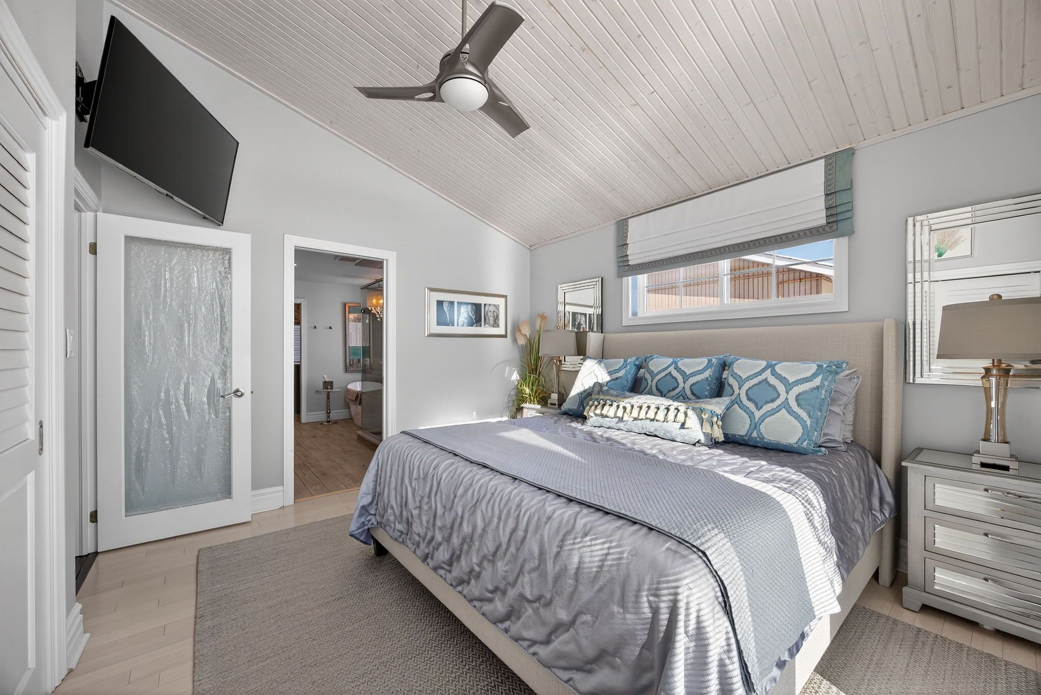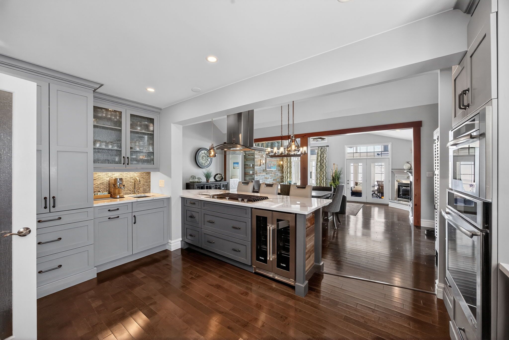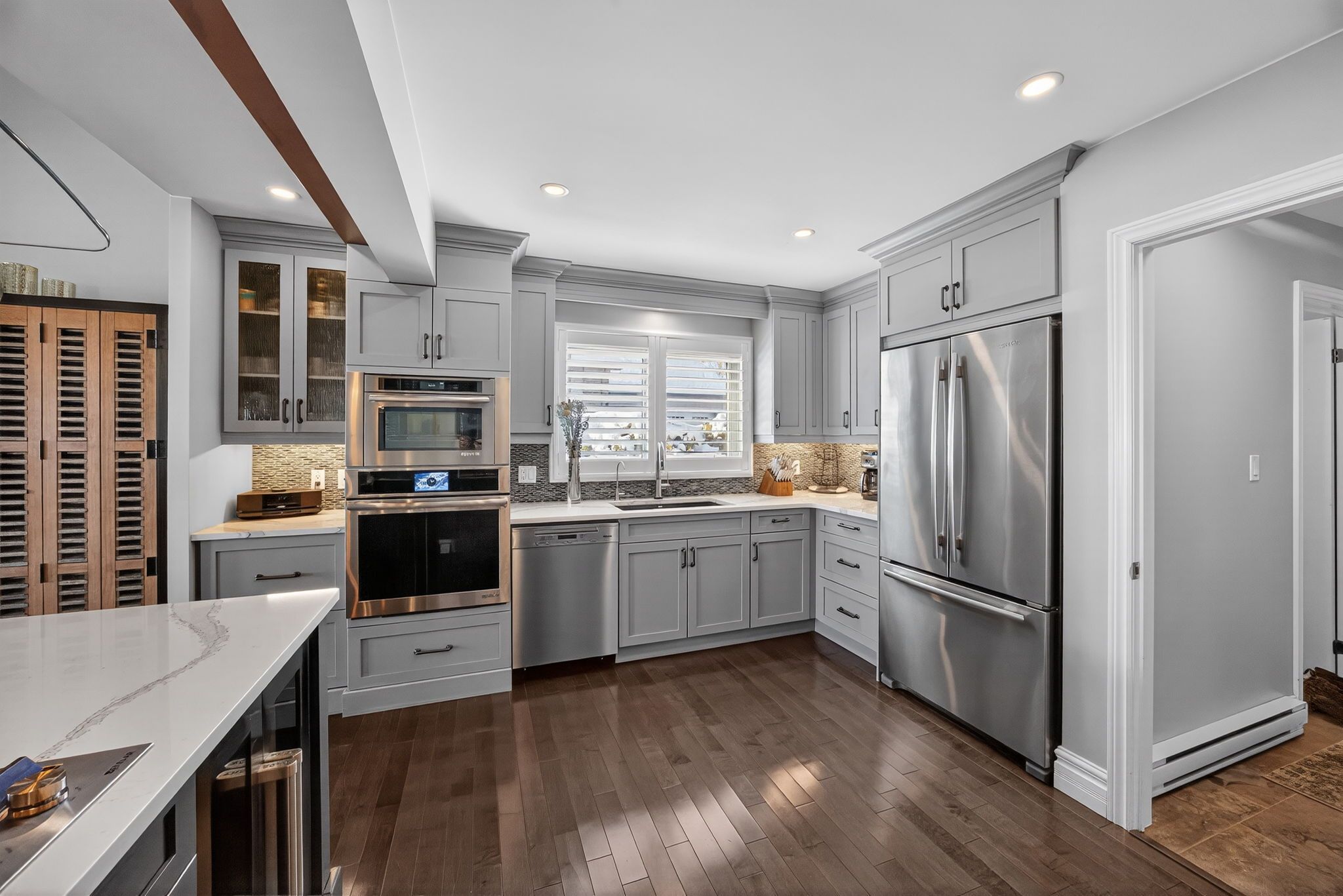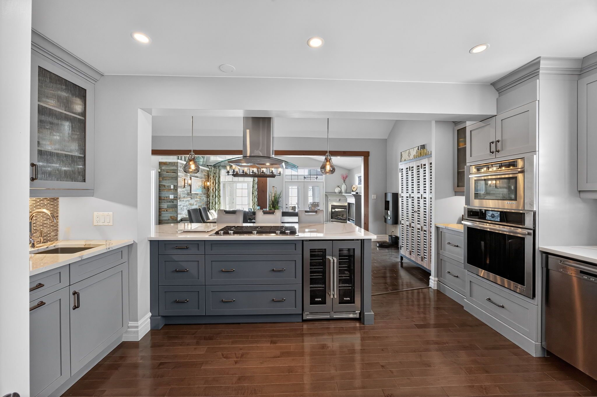 What a treat! Delightful home, meticulously cared for. Custom designed kitchen with top quality cambria counters. Jennair gas range, built in double oven and terrific breakfast bar (ideal for guests while entertaining & chef duties are happening)... That makes me think of the handy wine fridge.! Spacious dining area, suitable for large table & vaulted ceiling adds drama... Flowing beautifully to the sunken living room, with built-in cabinets and cozy gas fireplace. All of this with gorgeous view of the sparkling sun on the water. (isn't that what lakefront living is all about?) main floor primary bedroom offers convenient privacy and another amazing view of the lake... Along with a walkout to the deck and waterfront. The primary ensuite is awesome, heated floors, stand-alone tub, glass shower... Just so nice! Then the large walk-in closet is perfectly positioned and well suited to handle your wardrobe. The main floor laundry and garage entrance make for handy access and convenience. Walk up the hardwood stairs, across the loft view over the great living areas and find a private bedroom area, with it's own 4pc ensuite (heated floors, no less). The waterfront is easy access, gently sloping with a terrific dock system (composite surface) approx 60ft long. Now, you can't miss the gracious size and high ceiling in the amazing sun room (very adjustable windows & screens) which can extend your enjoyment so much of the year. The vieto radiant heaters and custom blinds ensure you have all the comfort options you can imagine. All year long you can surely relax in the jacuzzi hot tub, and there are 2 separate gas line hook-ups for bbq etc. Worry free is a good thing, hence the full home generac generator is standing by at your service to ensure no interruptions... Even during that dinner party, or waterfront gathering. Nice!