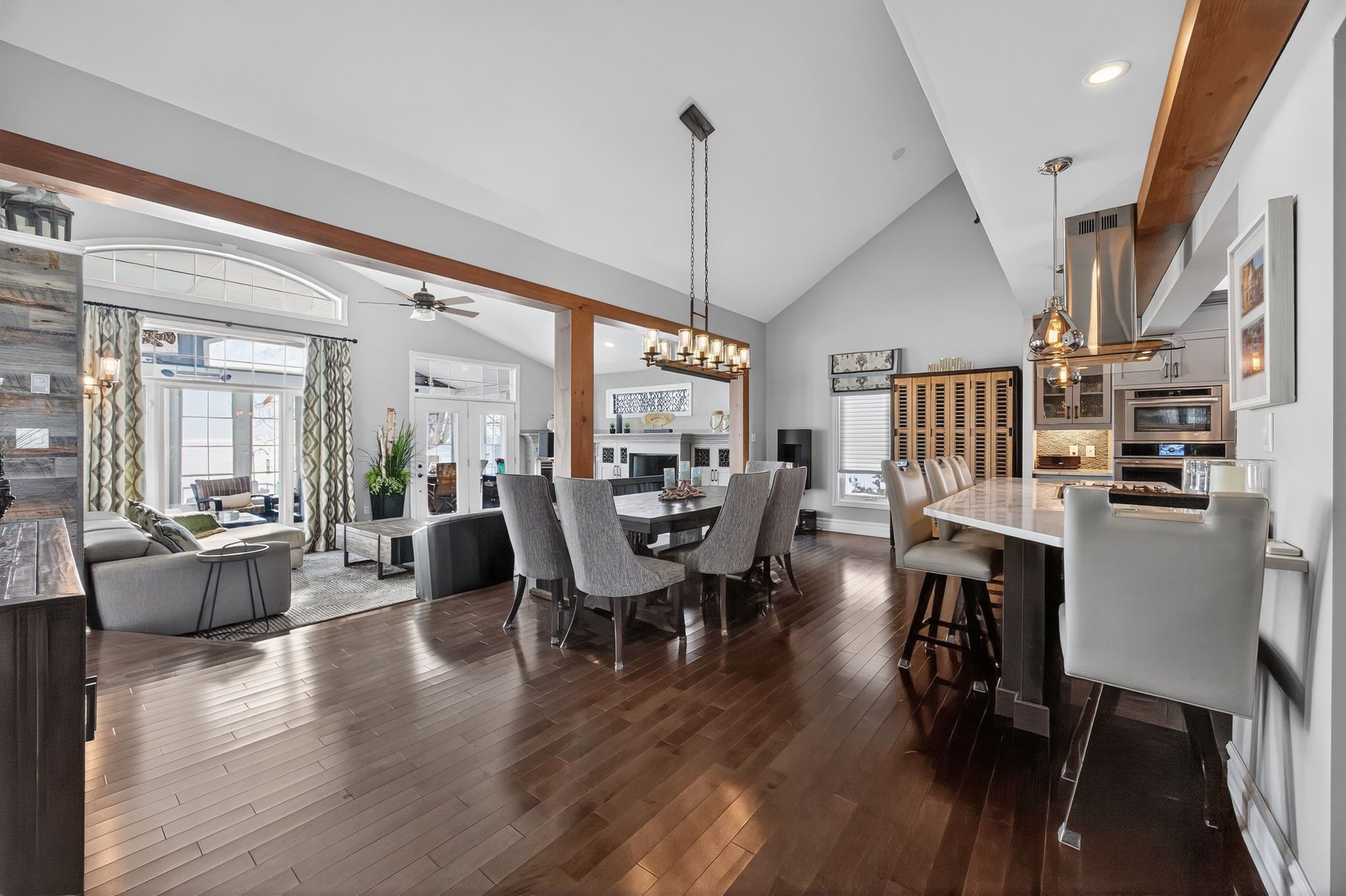 • Spacious dining area with vaulted ceiling, flowing into a cozy sunken living room.