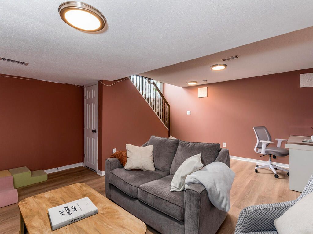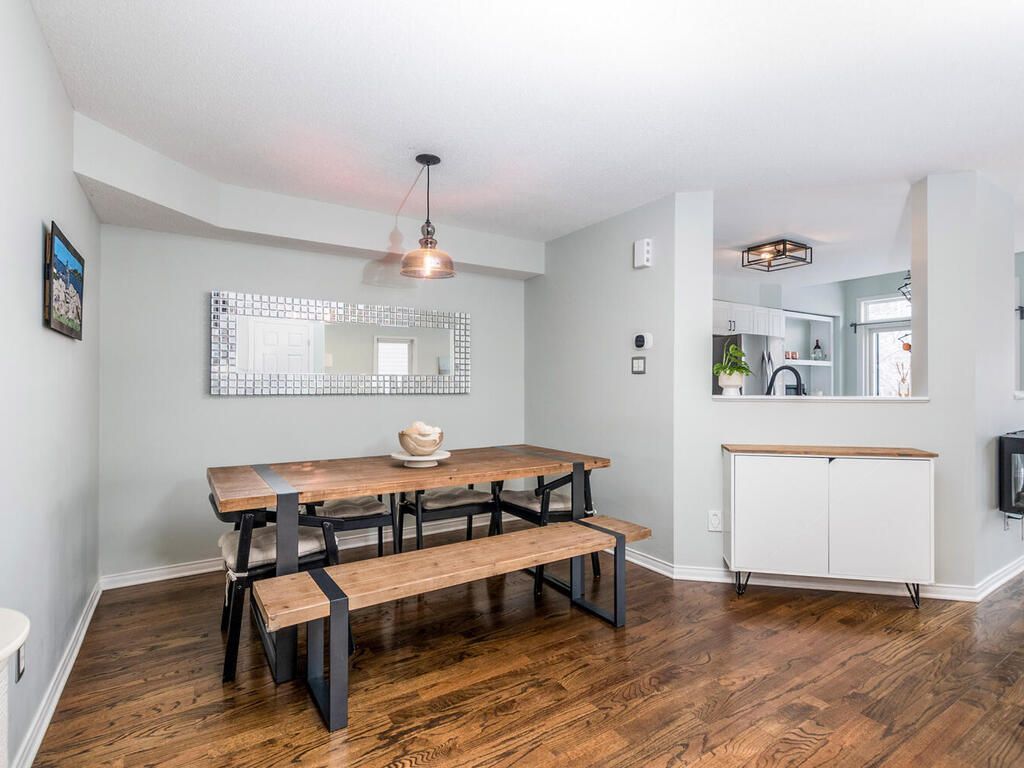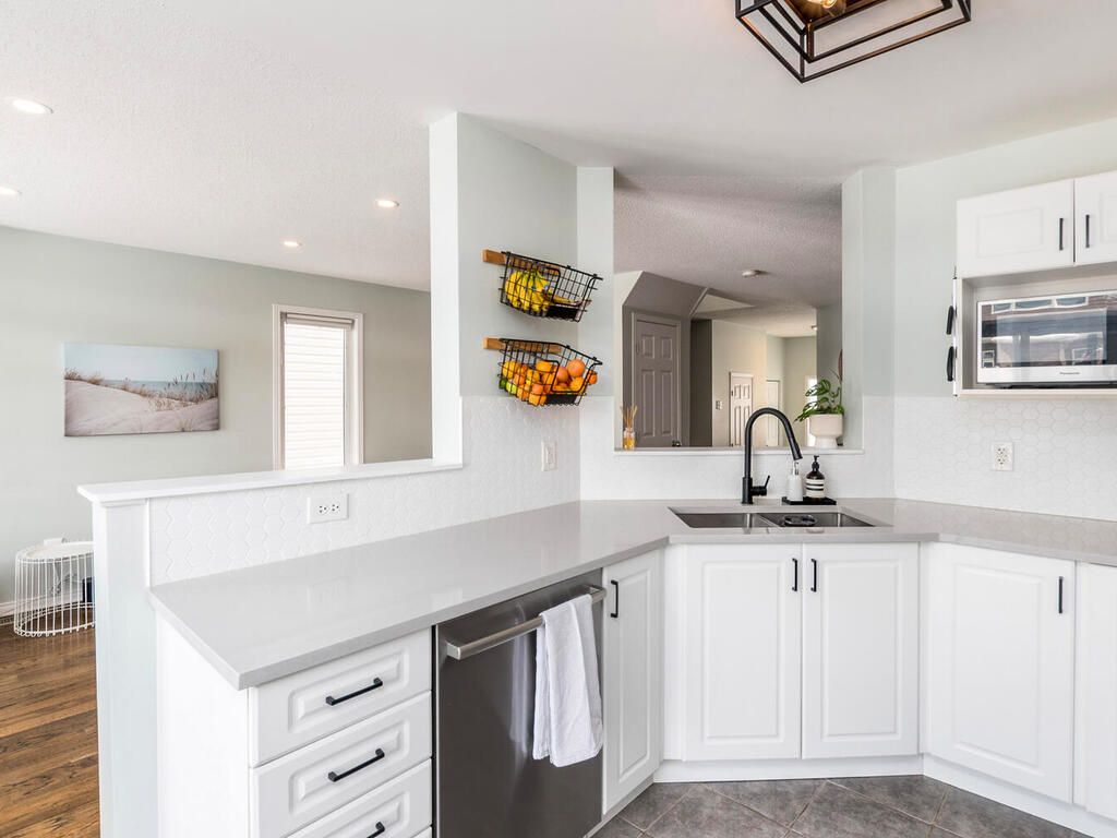 Gorgeous end-unit town with so many updates with-in last 5 years. Spacious tile foyer, with access to garage and 2-pc bath. Hardwood throughout main level, separate dining room with upgraded light fixture. Living room is very bright and spacious with electric wall fireplace, back wall is windows that allows for abundance of natural lighting. Open kitchen with eating area. Kitchen is bright white cabinetry including built-in pantry with shelving, new quartz countertops new backsplash and fixtures. Tile flooring. Also on main a walk-in pantry has been added under stairway, excellent use of space. Upper level has 3 large bedrooms and a new full luxurious bath complete with stand alone tub walk-in shower stunning finish. The master has a wall of closets and cathedral ceiling with new fixture.. The flooring has all been replace with luxury laminate on 2nd level. Lower level with new flooring is an ideal space for family time, also brightened by windows above. Furnace replace this year. Freshly painted throughout. 5 appliances includes new s/s fridge and hood fan. New fixtures throughout. Fenced yard with privacy trellis, patio has been enlarged and landscaping complete. Located in a most walkable area with walmart, superstore, parks and recreation and transportation at your door