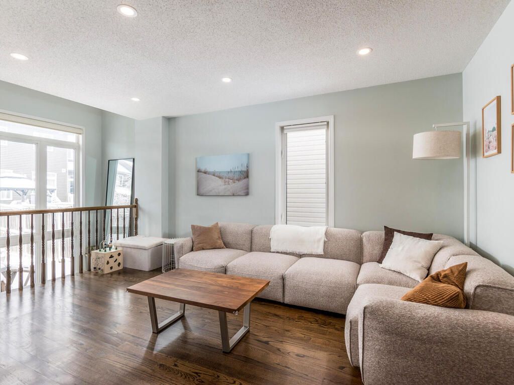• Bright living room features large windows and electric wall fireplace for ambiance.