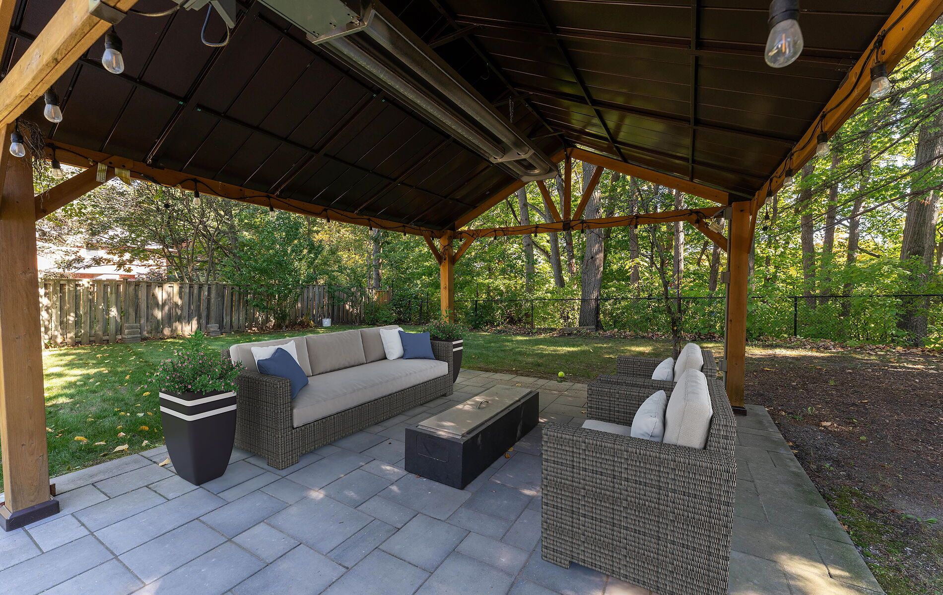 • Exclusive backyard cabana with heating and fireplace for year-round use.