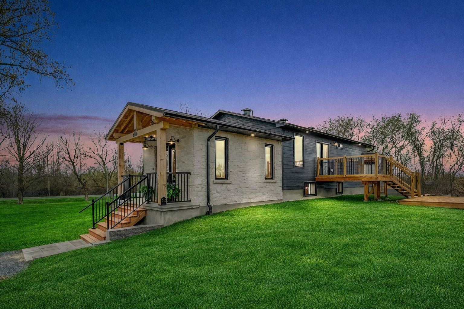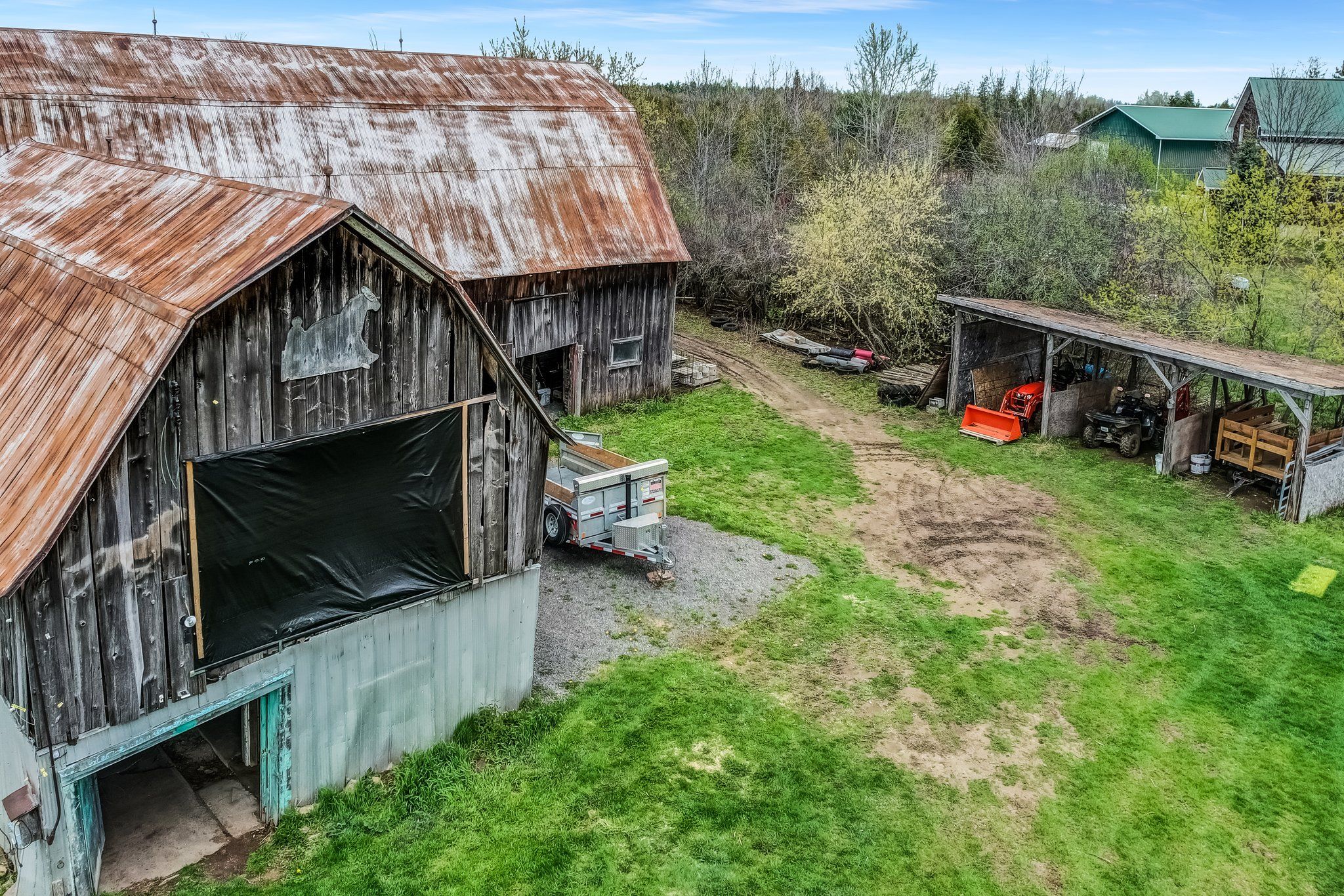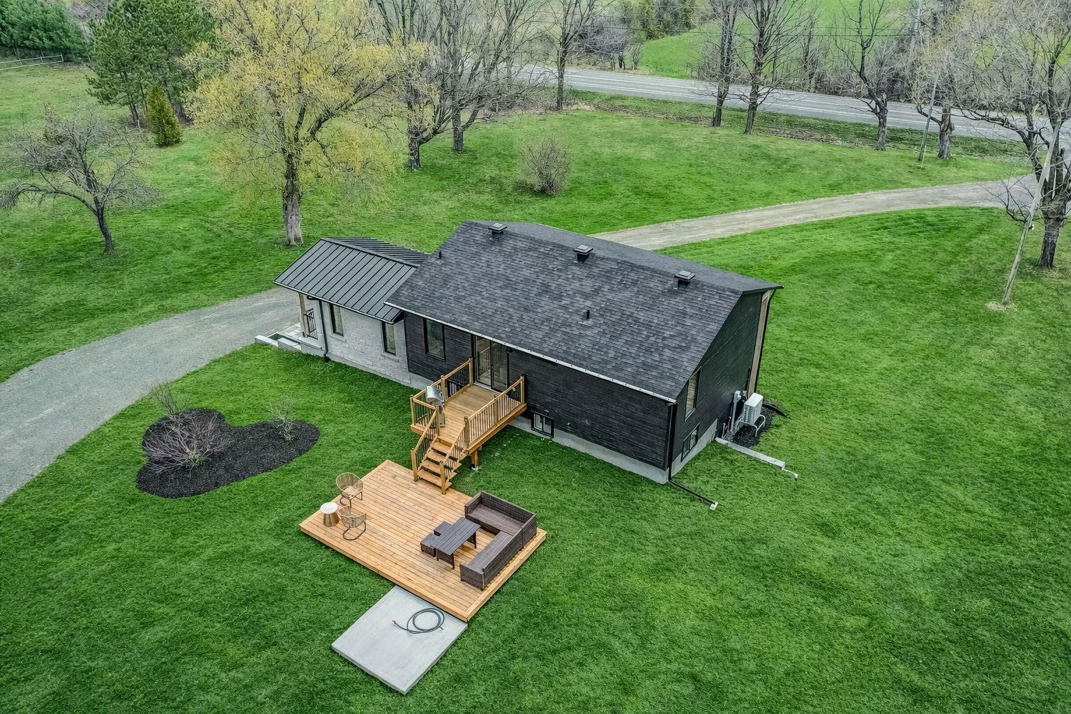 Set on 29 breathtaking acres, this extensively renovated and rebuilt home is a dream come true for hobby farm enthusiasts and families craving space to roam, explore, and play. The newly redesigned 2+1 bedroom home is filled with natural light, highlighted by sleek black-framed windows throughout. The upper level features a thoughtfully designed layout with a beautiful kitchen showcasing an oversized quartz island, café appliances, and custom finishes. The above ground lower level is a bright and inviting extension of the home, flooded with natural light from oversized above-grade windows. Feature walls and a built-in bar area add warmth and character, creating an inviting space for family gatherings and entertaining. Step outside to a large new back deck overlooking the expansive property, perfect for watching kids play, animals roam, or simply enjoying peaceful country sunsets. A custom-built fire pit sets the scene for cozy evenings after a day spent outdoors. The detached garage-originally the property's log home-offers a versatile space for workshops, equipment, or hobby projects. With sprawling acreage, established trails, and wide-open clearings, this property is ideal for hobby farming, 4-wheeling, snowmobiling, and outdoor adventures year-round. A newly added driveway leads to a private clearing, perfect for future barns, paddocks, or a second dwelling. The large barn provides excellent storage for equipment, toys, and tools, while winding paths lead through the forest to a charming pond at the back of the property-transforming into a picturesque skating rink in the winter. Mature sugar maple trees along the road offer privacy and stunning curb appeal, completing this rare opportunity to own a property where family memories, outdoor fun, and country living come together beautifully. 24 hr irrevocable on offers.