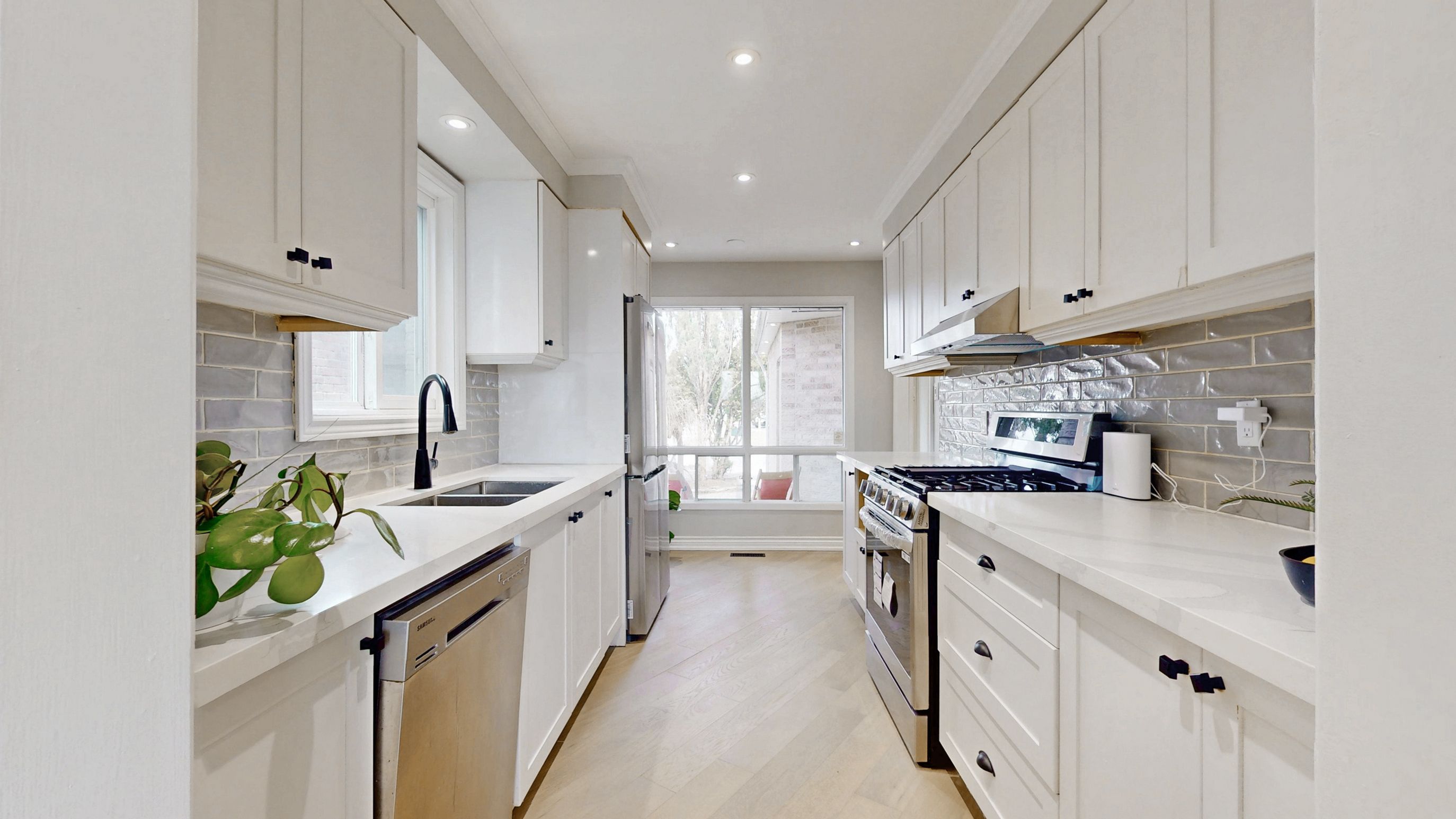 • Modern kitchen features stainless steel appliances and ample cabinet space.