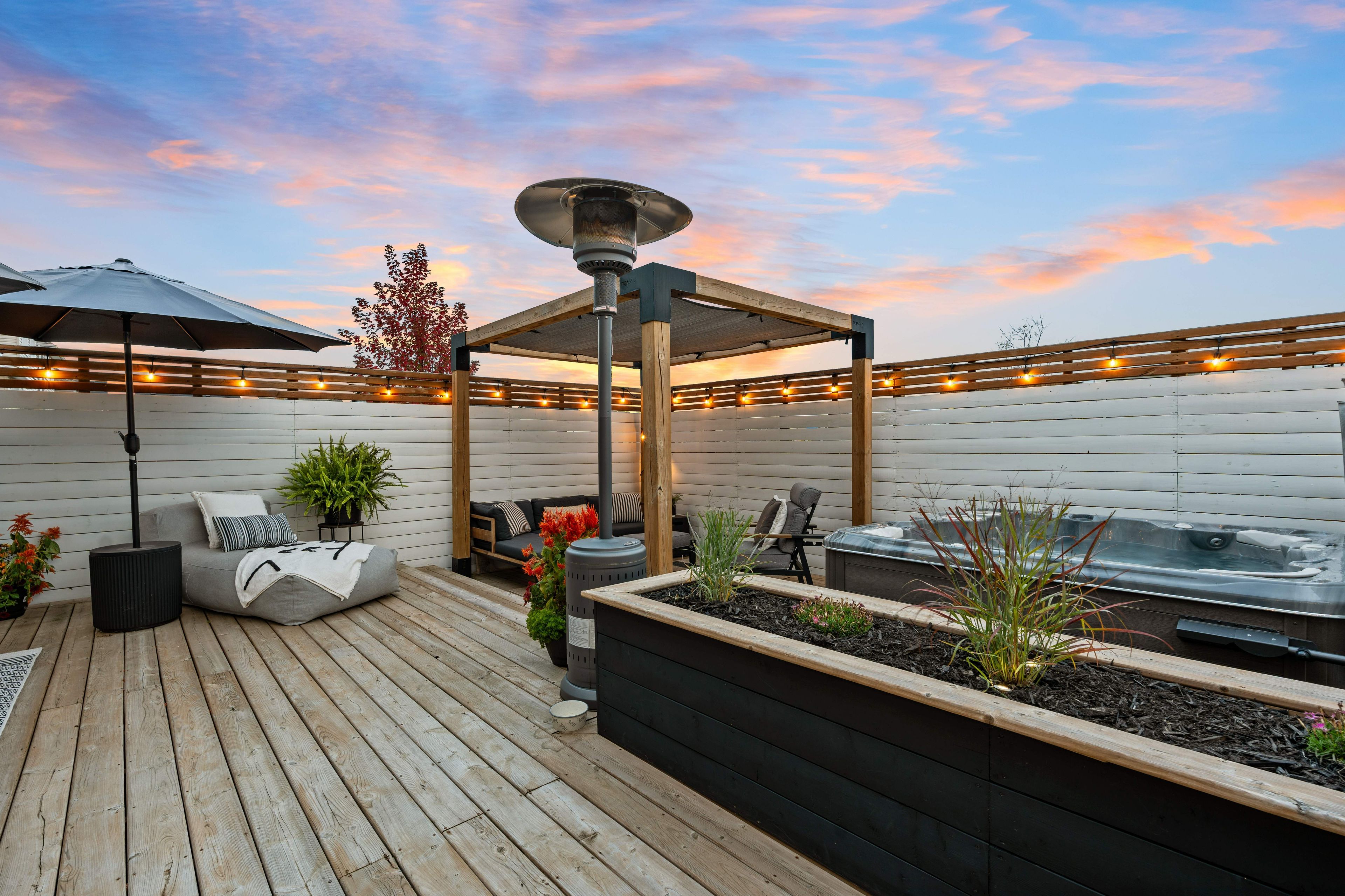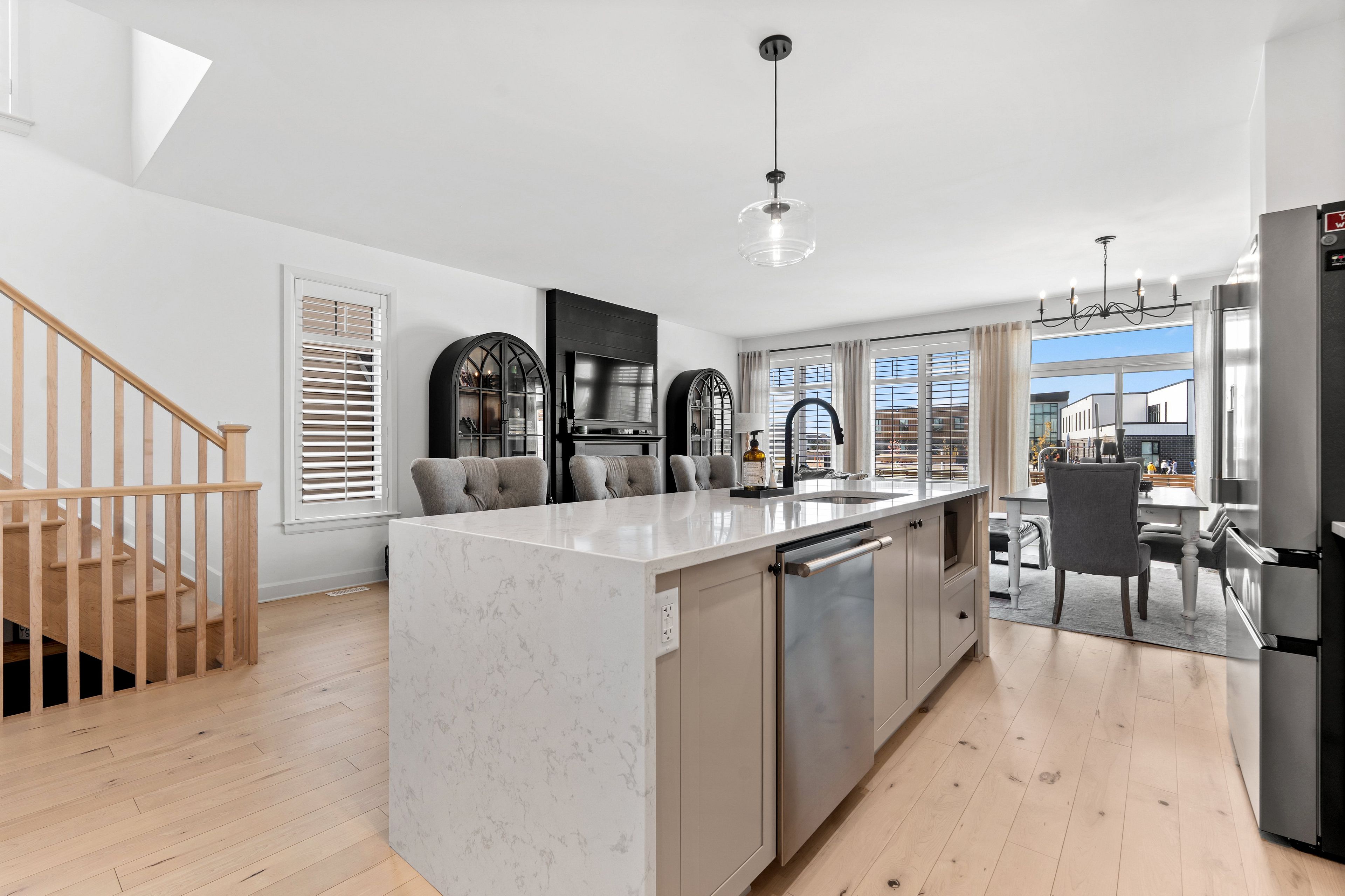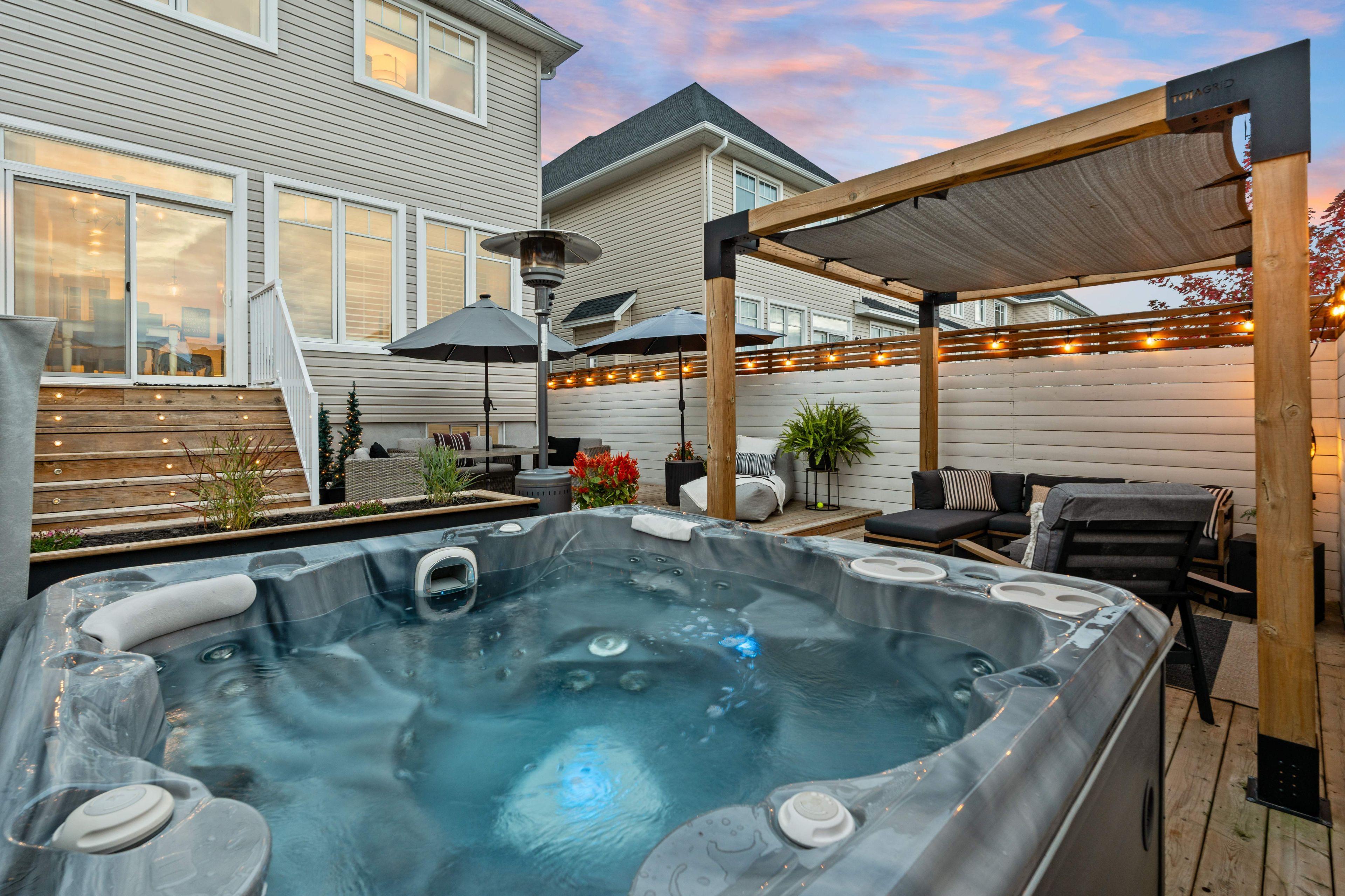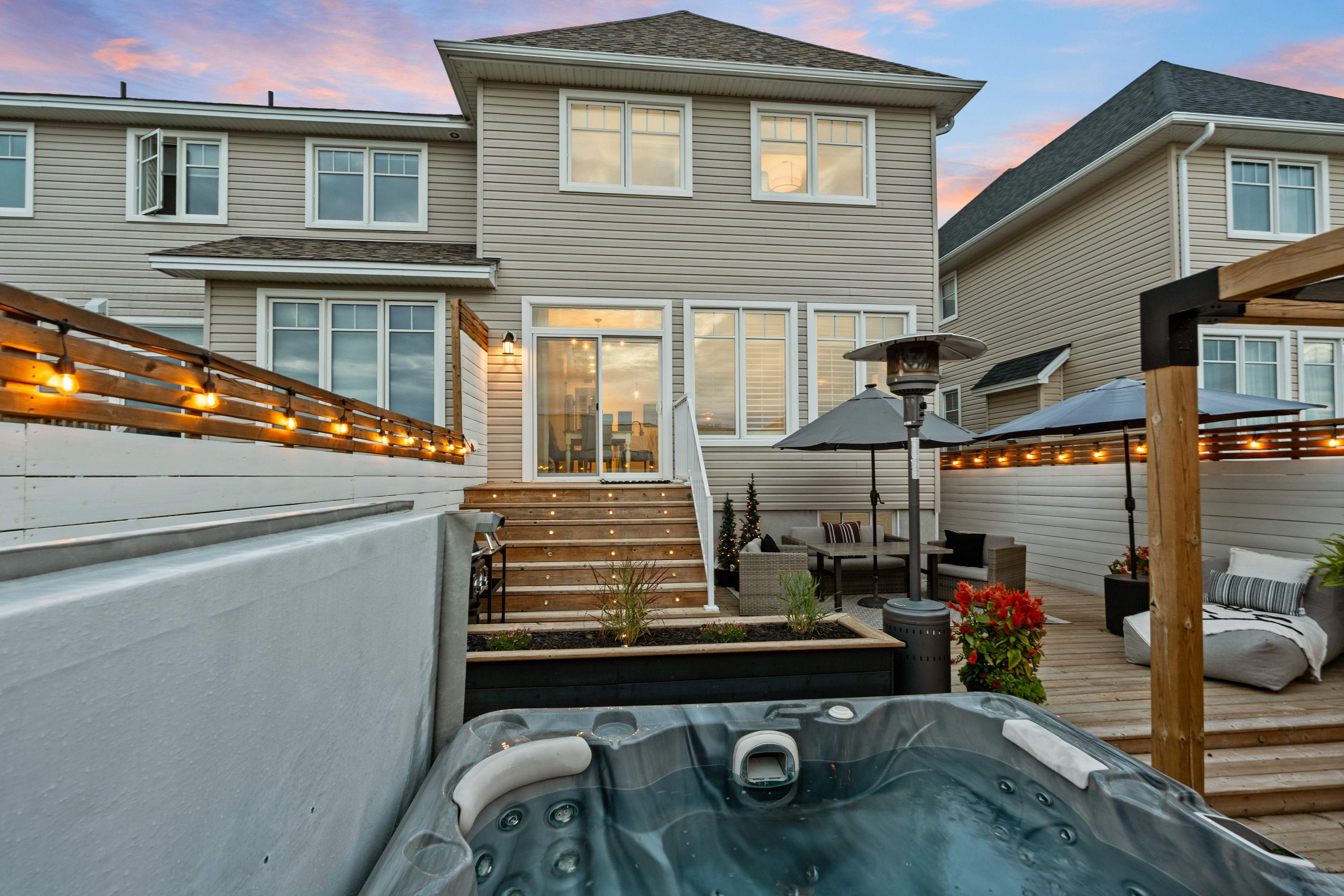 This premium tamarack residence sits on a standout, fully landscaped lot with patio stone, a custom walkway, and manicured gardens that create an inviting entrance. The backyard is a private retreat with a relaxation hot tub, professional turf for low maintenance, illuminated steps, a raised flower garden, a full fence, and an expansive deck with zones for lounging, dining, entertaining, and storage. With the property backing onto st. Genevieve catholic school and a new park and walking paths coming soon, this west-end location delivers long-term convenience and family-friendly appeal. Inside, the home showcases quality craftsmanship and a bright, open main level with maple cabinetry, a custom coffee bar and pantry, quartz countertops, a waterfall island, professional stainless steel appliances, california shutters, and a warm gas fireplace. A beautifully crafted staircase, custom cabinetry, refined finishes, and a stylish powder room elevate the space. The lower level offers a cozy, flexible area for a movie lounge, music space, or children's playroom, plus a rough-in for a future fourth bathroom. Upstairs, the large primary suite features a king-sized layout, walk-in closet, and spa-style ensuite with a soaker tub. A well-designed upper-level laundry room includes quartz counters, a wash sink, cabinets, a folding station, and electrolux appliances. Two additional bedrooms and a four-piece bath complete this level. With 2,200 sq. Ft. Of finished living space, upgraded lighting, an extended driveway, full eavestrough system, celebright exterior lighting, and ev-ready wiring in the garage, this executive townhome blends upscale finishes with modern functionality. A must-see opportunity.